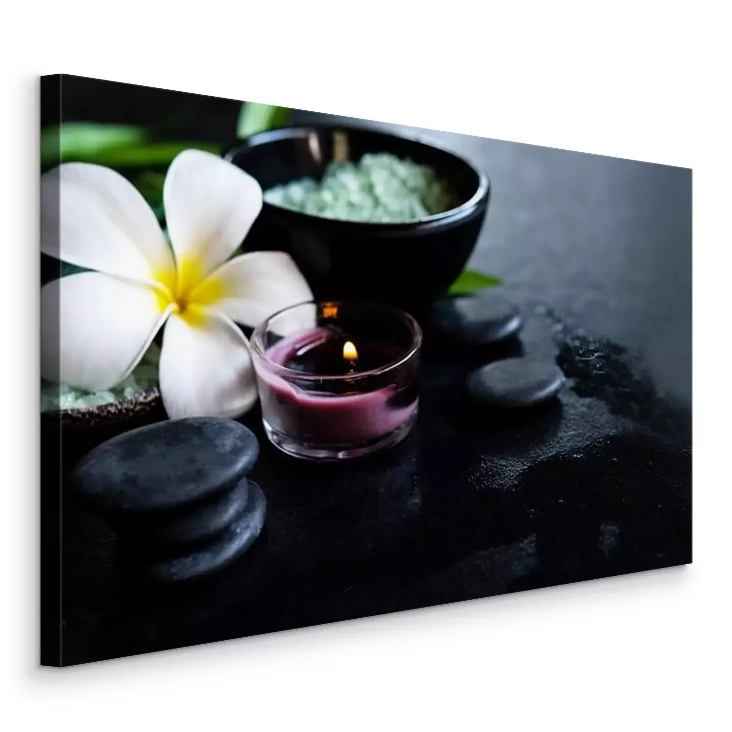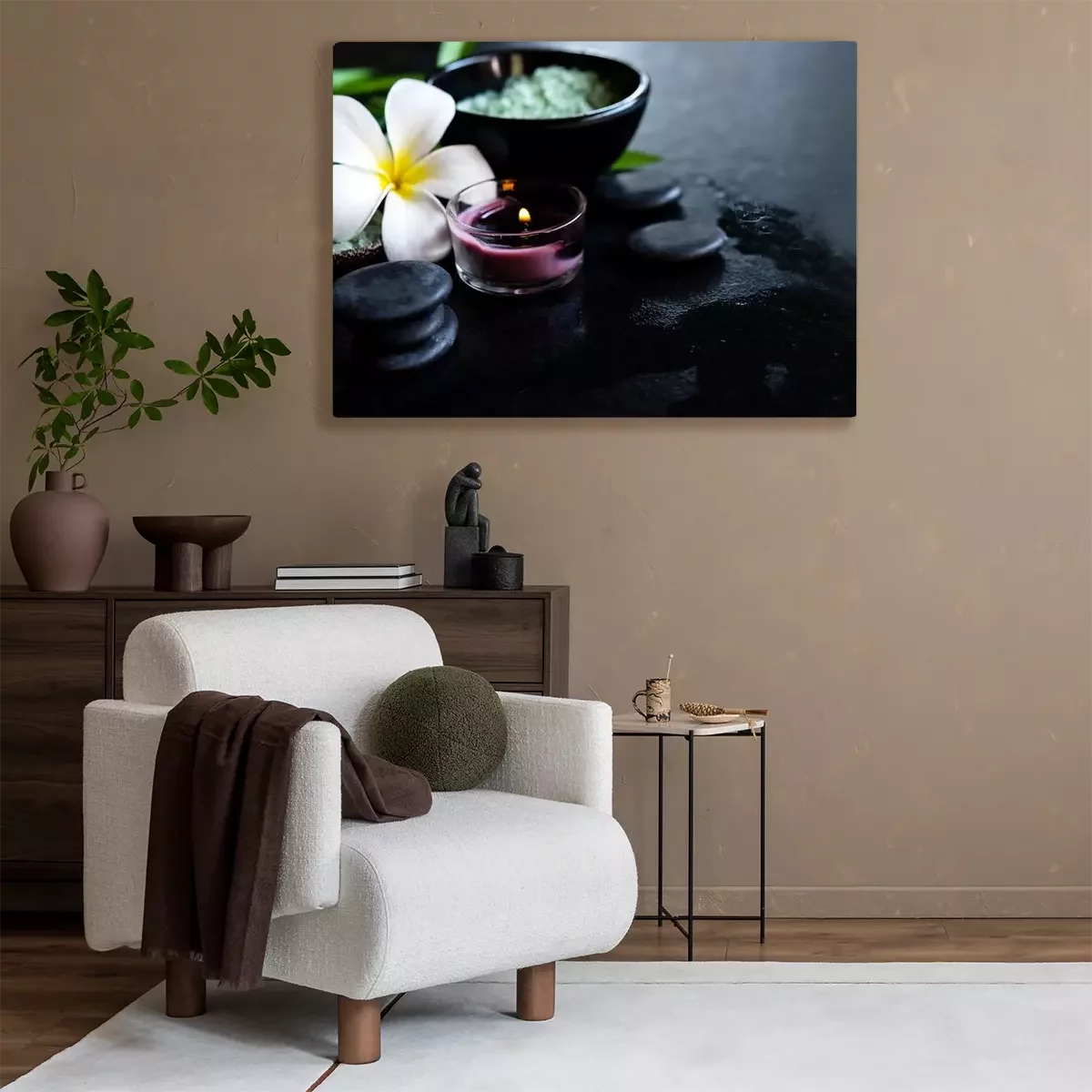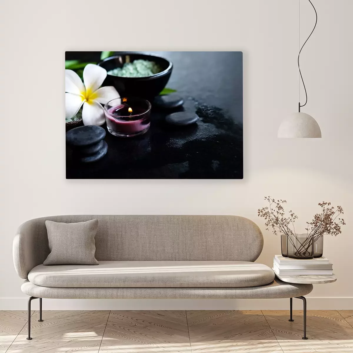 Canvas: Thai Spa. Top view of white Plumeria flower setting for massage treatment and relax on concrete blackboard with copy space. Green leaf with black stones pile for spa therapy. Healthy Concept.