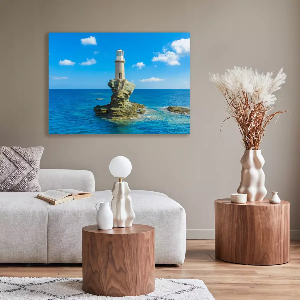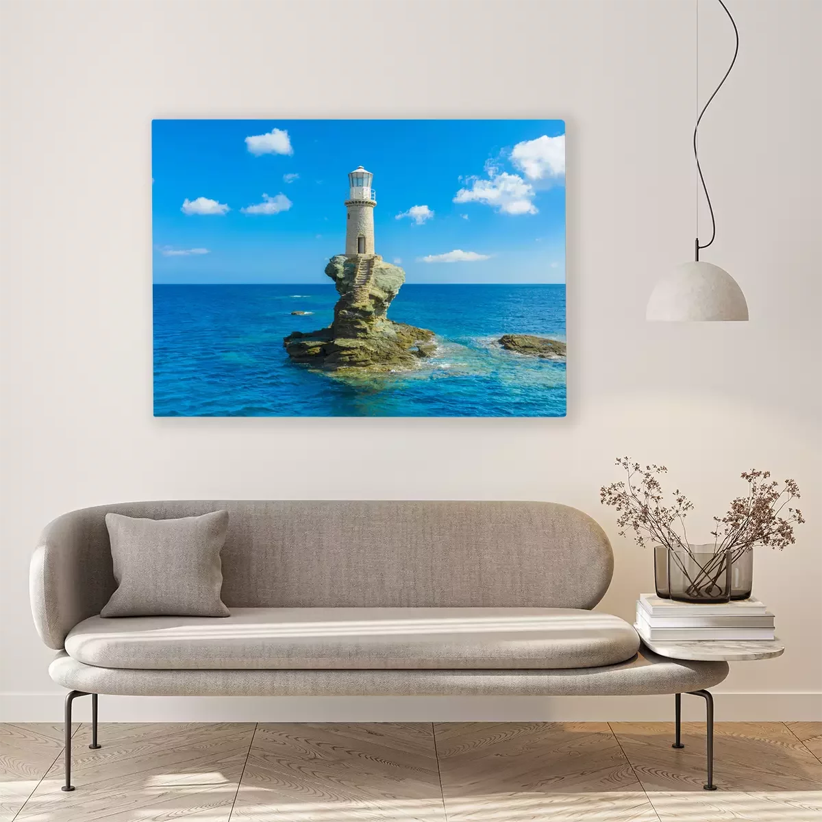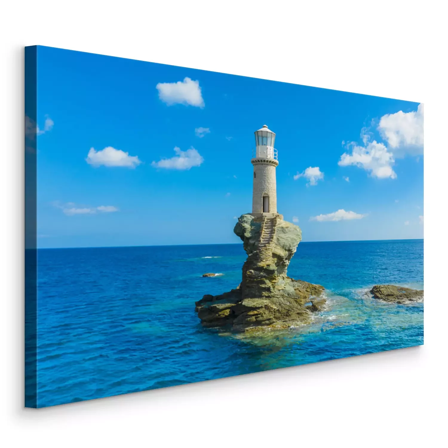Canvas: The beautiful Lighthouse Tourlitis of Chora in Andros island and a seagull, Cyclades, Greece