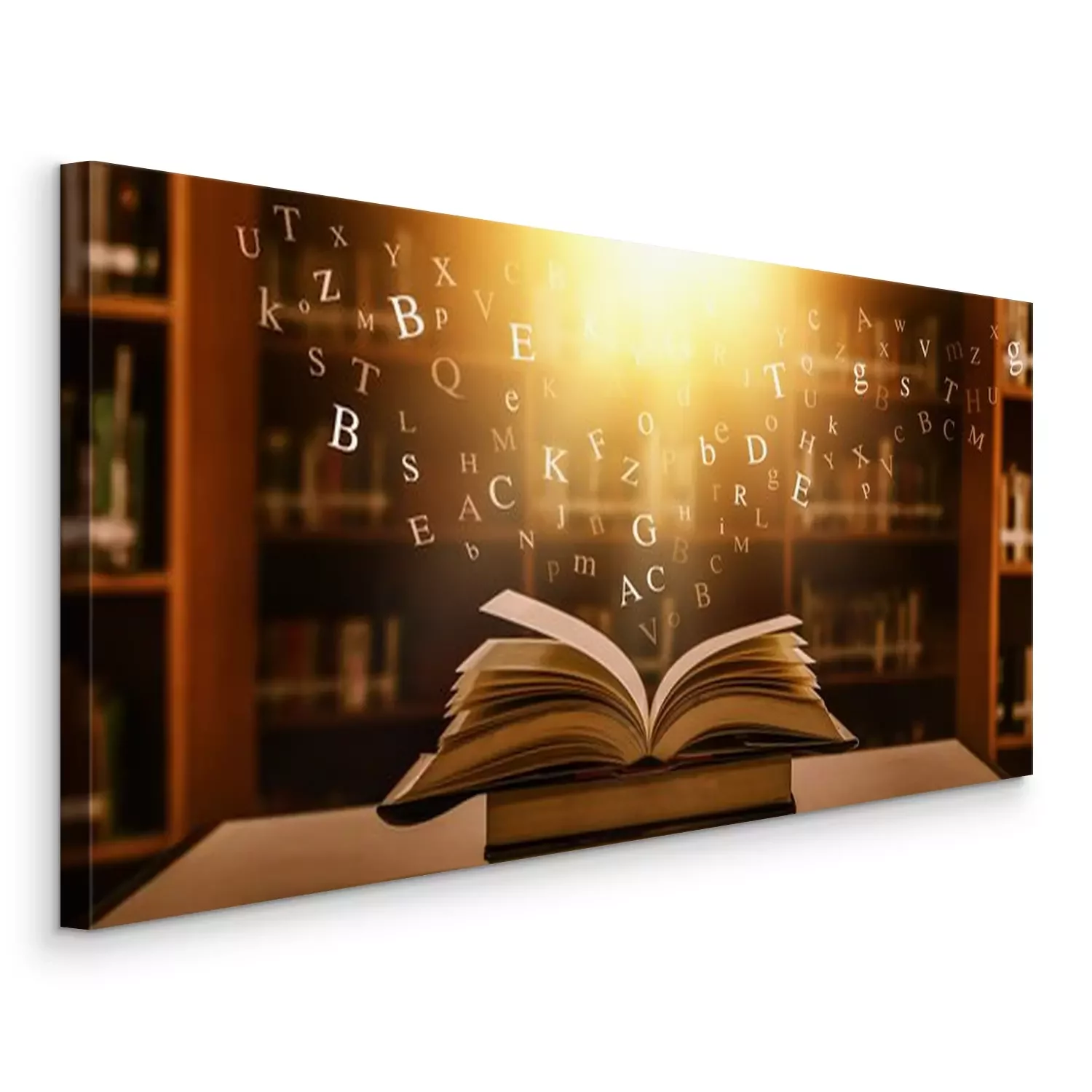 Canvas: The concept of education by planting a tree of knowledge in the opening of an old book in the library and the magical magic of light that flies to the destination of success. Beautiful background
