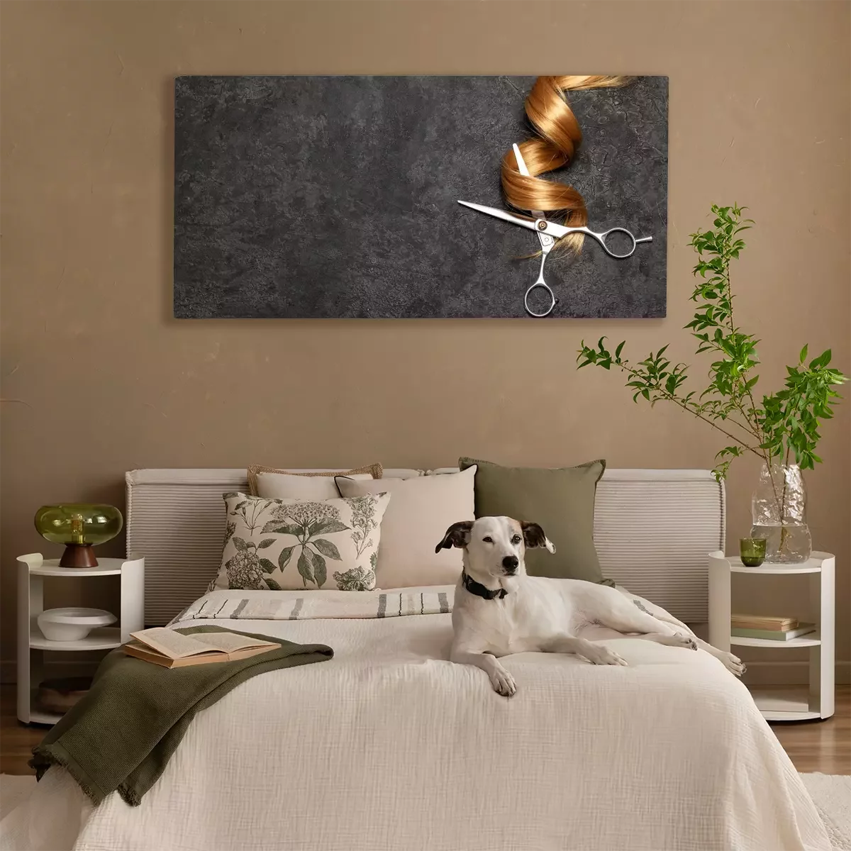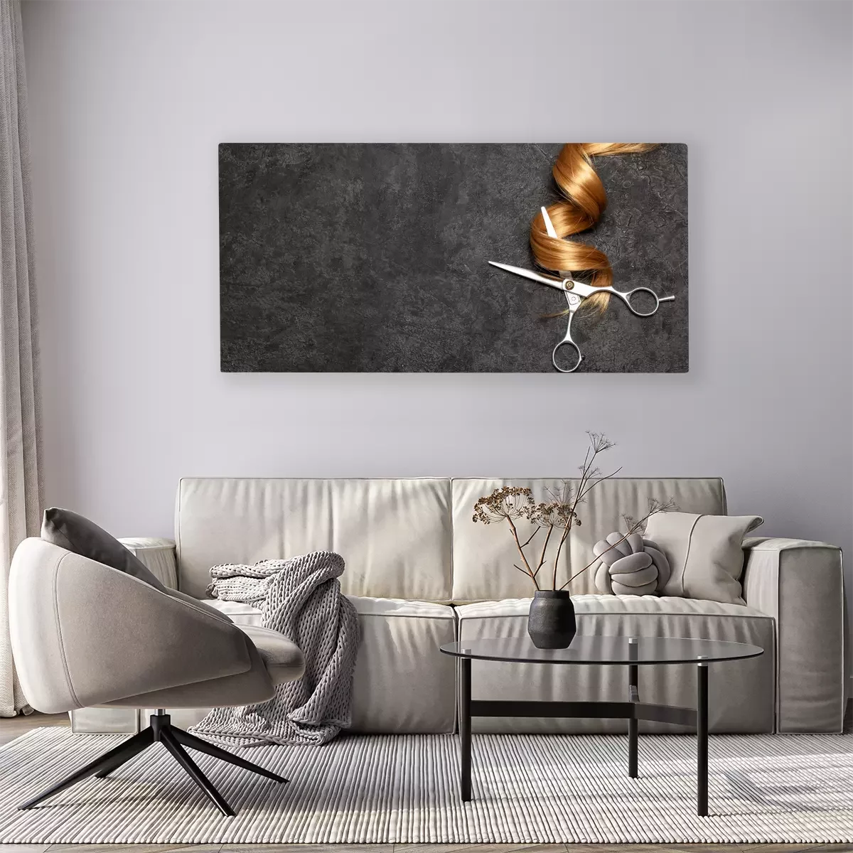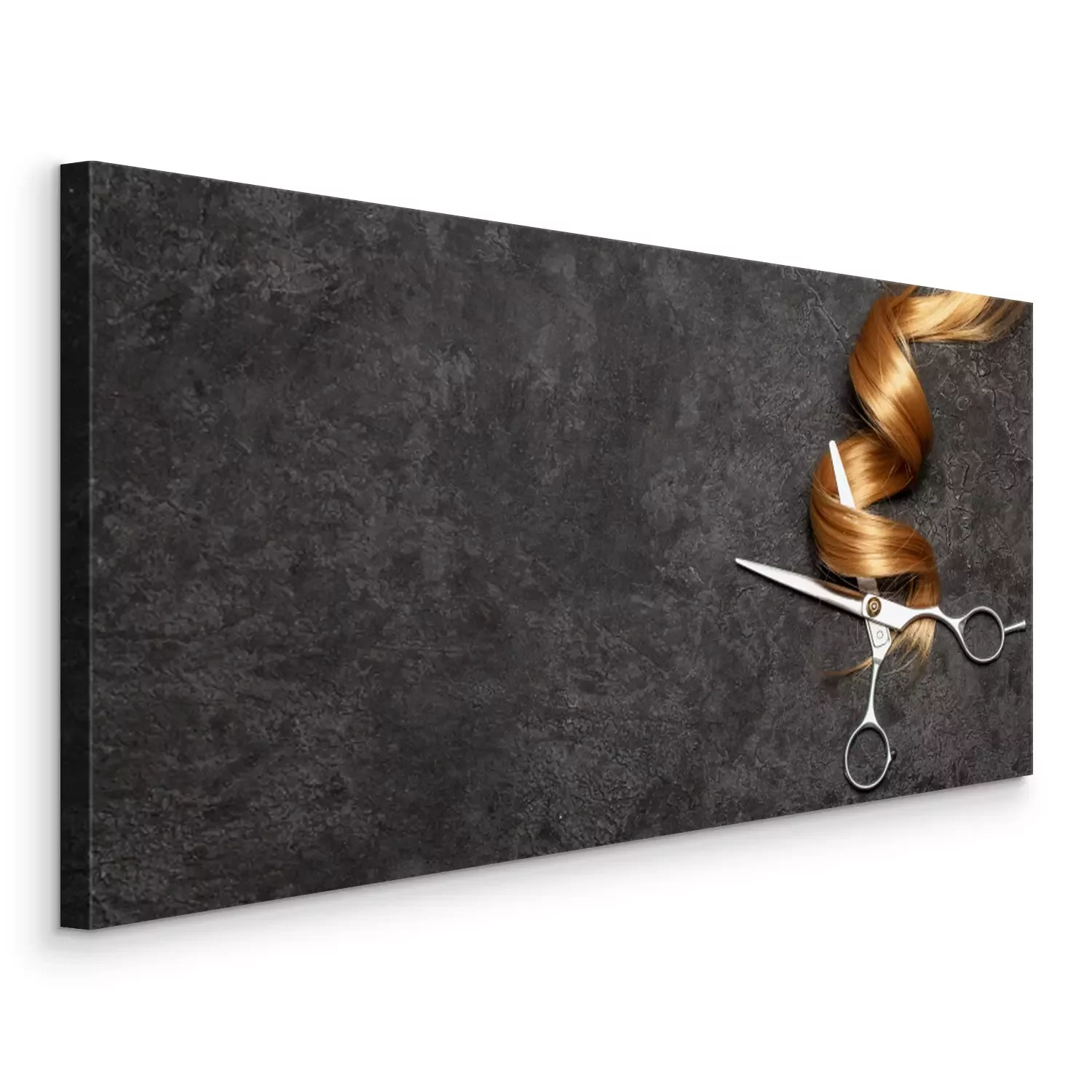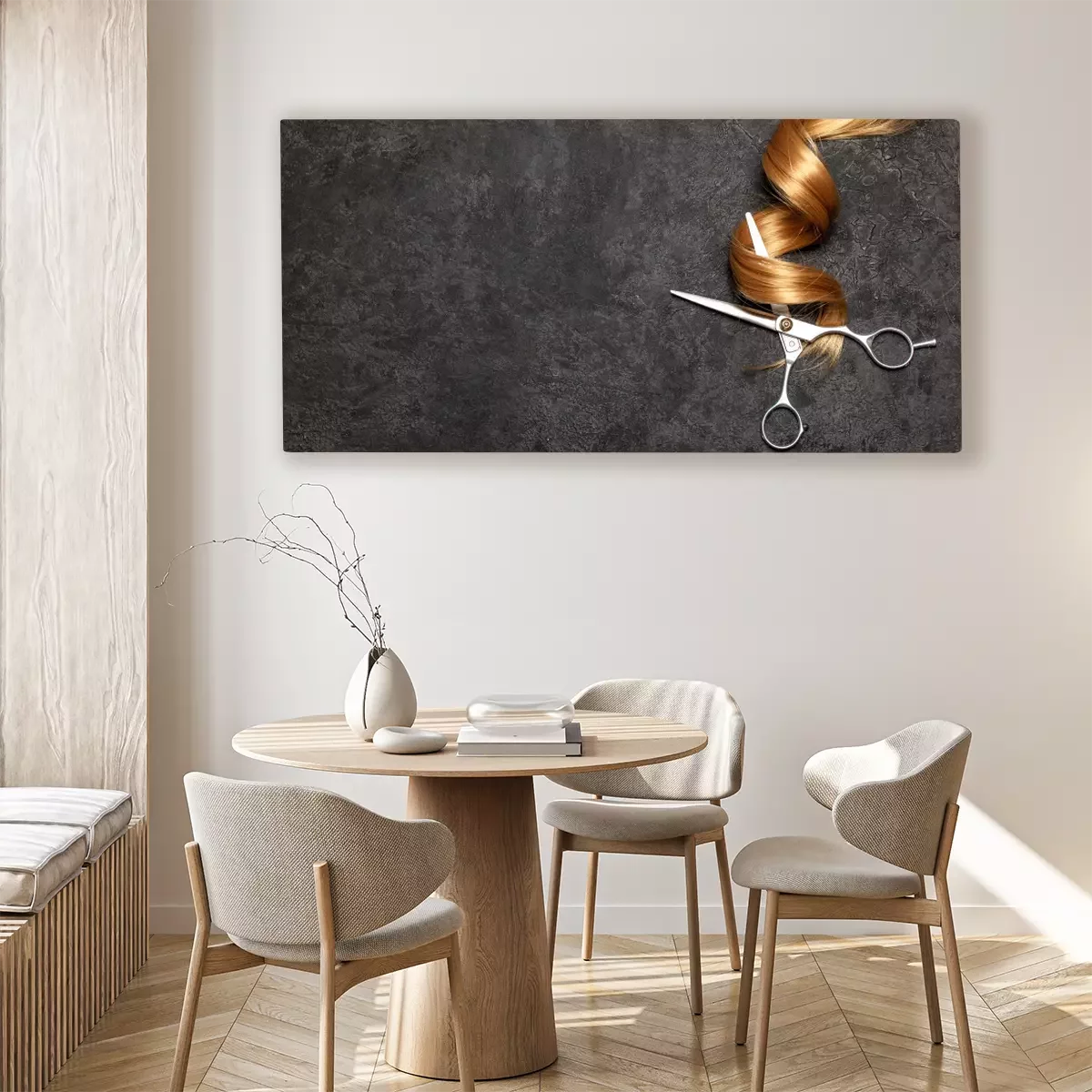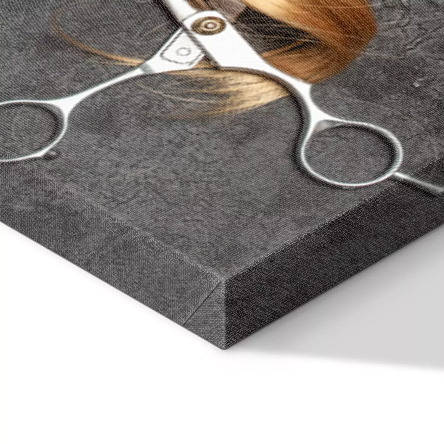 Canvas: The hairdresser. Scissors and curl of hair on a black background