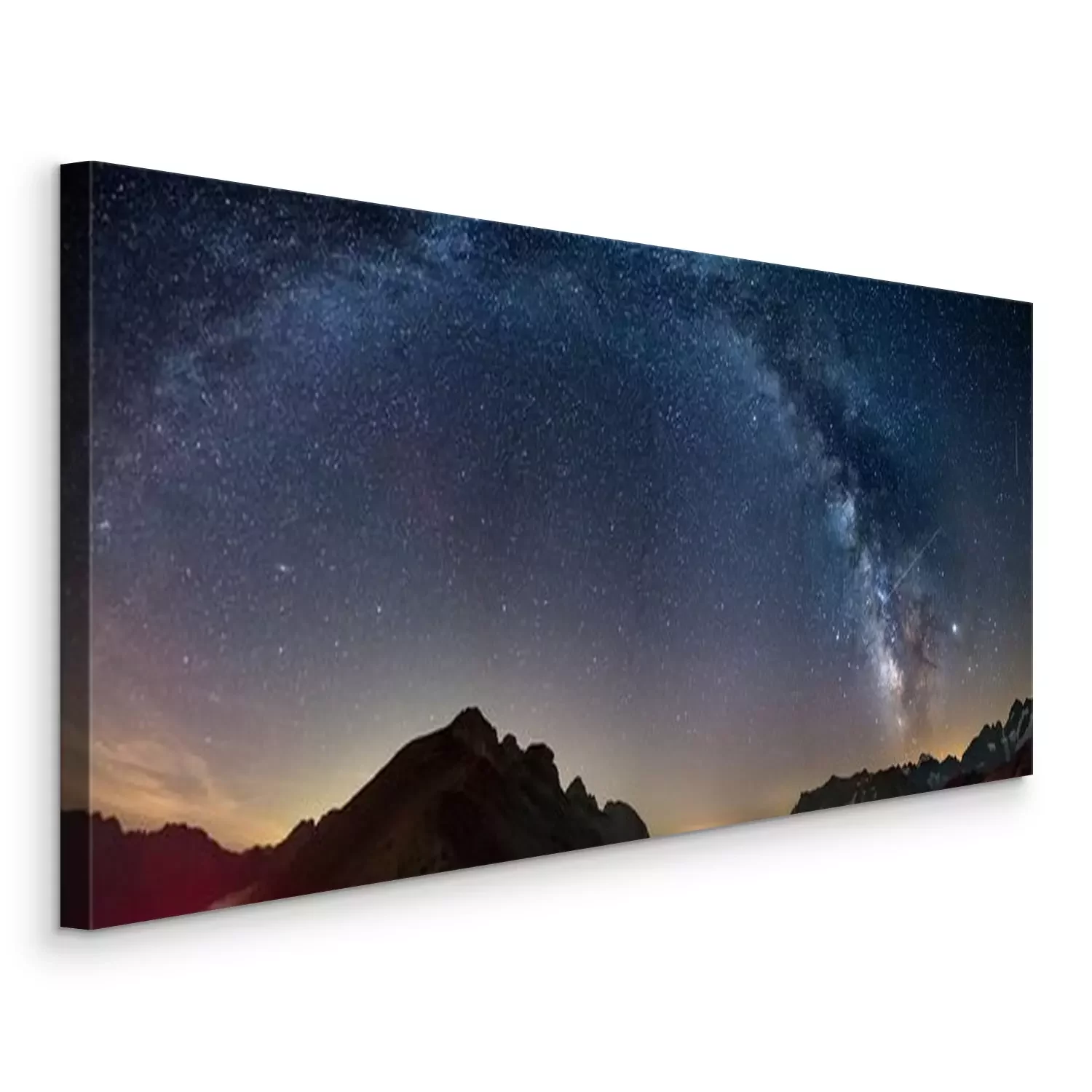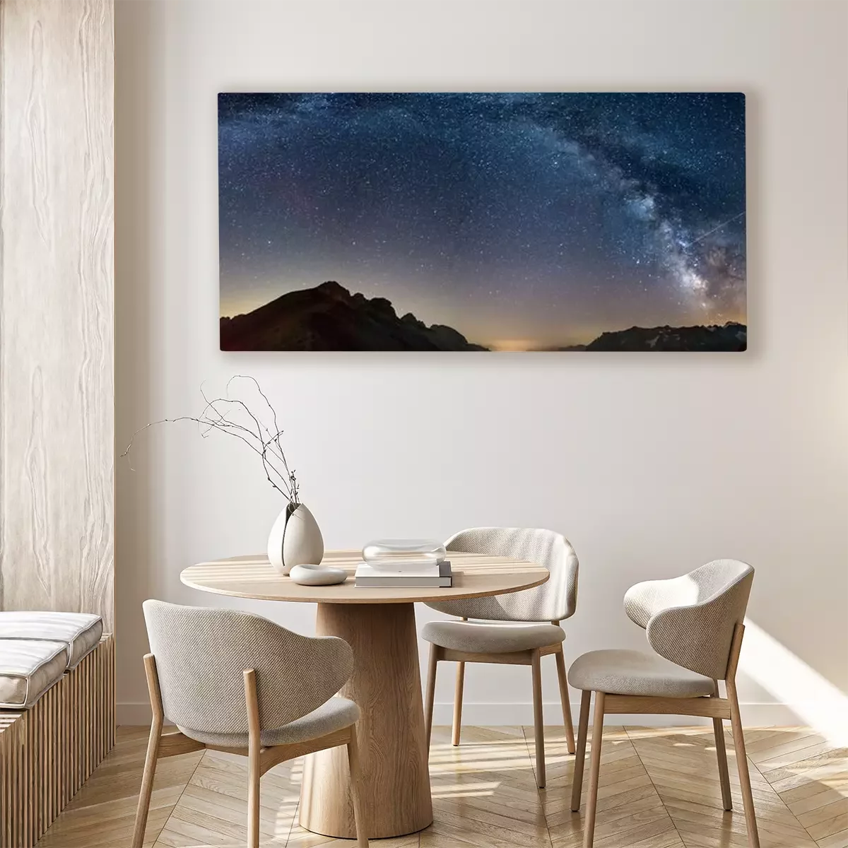 Canvas: The Milky Way arch starry sky on the Alps, Massif des Ecrins, Briancon Serre Chevalier ski resort, France. Panoramic view high mountain range and glaciers, astro photography, stargazing