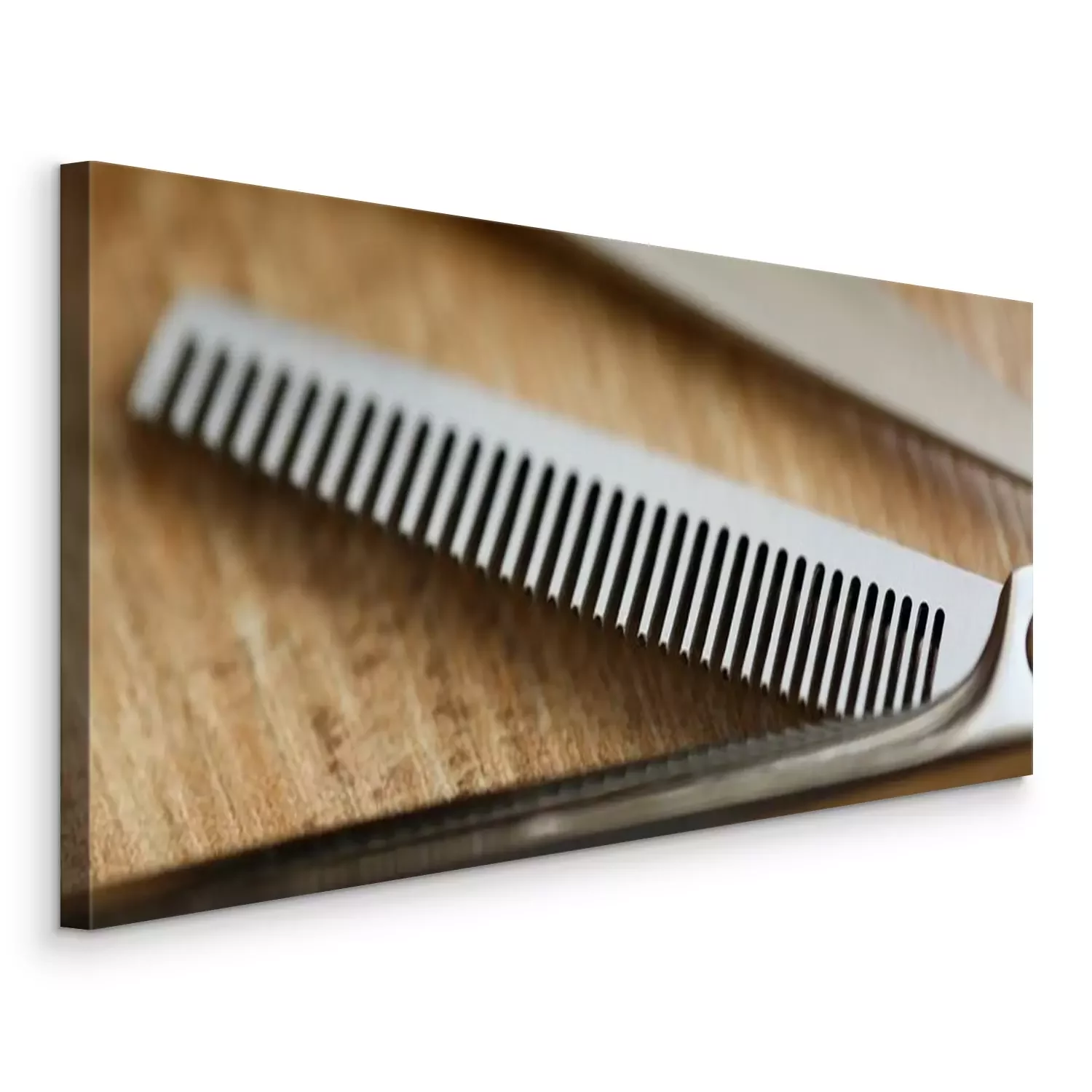 Canvas: Thinning shears lie on wooden table in hair salon closeup. Stylish hairstyle concept background.
