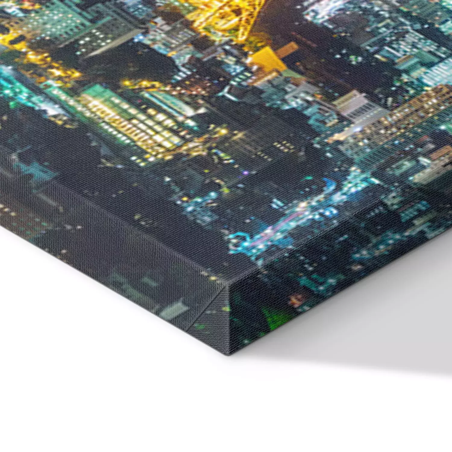 De print wordt aangebracht op hoogwaardig canvas dat op een schildersweefgetouw (spieraam) wordt gespannen. Omdat de print de zijranden bedekt, hoeft het ontwerp niet met een extra kader te worden omlijst. Wij raden ook composities aan die uit meerdere foto's bestaan en zo een coherente compositie vormen.