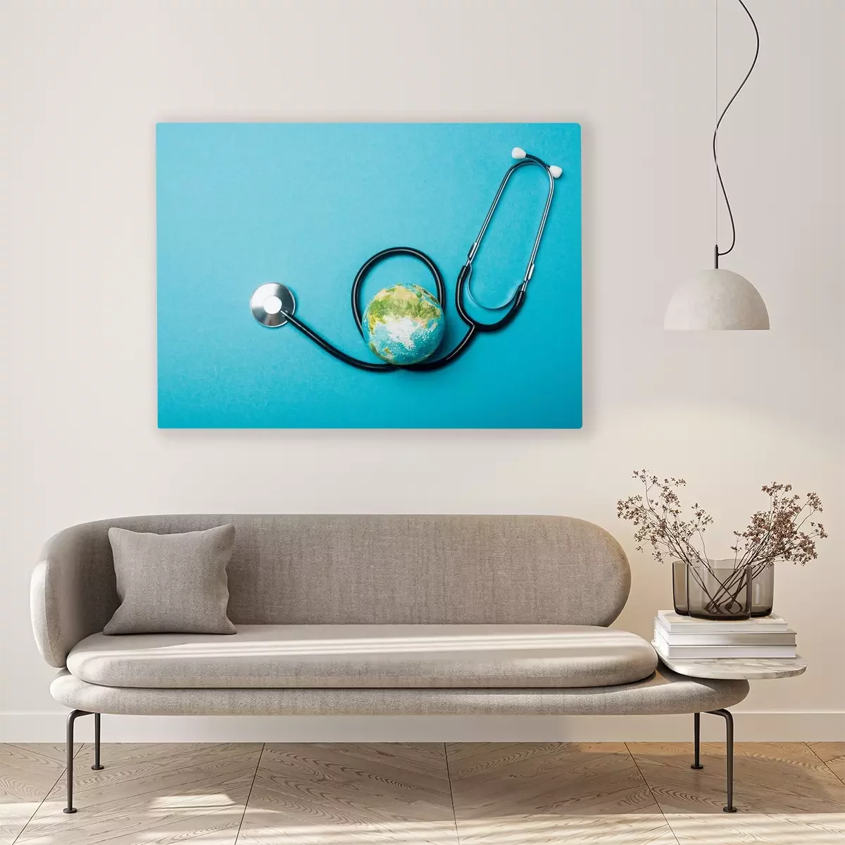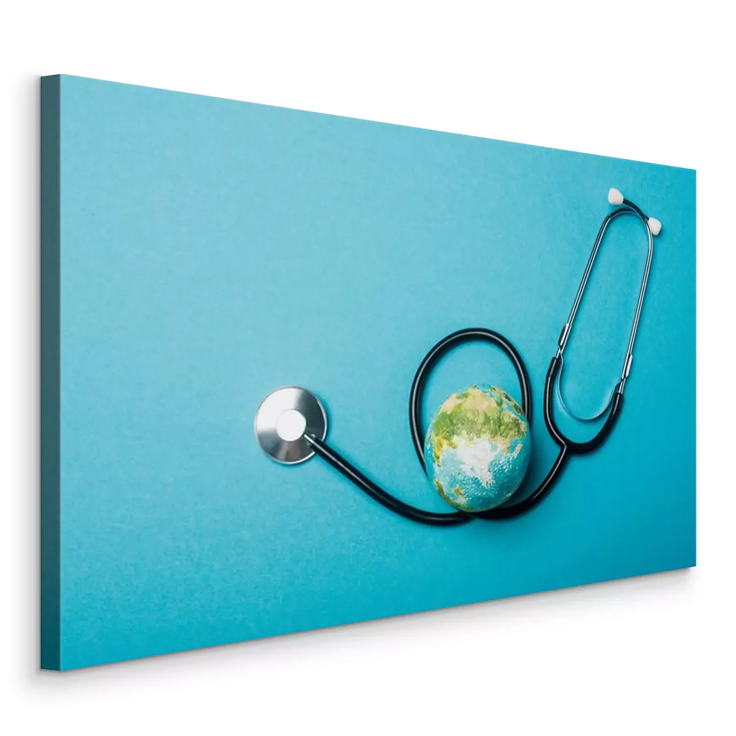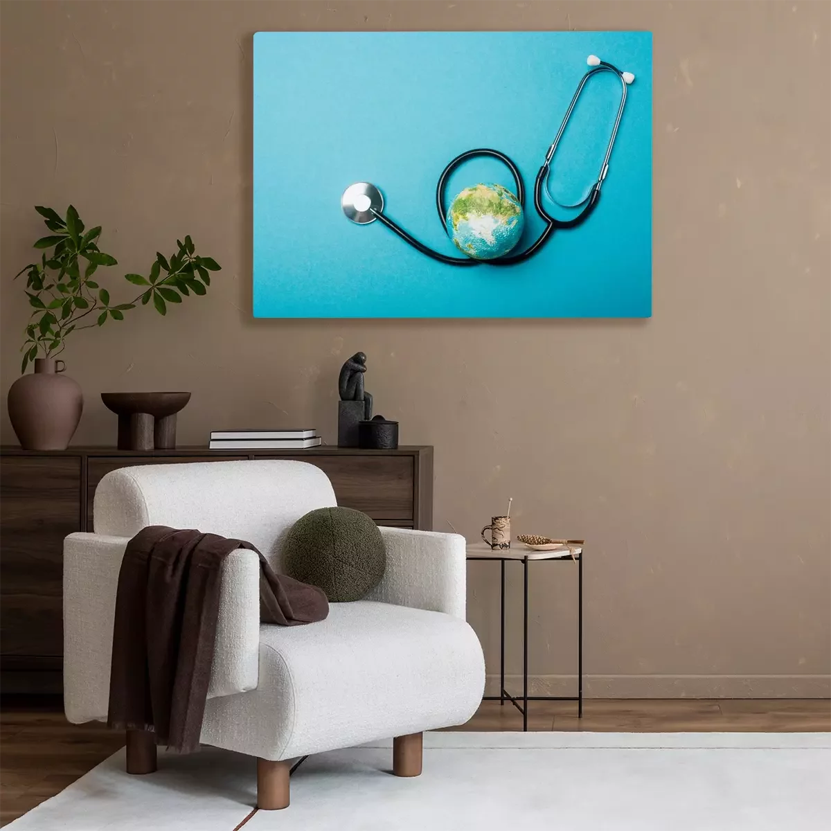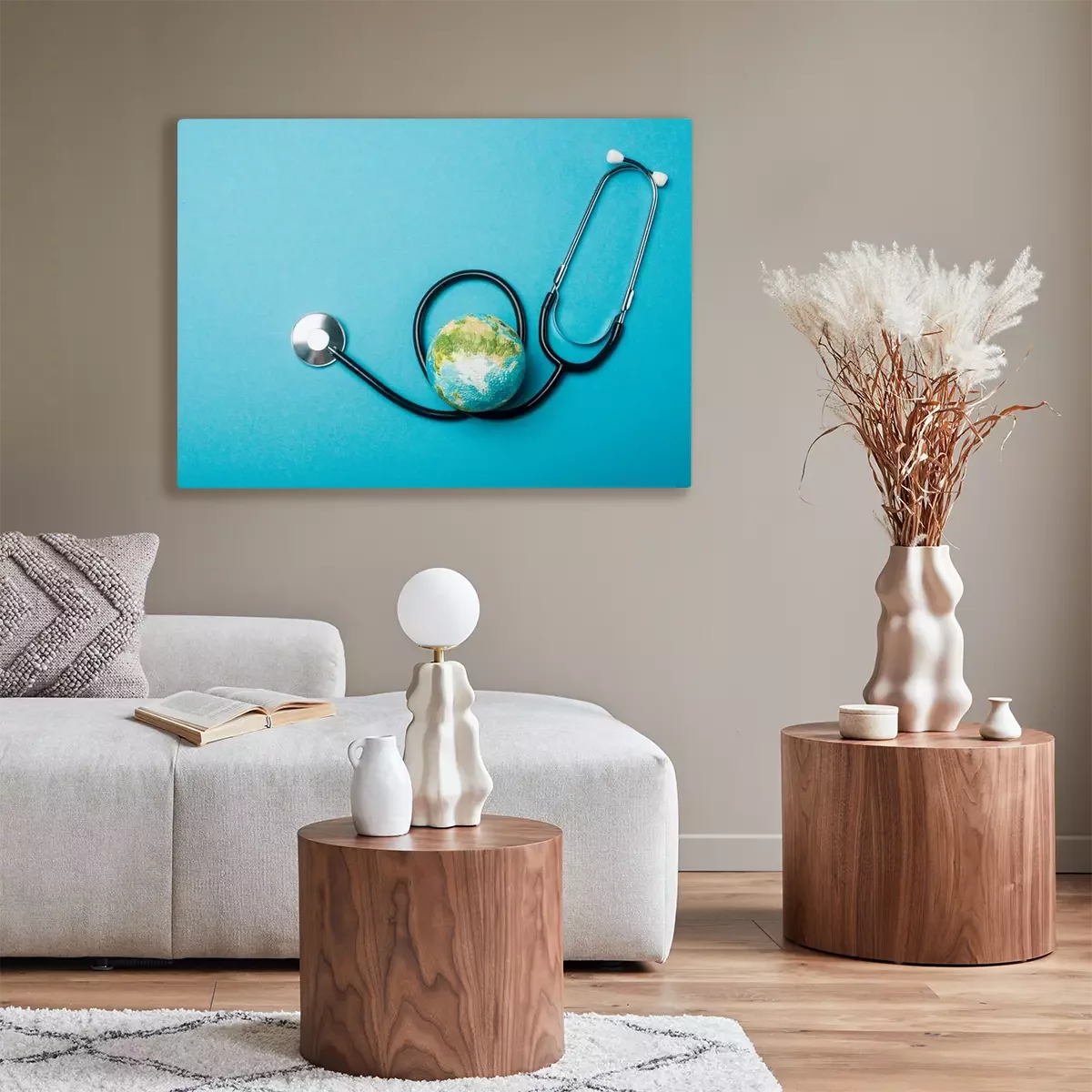 Canvas Top view of globe and stethoscope on blue background, world health day concept