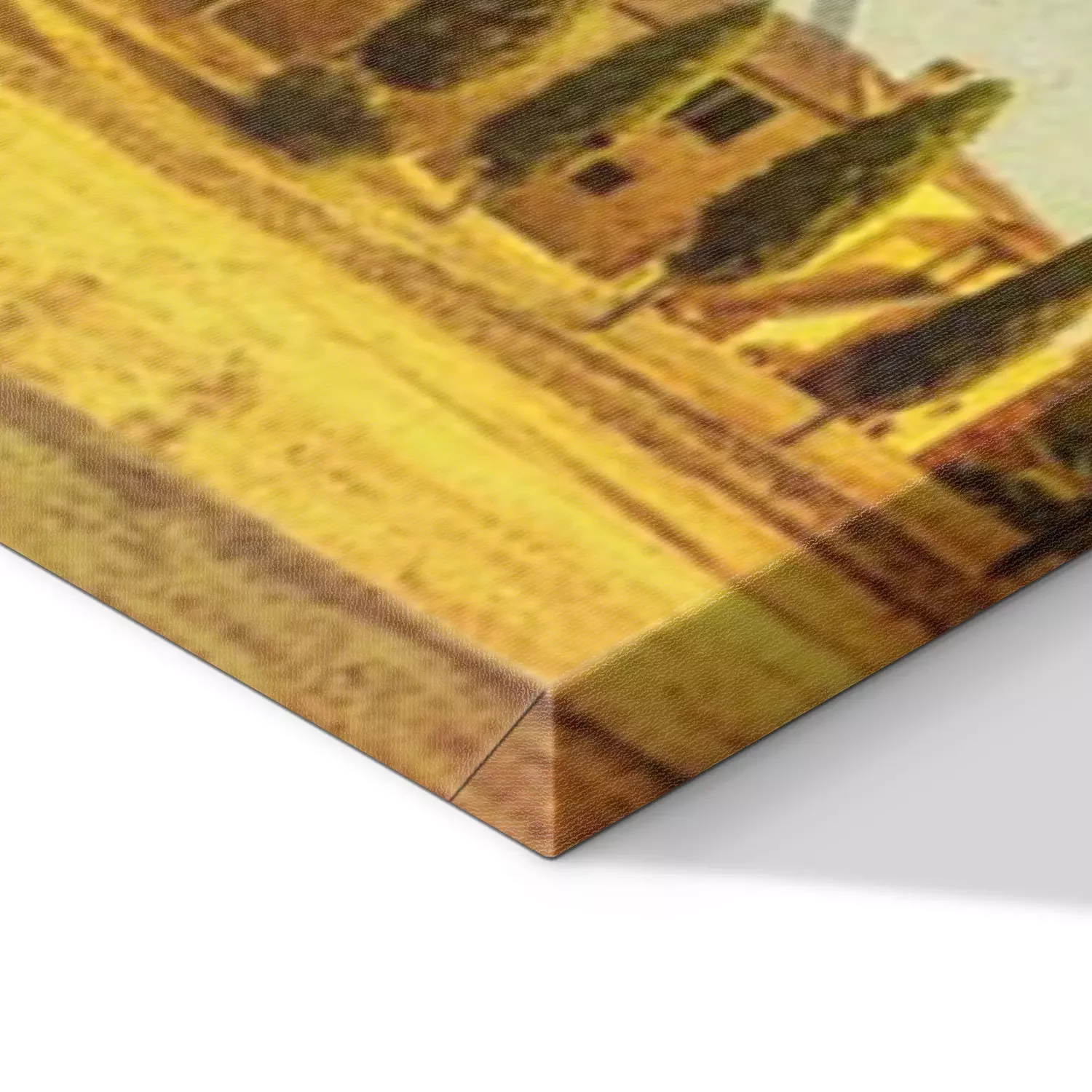 De print wordt aangebracht op hoogwaardig canvas dat op een schildersweefgetouw (spieraam) wordt gespannen. Omdat de print de zijranden bedekt, hoeft het ontwerp niet met een extra kader te worden omlijst. Wij raden ook composities aan die uit meerdere foto's bestaan en zo een coherente compositie vormen.