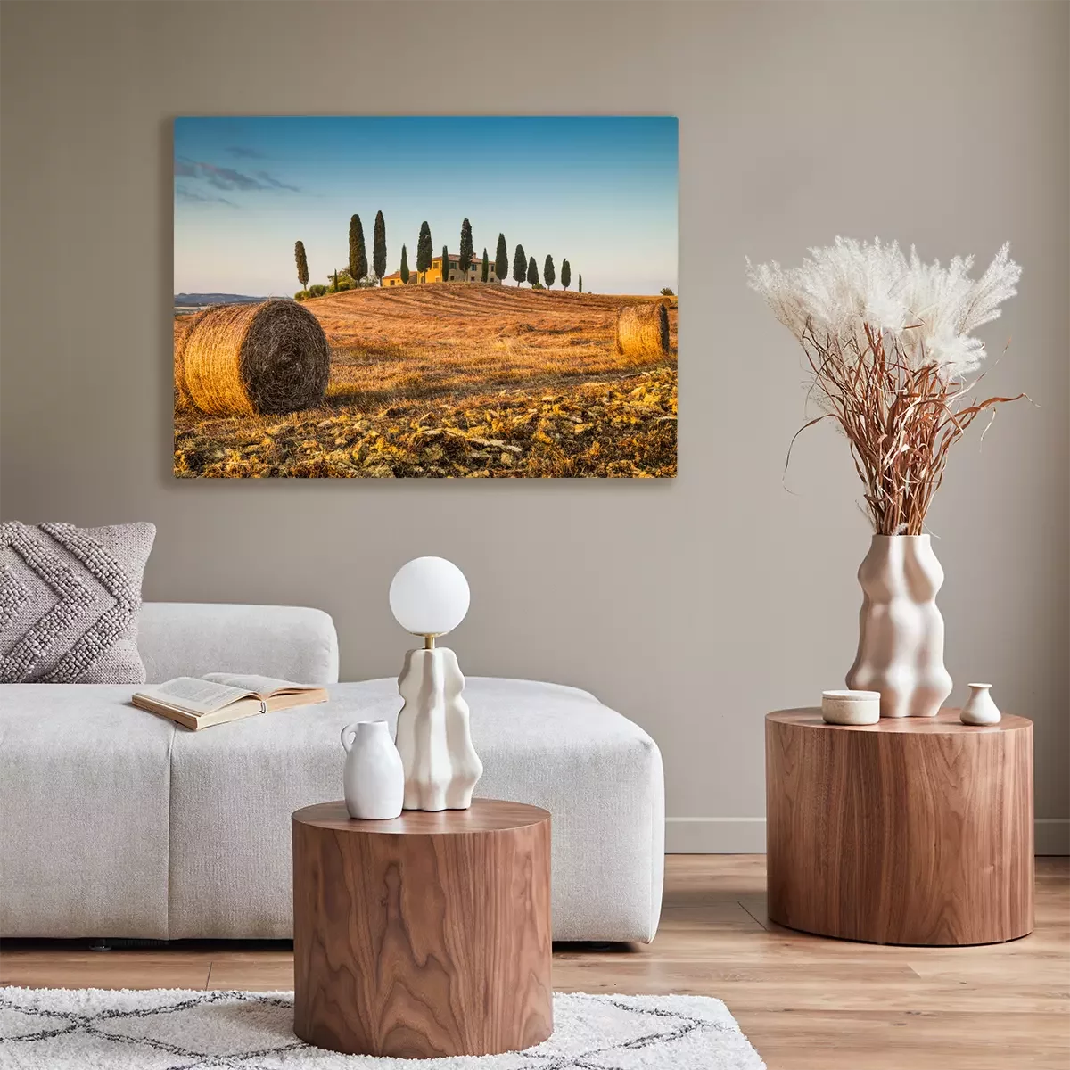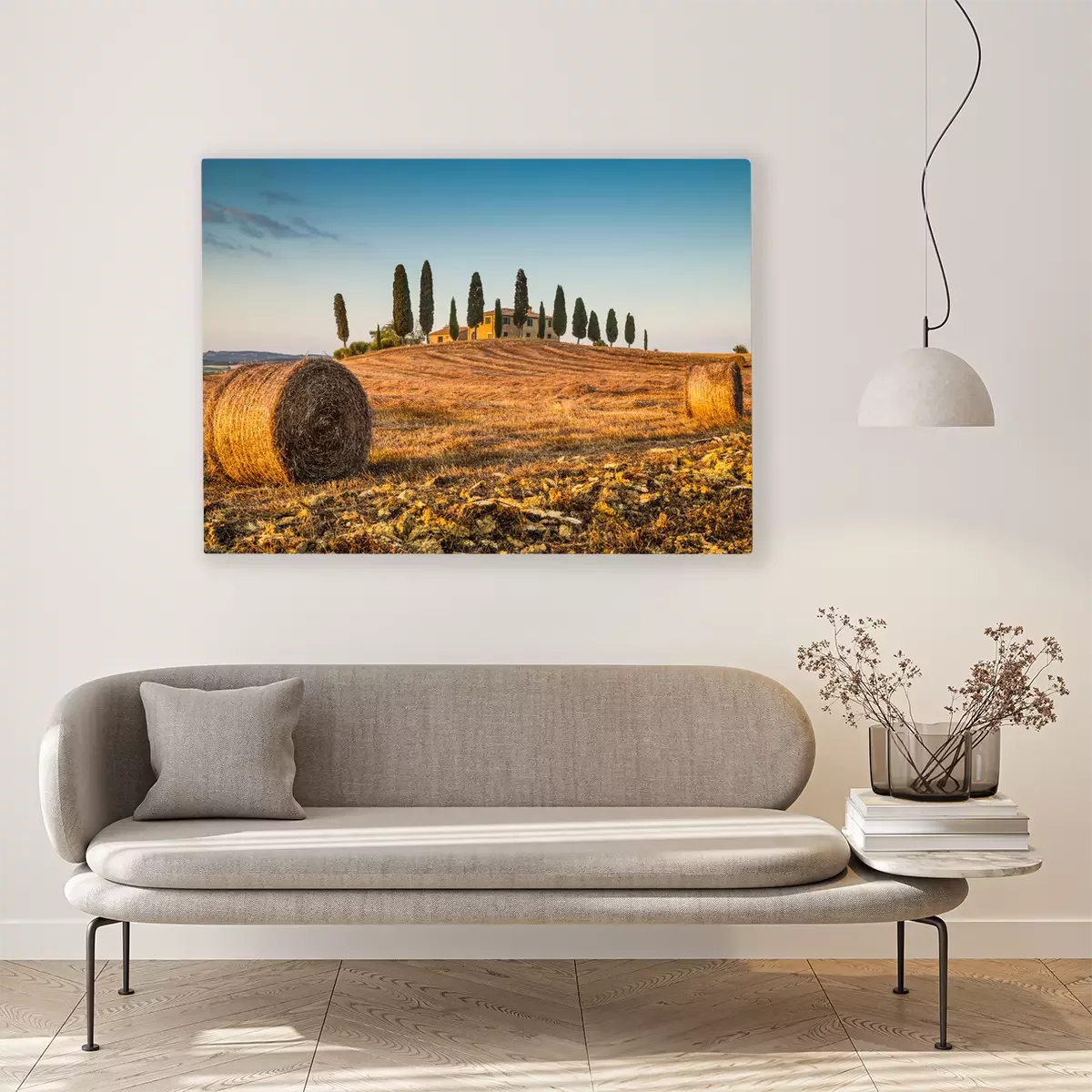Canvas: Toscaanse landschap met boerderij bij zonsondergang, Val d'Orcia, Italië