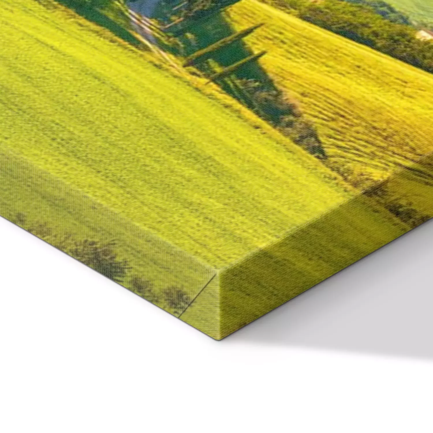 De print wordt aangebracht op hoogwaardig canvas dat op een schildersweefgetouw (spieraam) wordt gespannen. Omdat de print de zijranden bedekt, hoeft het ontwerp niet met een extra kader te worden omlijst. Wij raden ook composities aan die uit meerdere foto's bestaan en zo een coherente compositie vormen.