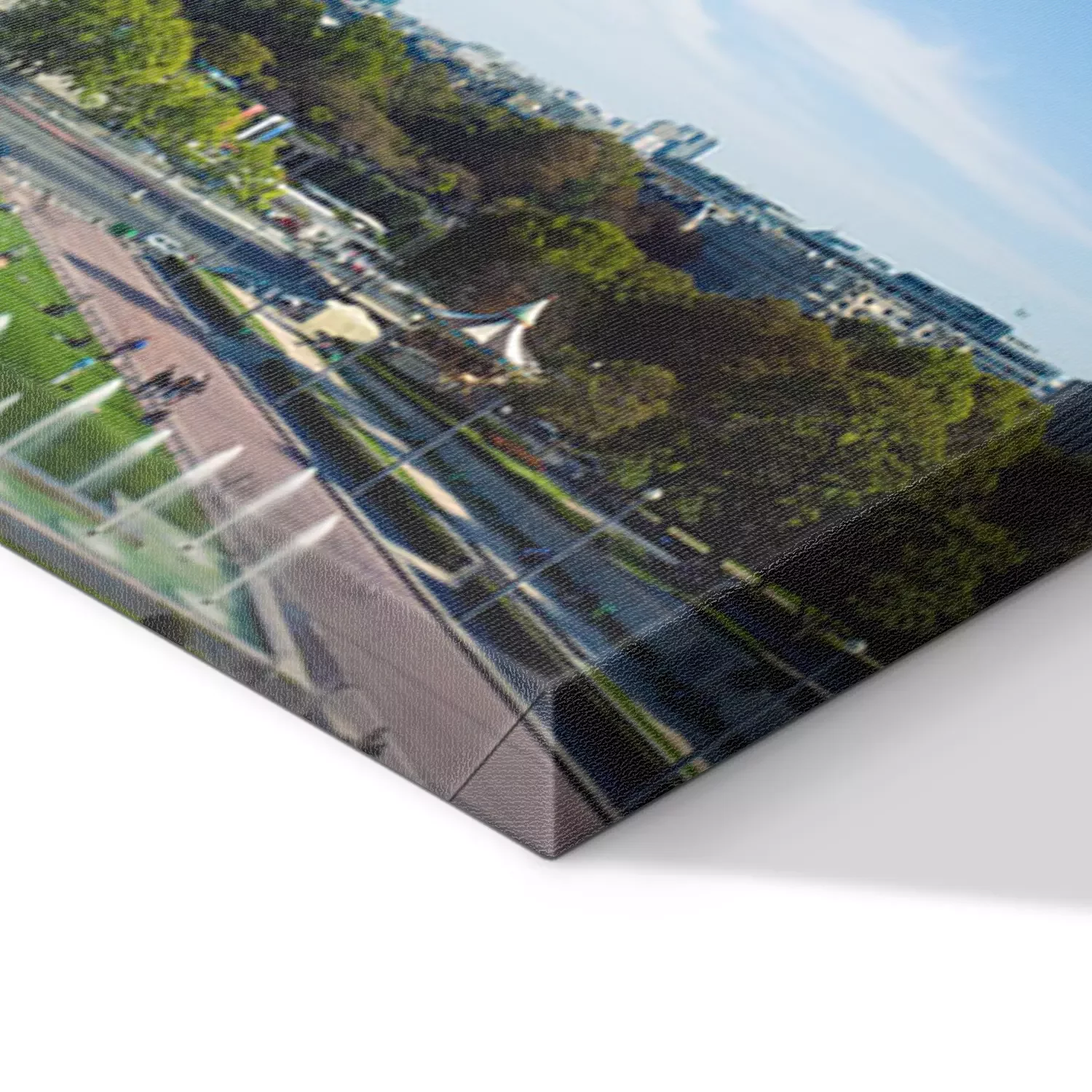 De print wordt aangebracht op hoogwaardig canvas dat op een schildersweefgetouw (spieraam) wordt gespannen. Omdat de print de zijranden bedekt, hoeft het ontwerp niet met een extra kader te worden omlijst. Wij raden ook composities aan die uit meerdere foto's bestaan en zo een coherente compositie vormen.