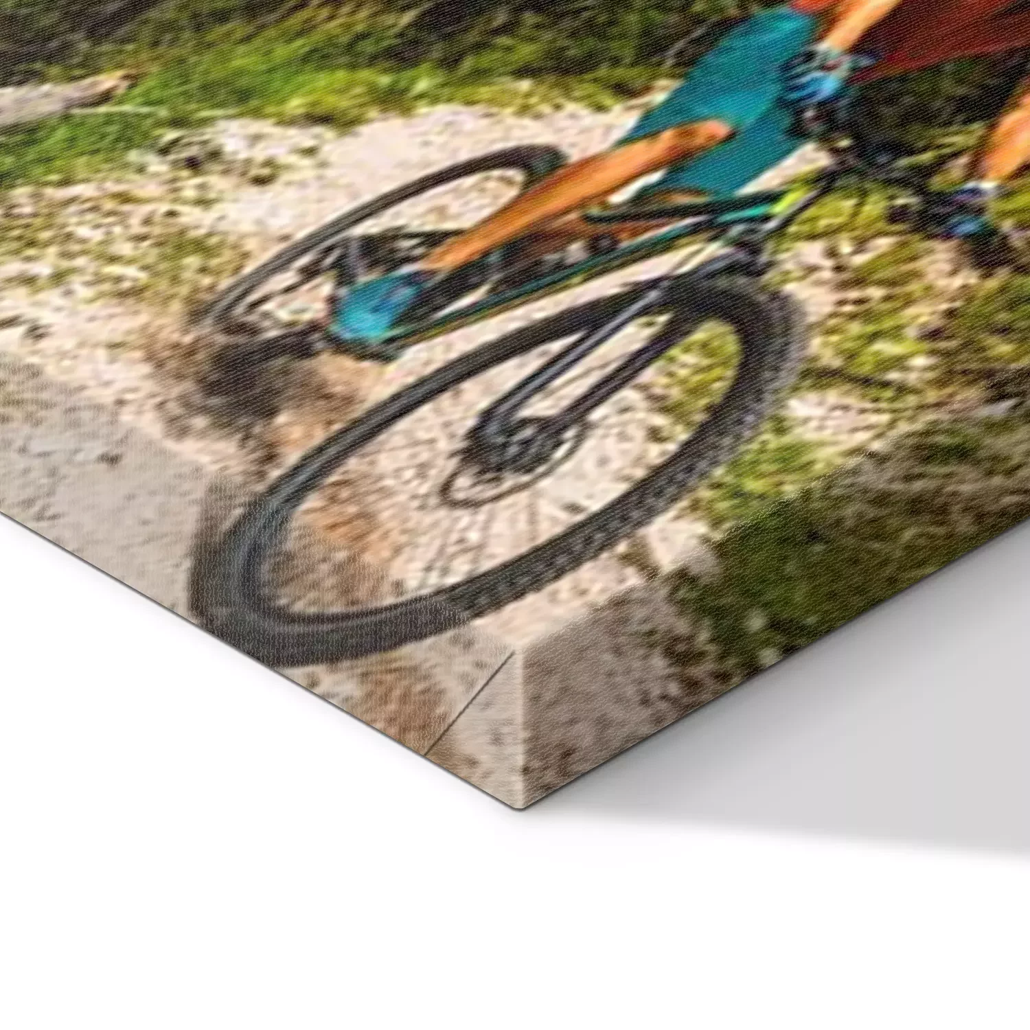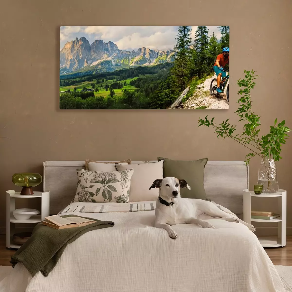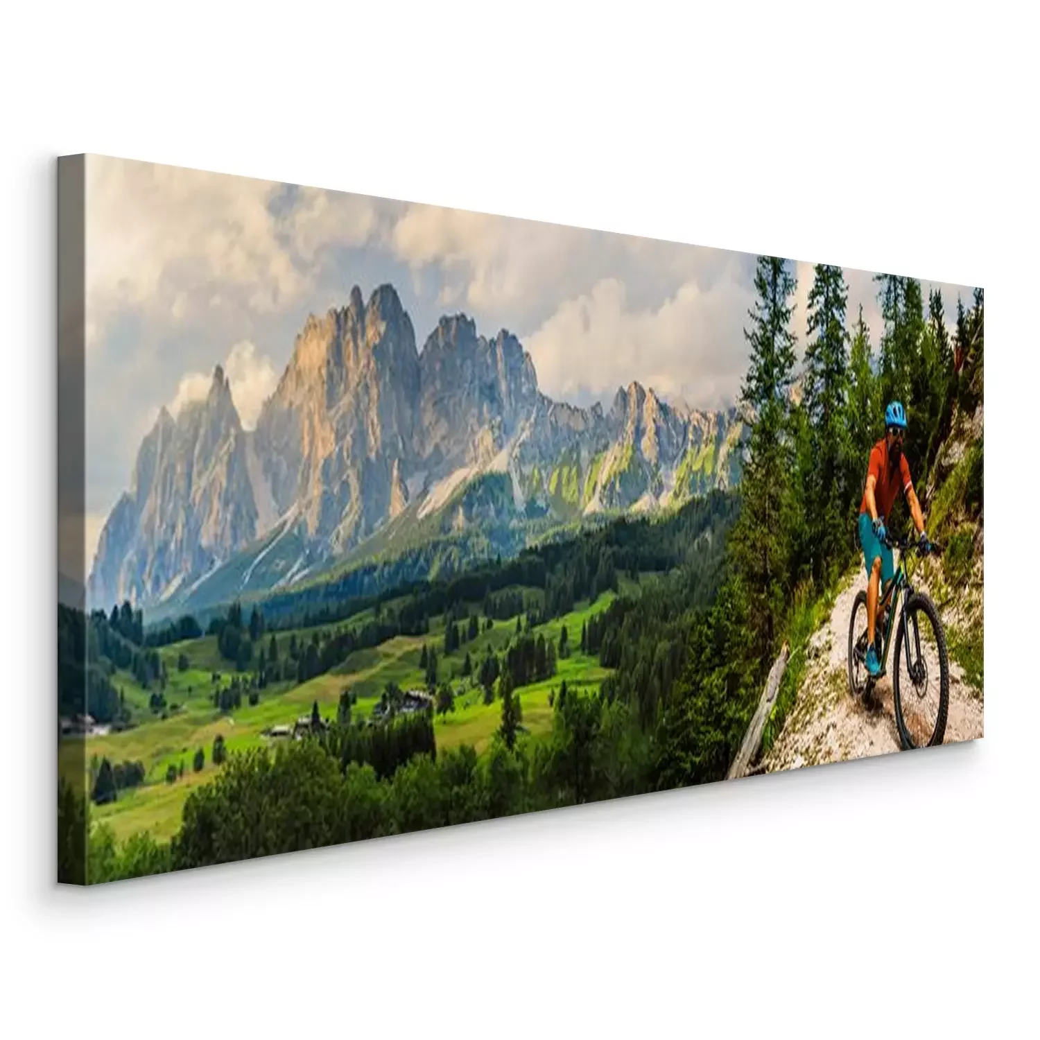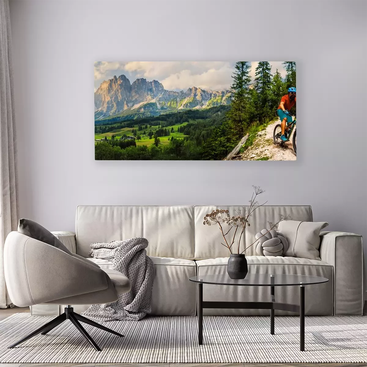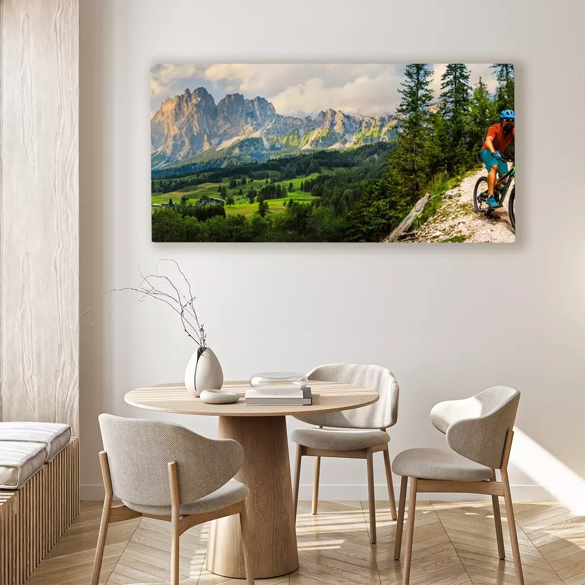 Canvas: Tourist cycling in Cortina d'Ampezzo, stunning rocky mountains on the background. Man riding MTB enduro flow trail. South Tyrol province of Italy, Dolomites.