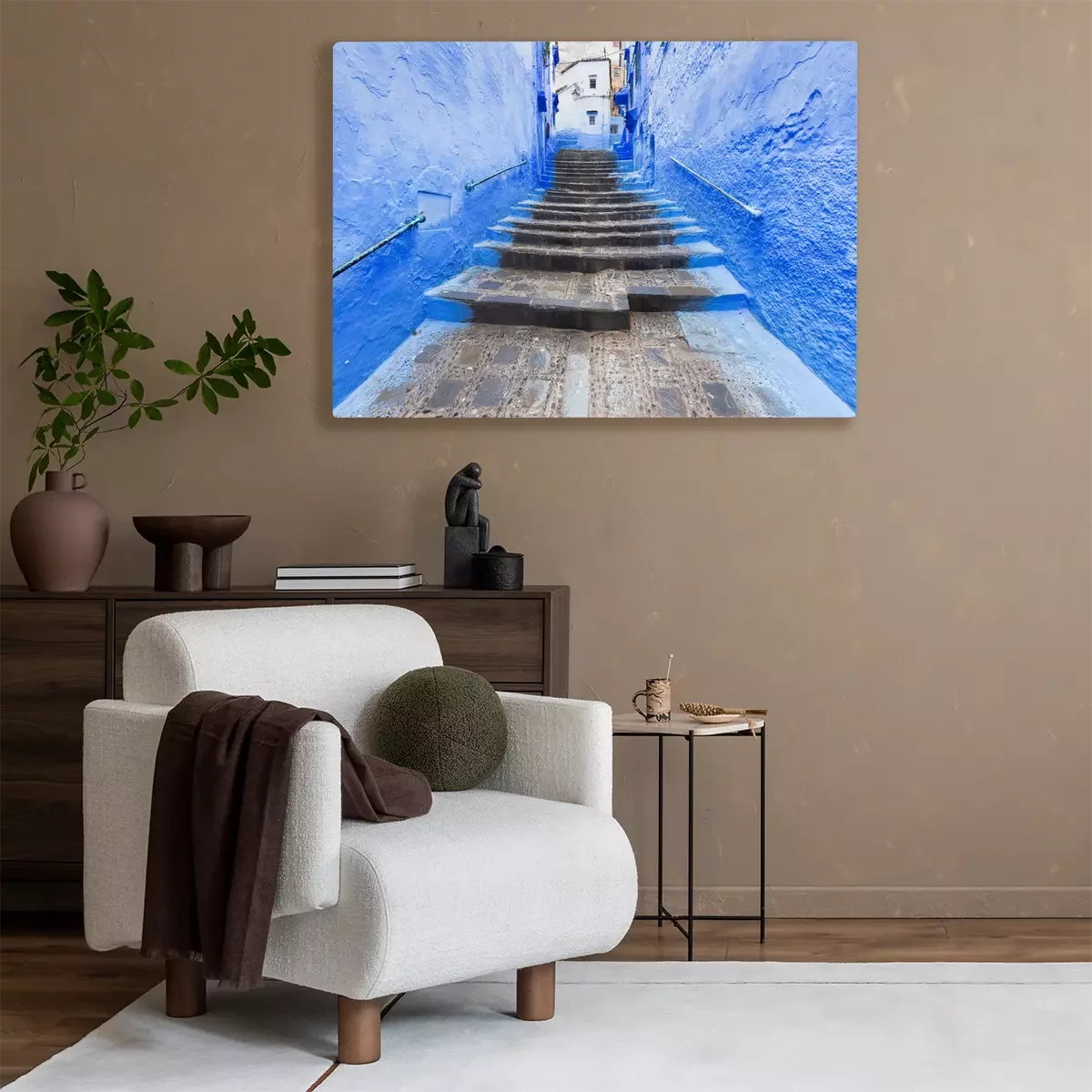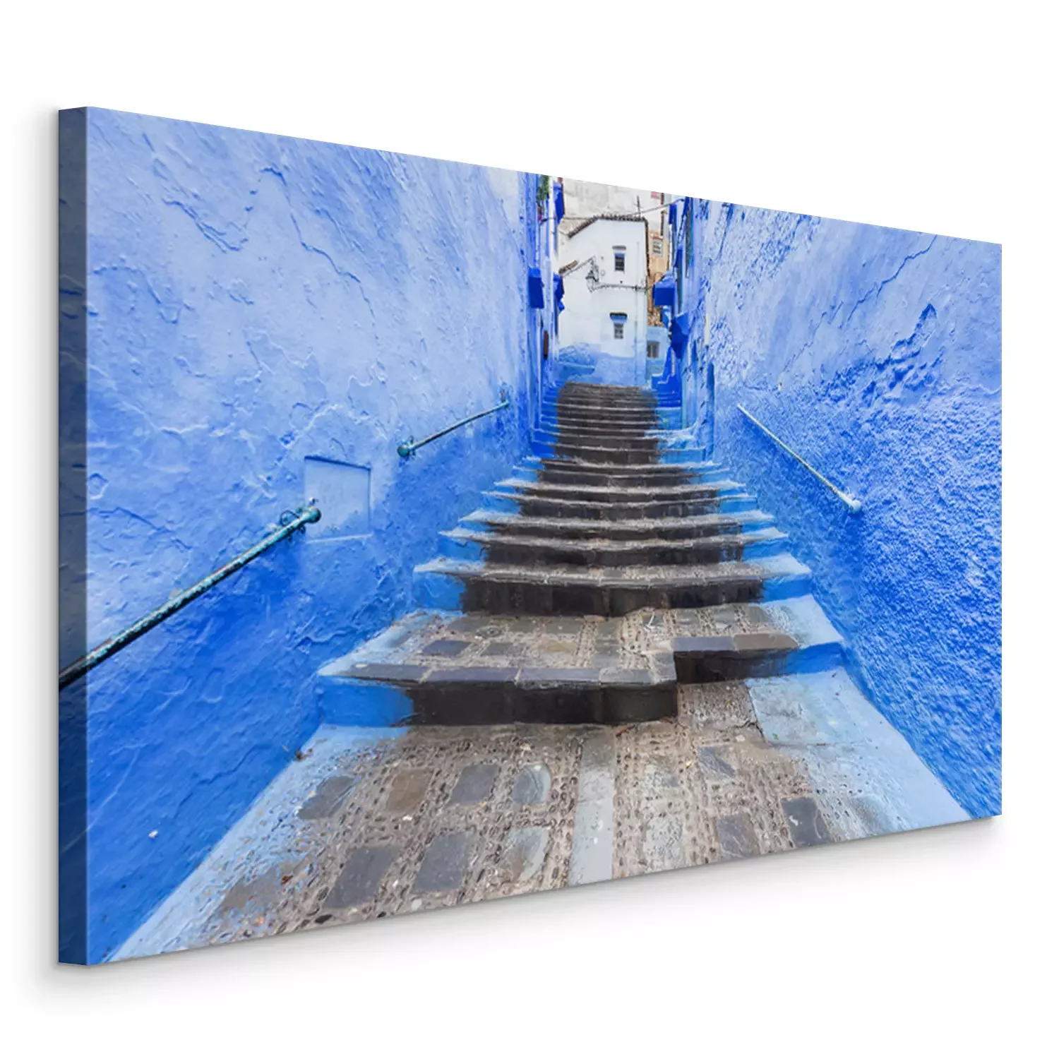 Canvas: Traditional typical moroccan architectural details in Chefchaouen, Morocco, Africa Beautiful street of blue medina with blue walls and decorated with various objects (pots, jugs). A city with narrow,