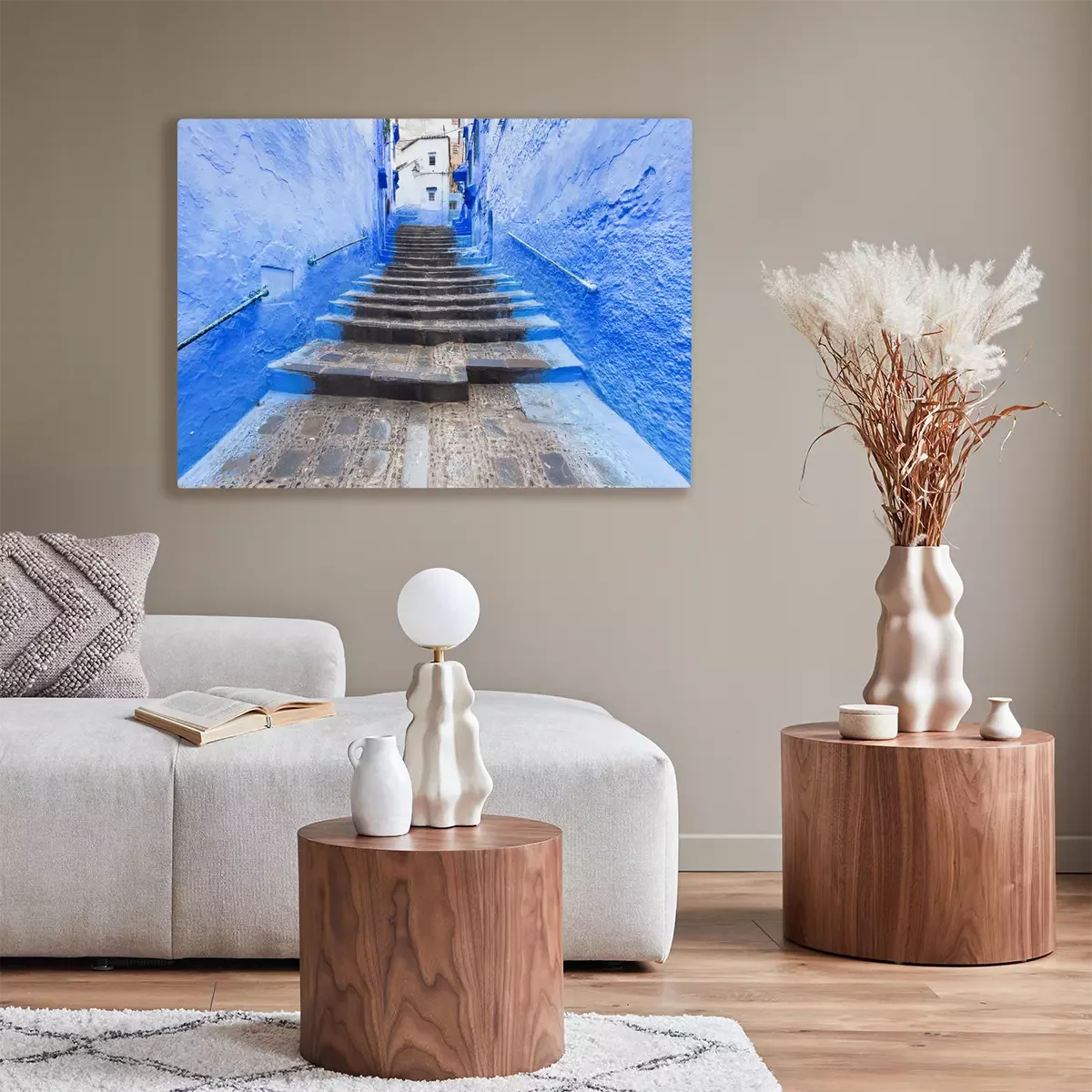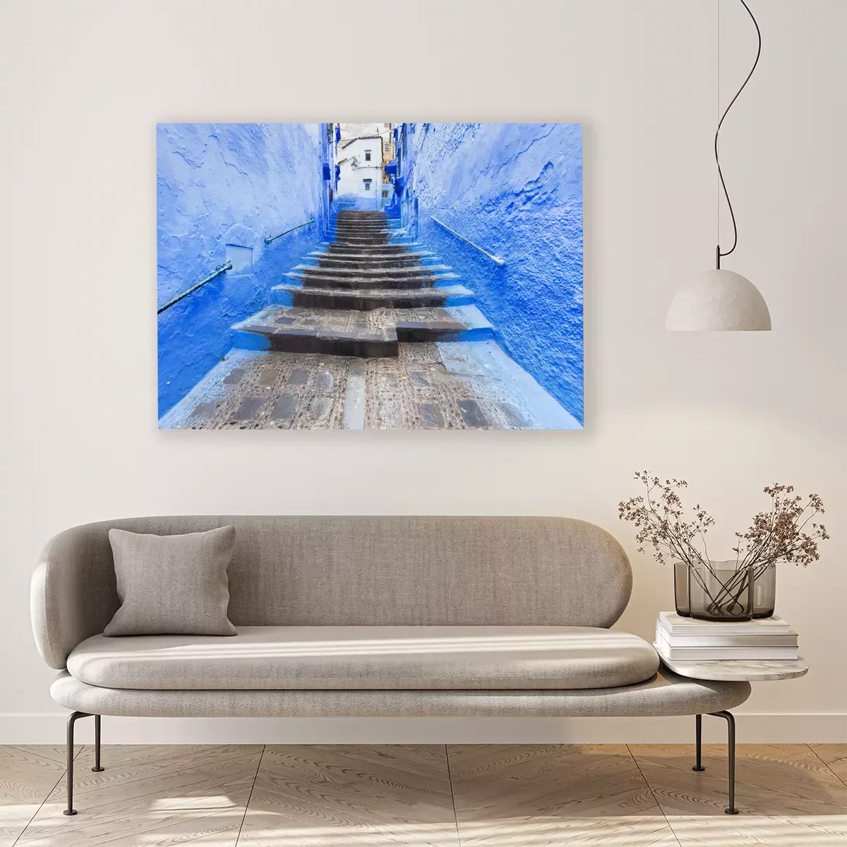Canvas Traditional typical moroccan architectural details in Chefchaouen, Morocco, Africa Beautiful street of blue medina with blue walls and decorated with various objects (pots, jugs). A city with narrow,