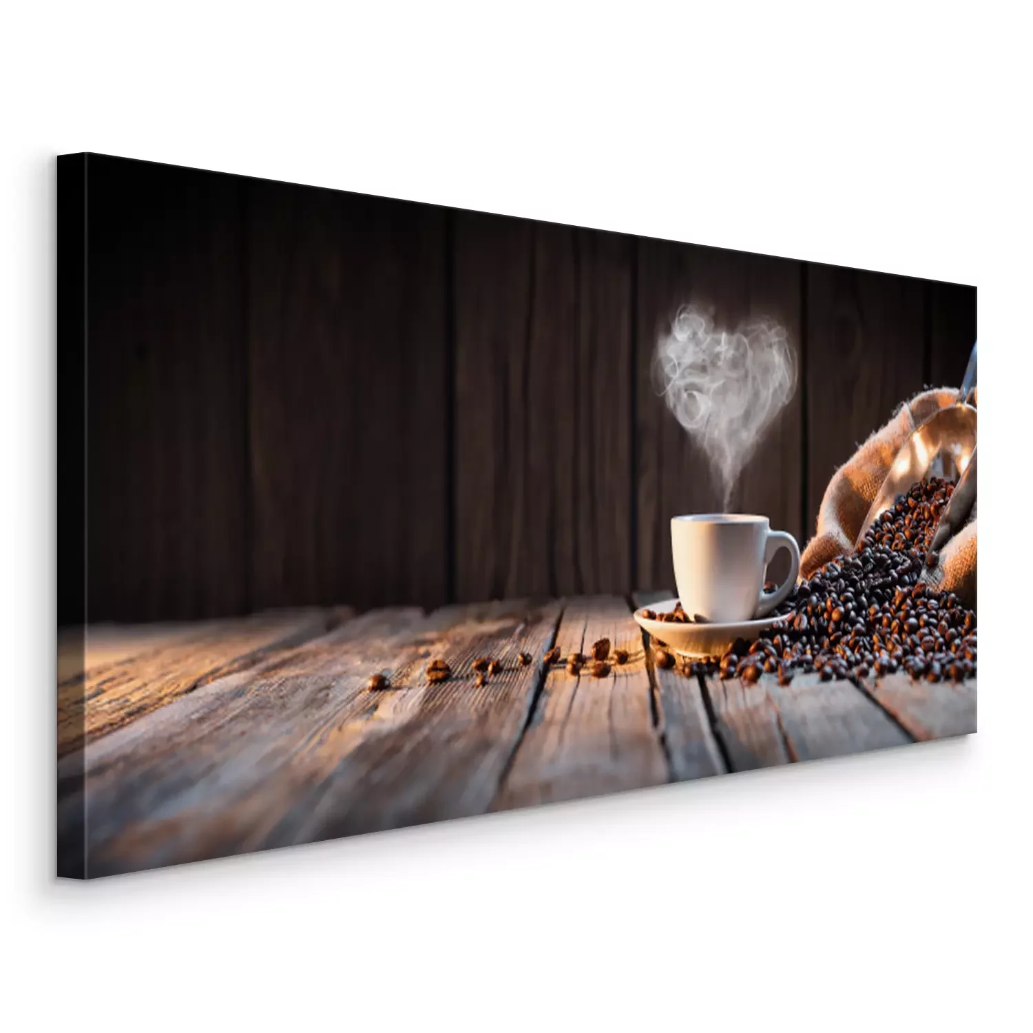 Canvas: Traditionele Coffee Kop Met Hart-gevormde stoom op Rustieke Houten