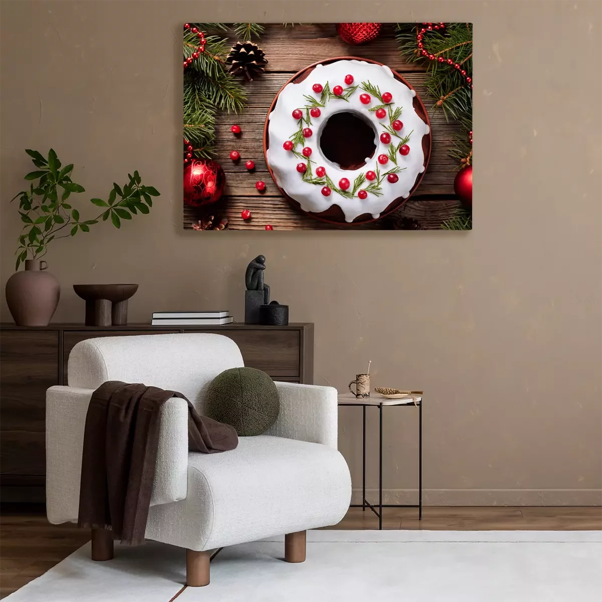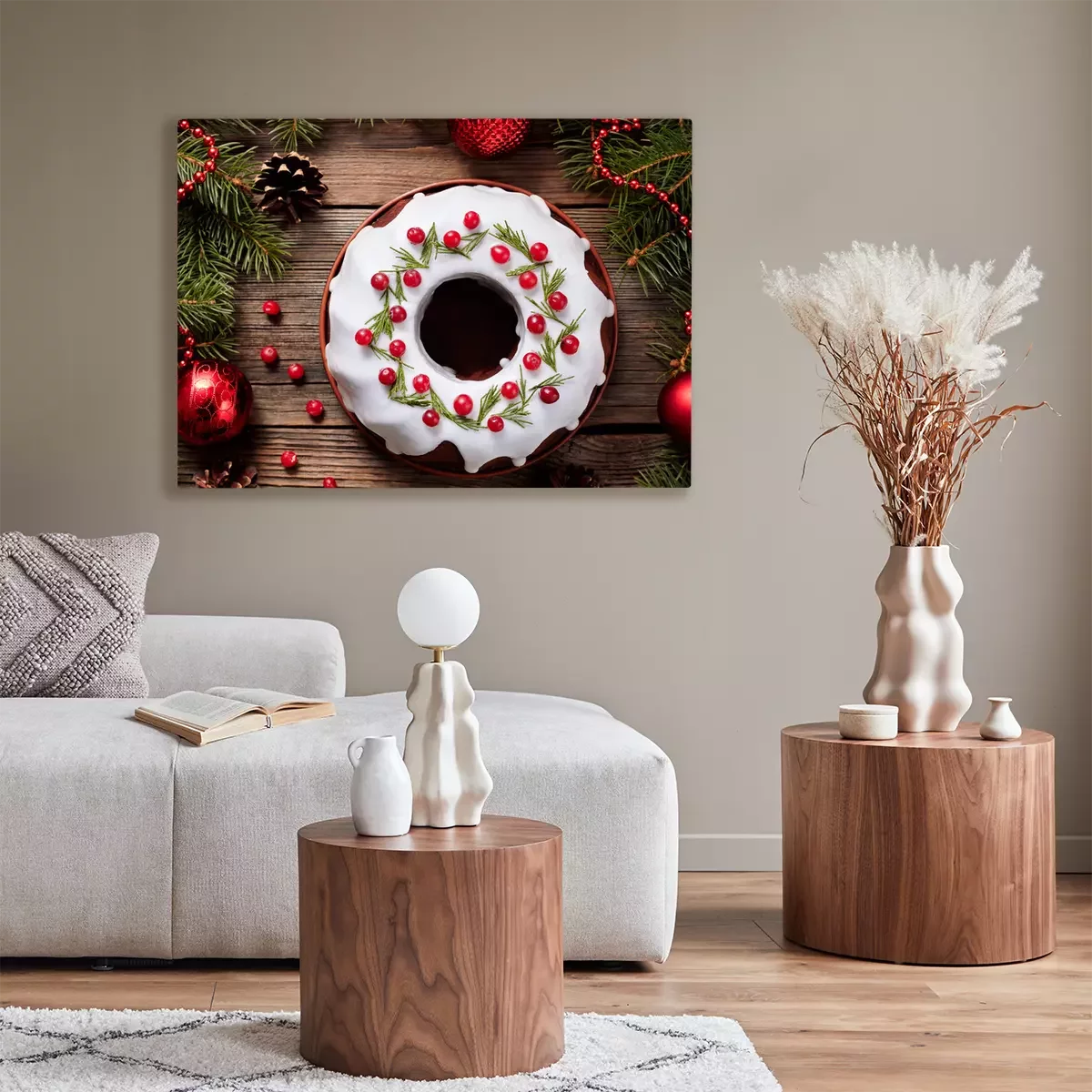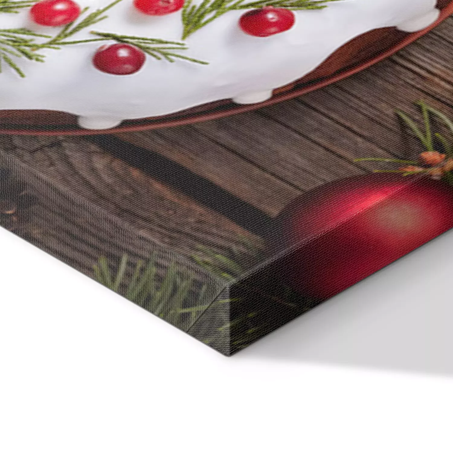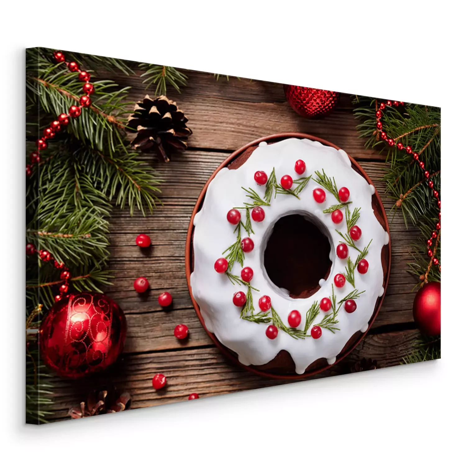 Canvas: Traditionele eigengemaakte cake kerst vakantie dessert met cranberry in het nieuwe jaar boom decoraties frame op vintage houten tafel achtergrond. rustieke stijl