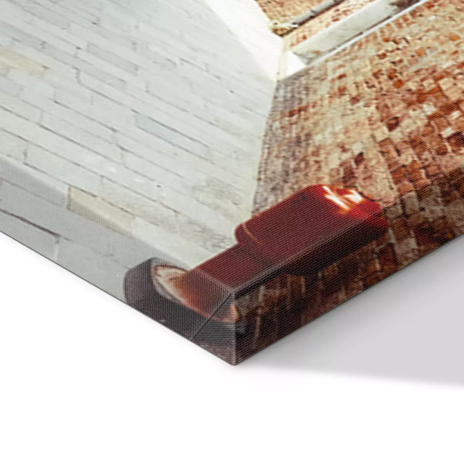 De print wordt aangebracht op hoogwaardig canvas dat op een schildersweefgetouw (spieraam) wordt gespannen. Omdat de print de zijranden bedekt, hoeft het ontwerp niet met een extra kader te worden omlijst. Wij raden ook composities aan die uit meerdere foto's bestaan en zo een coherente compositie vormen.