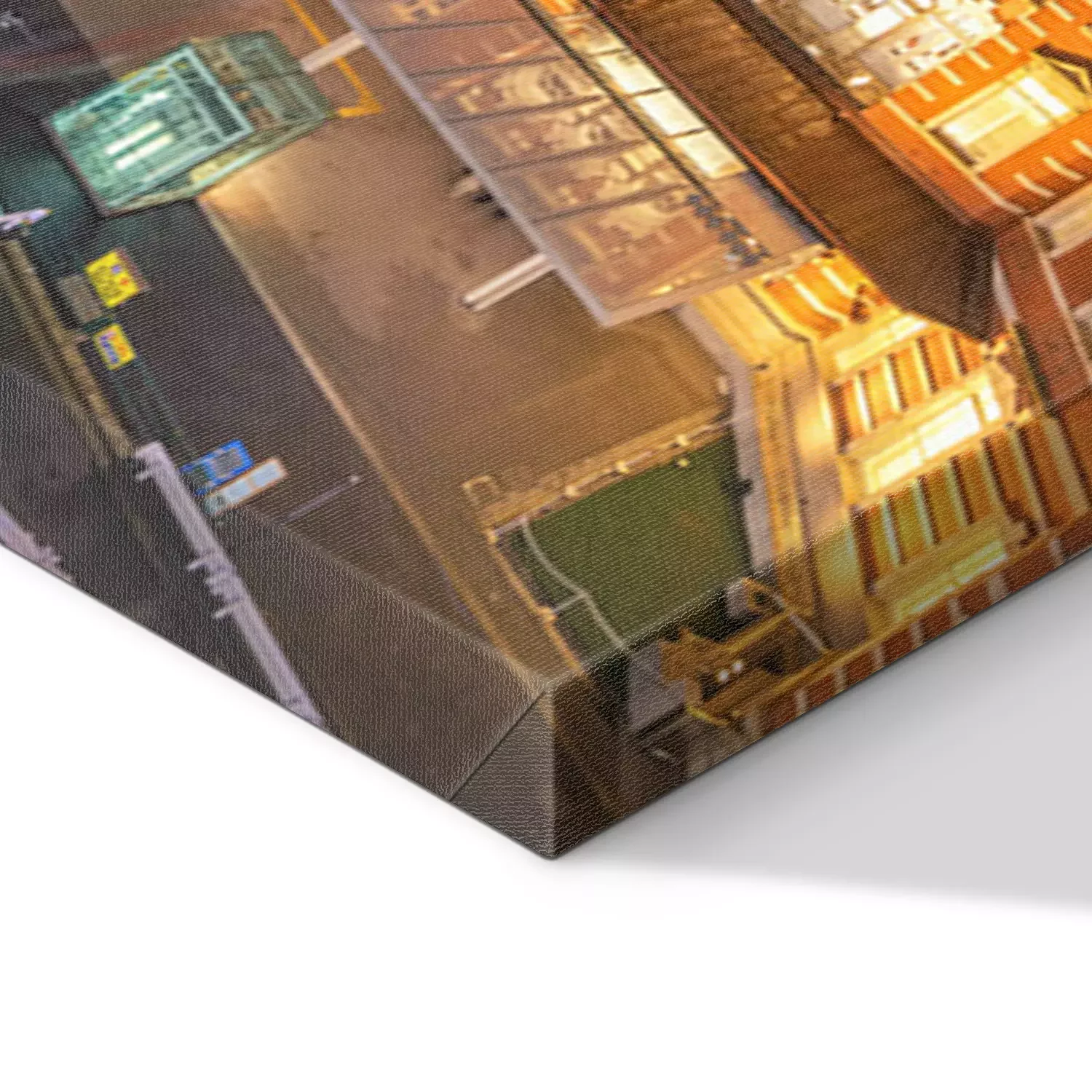 De print wordt aangebracht op hoogwaardig canvas dat op een schildersweefgetouw (spieraam) wordt gespannen. Omdat de print de zijranden bedekt, hoeft het ontwerp niet met een extra kader te worden omlijst. Wij raden ook composities aan die uit meerdere foto's bestaan en zo een coherente compositie vormen.