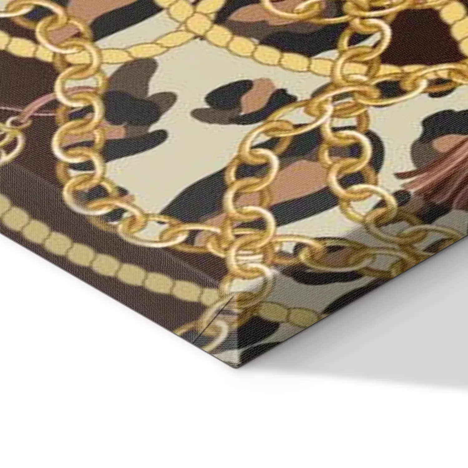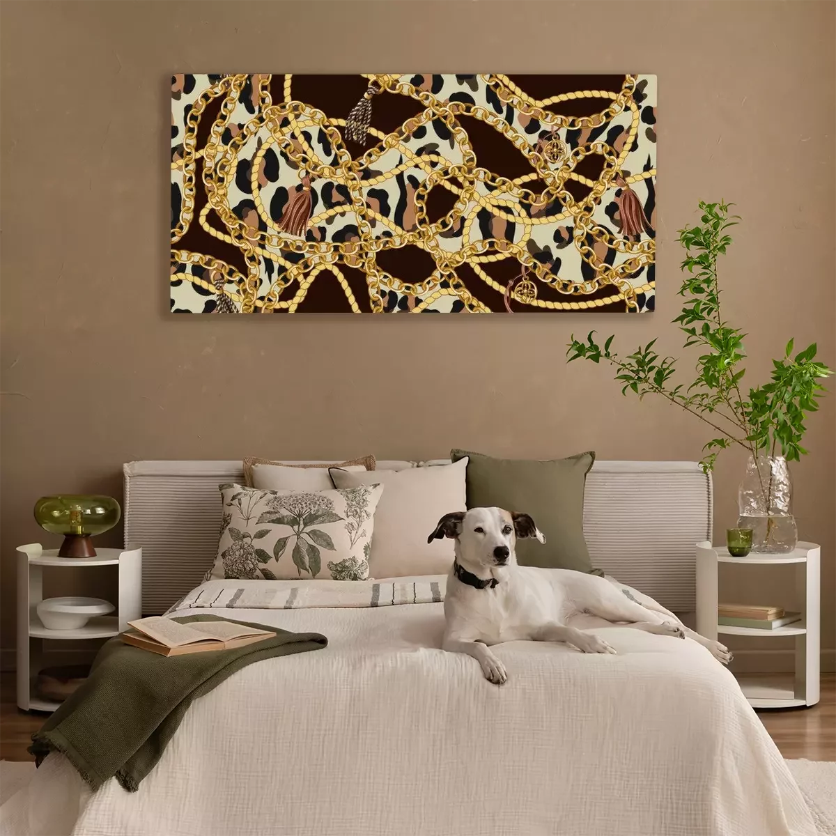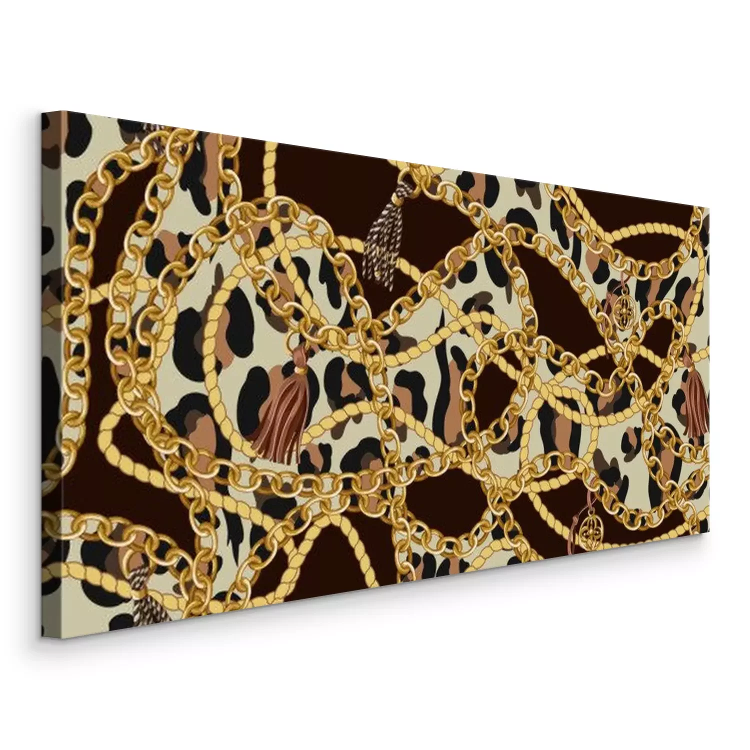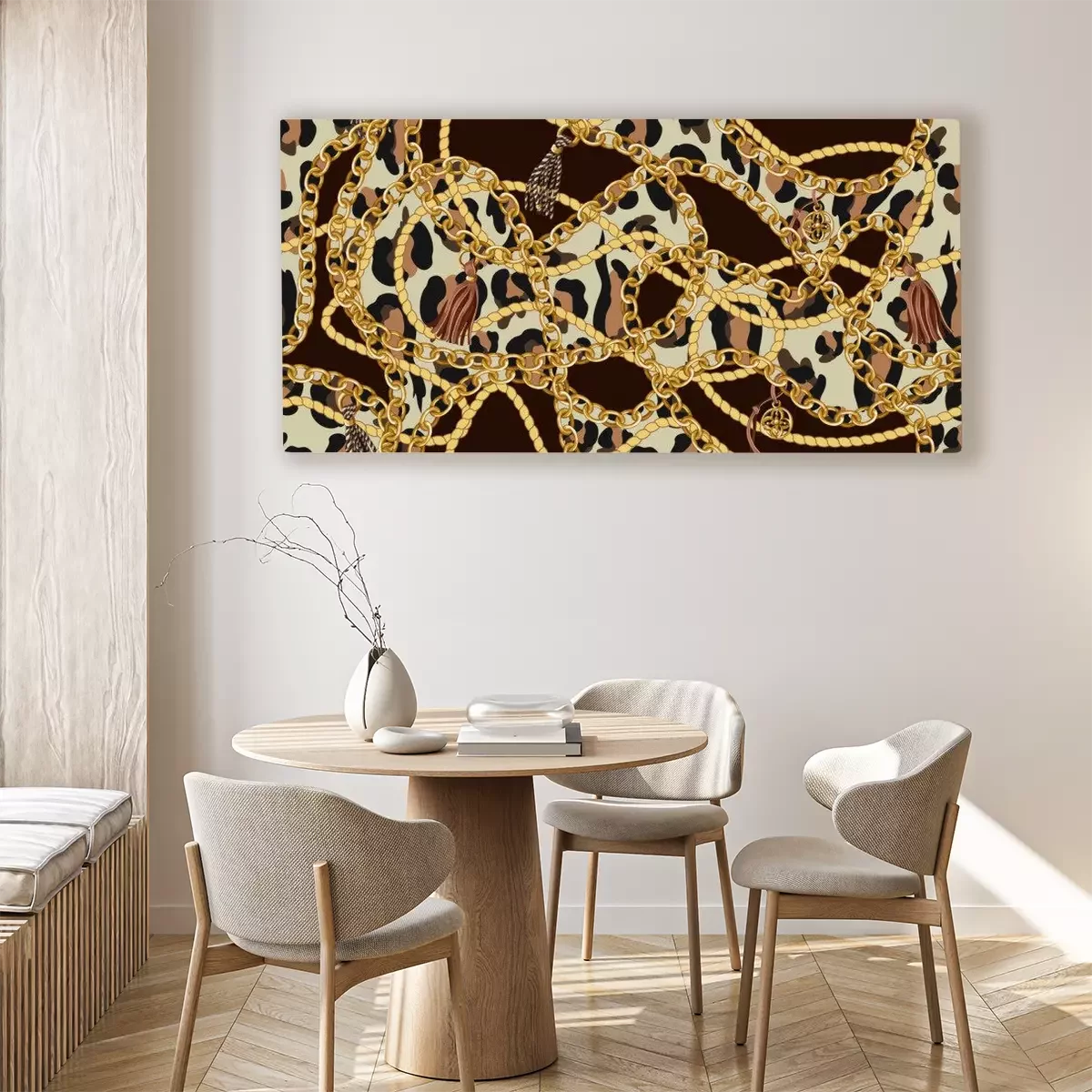 Canvas: Trendy naadloos patroon met gouden kettingen en touw op luipaardvel. Vector.