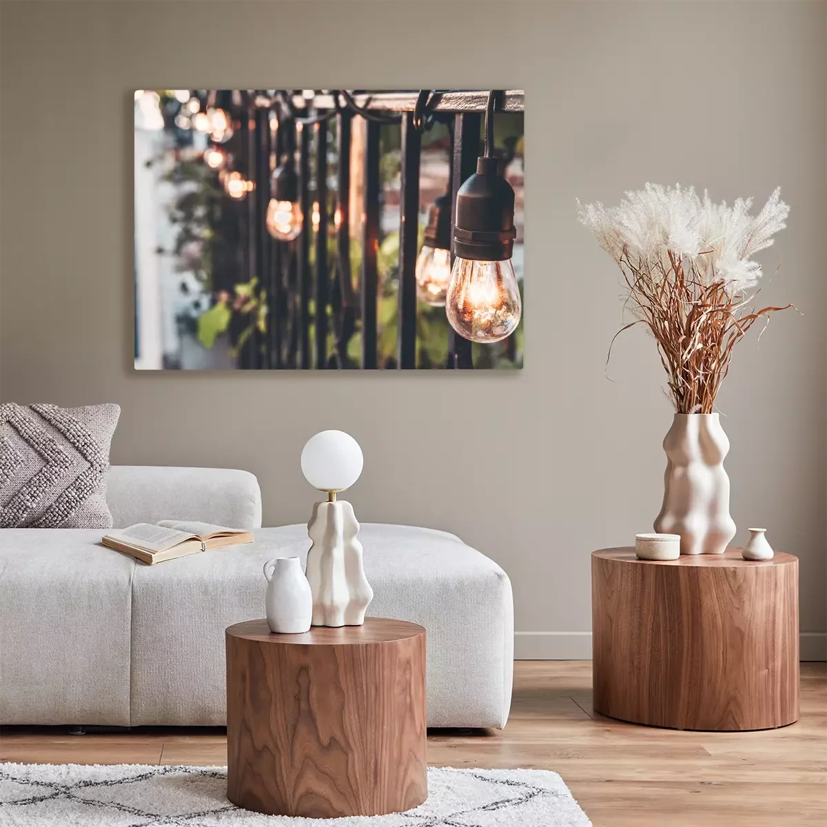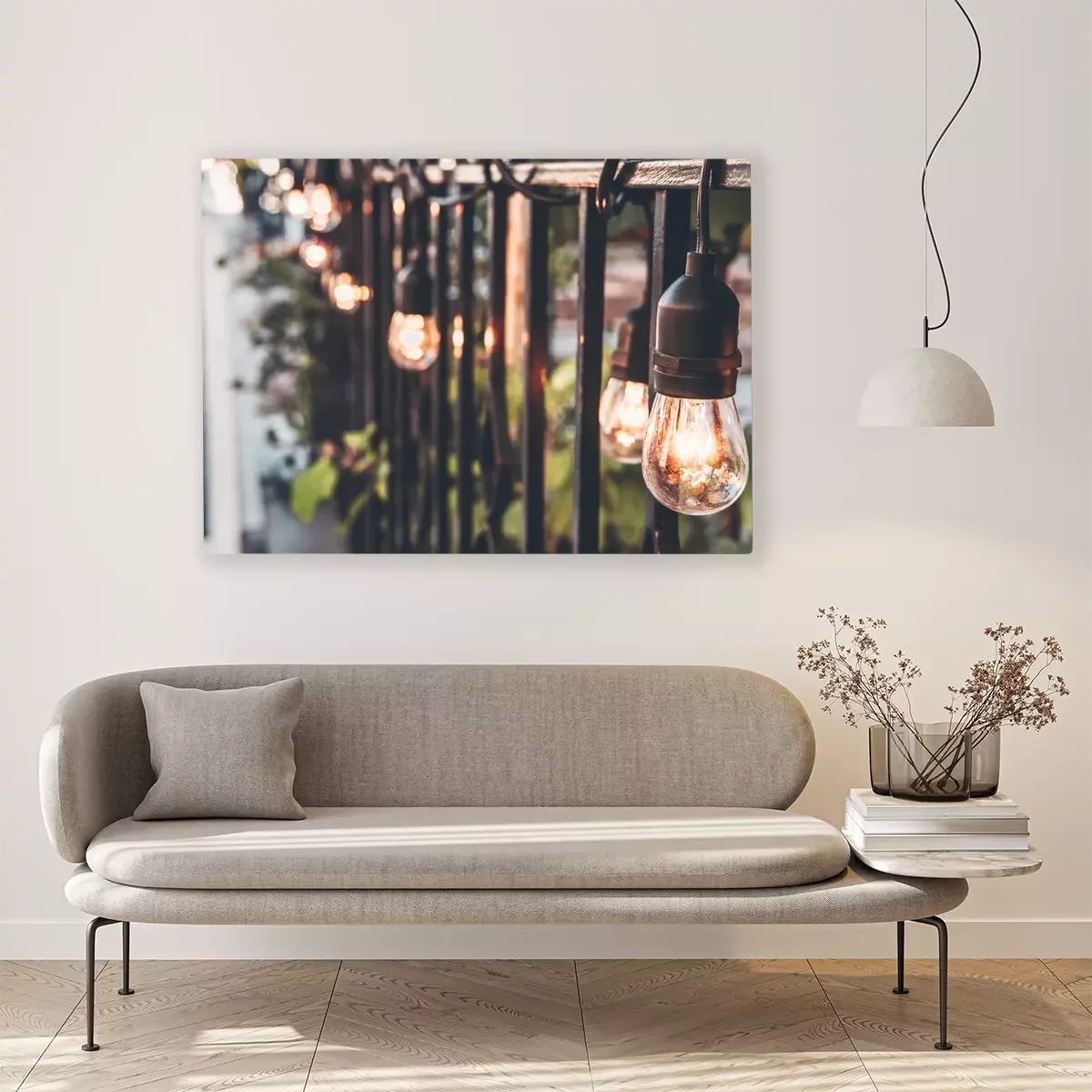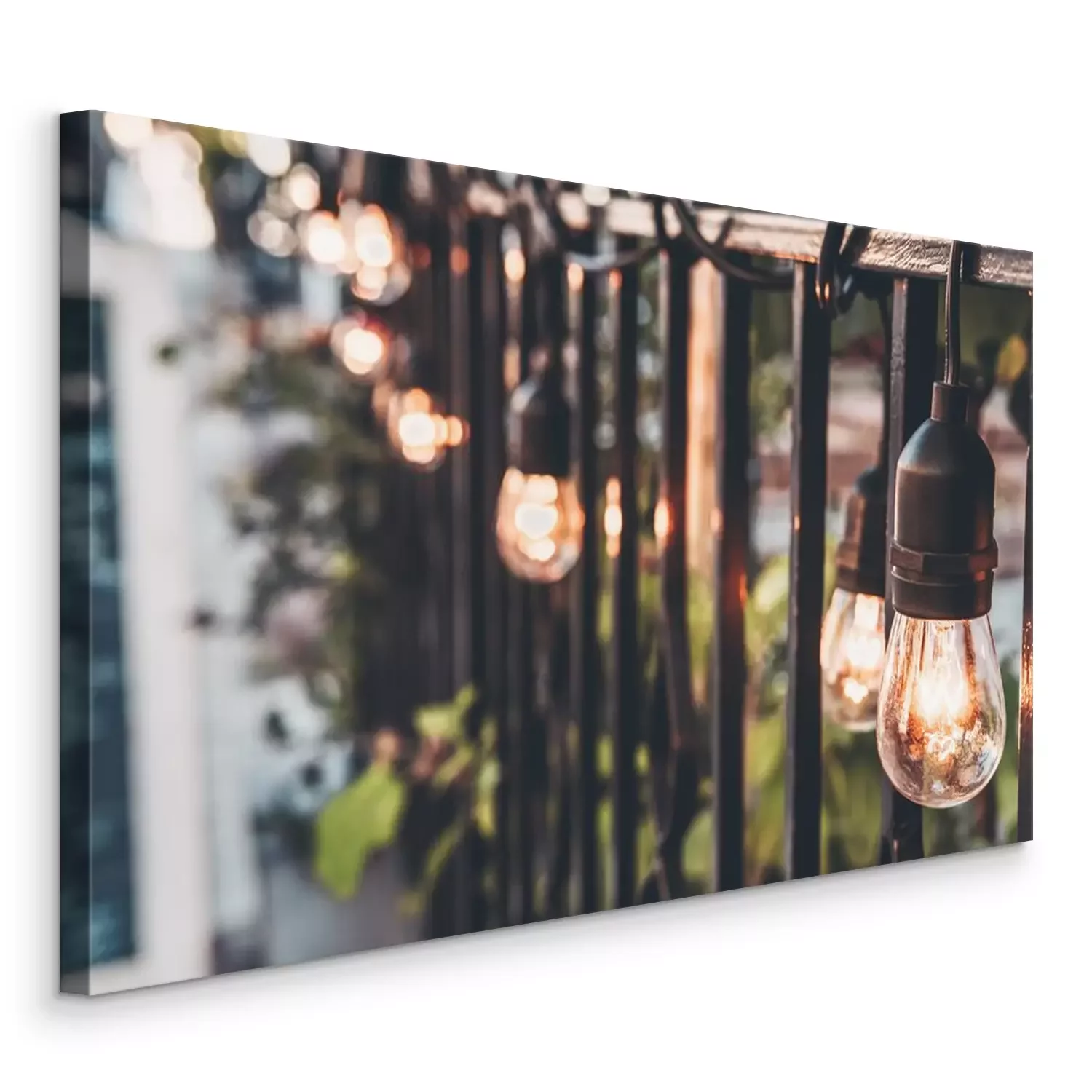 Canvas Trendy soft warm bulbs garland decoration on the metal fence. Street view, city retail and restaurant decor concept. Close up toned image with place for text