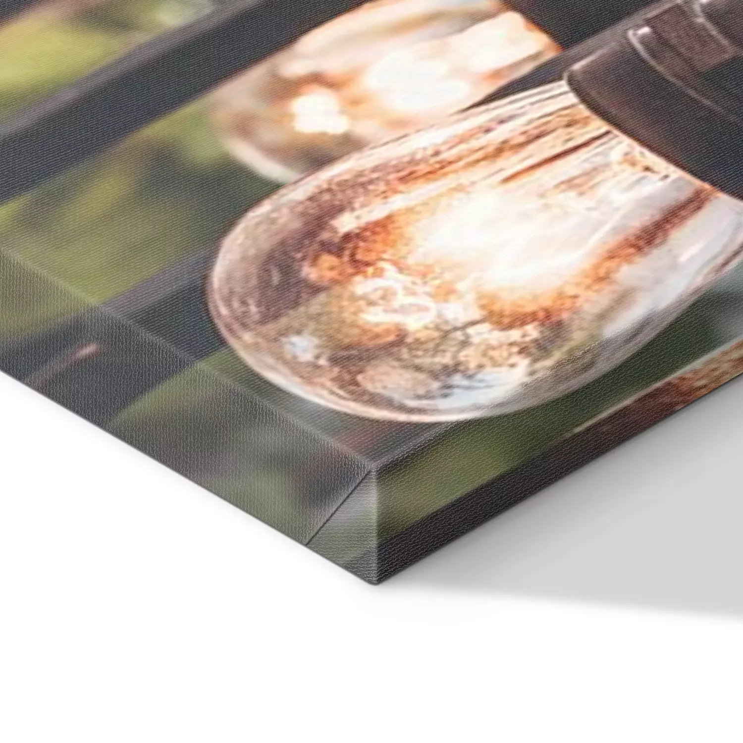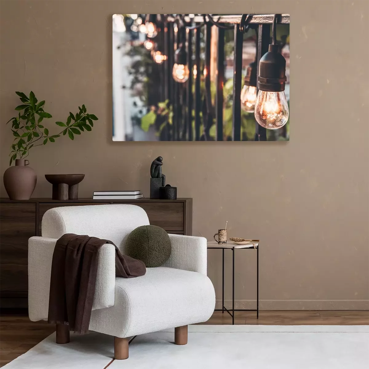 Canvas: Trendy soft warm bulbs garland decoration on the metal fence. Street view, city retail and restaurant decor concept. Close up toned image with place for text