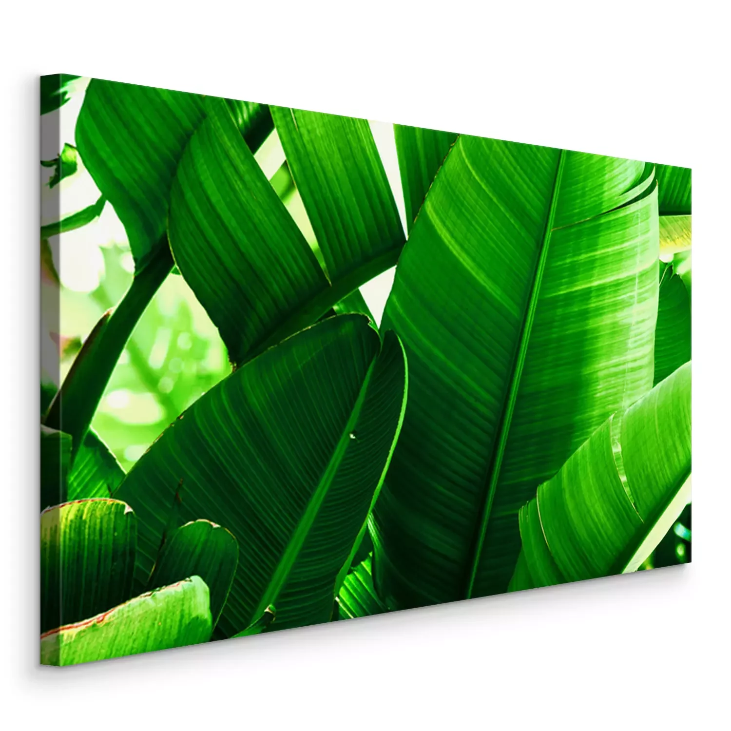 Canvas Tropical nature greenery background. Thicket of palm trees with big leaves. Saturated vibrant emerald green color. Beautiful botanical backdrop wallpaper pattern. Poster template with copy space