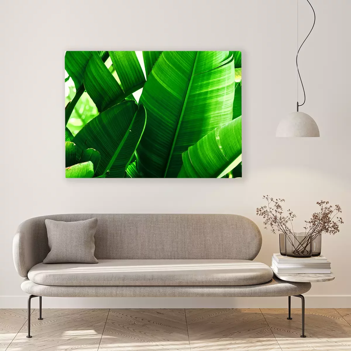 Canvas: Tropical nature greenery background. Thicket of palm trees with big leaves. Saturated vibrant emerald green color. Beautiful botanical backdrop wallpaper pattern. Poster template with copy space