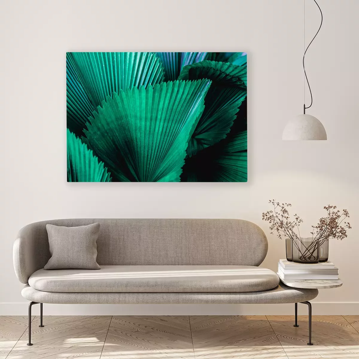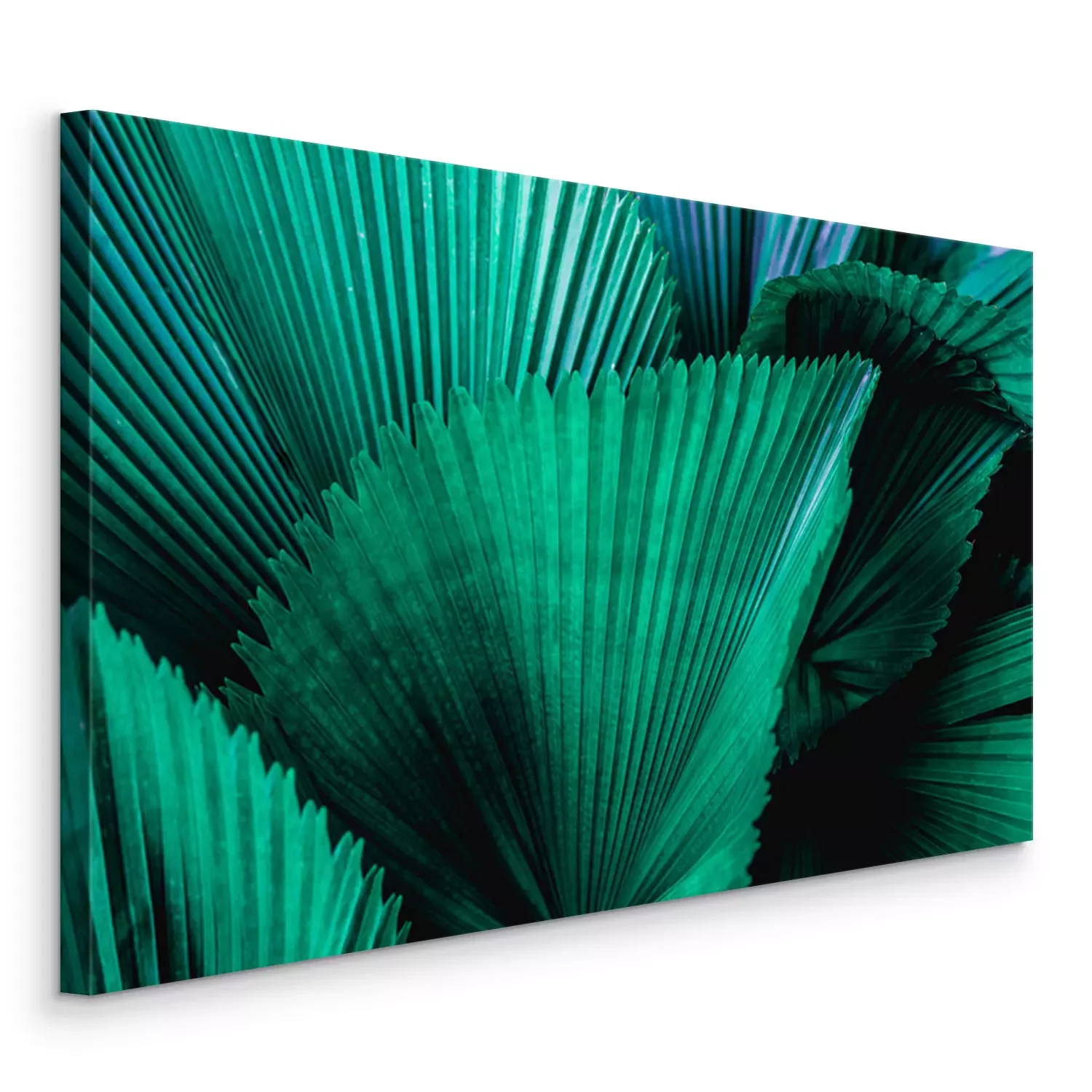 Canvas: Tropical palm leaf and shadow, abstract natural green background, dark blue tone