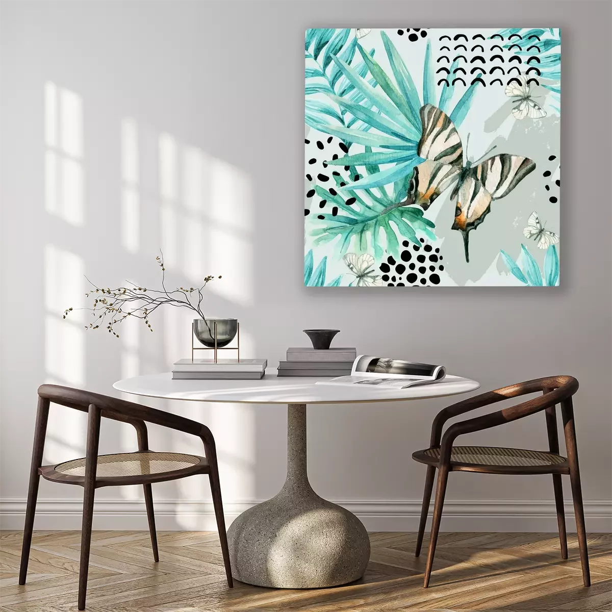 Tropical watercolor leaves, turned edge geometric shapes, terrazzo flooring elements collage