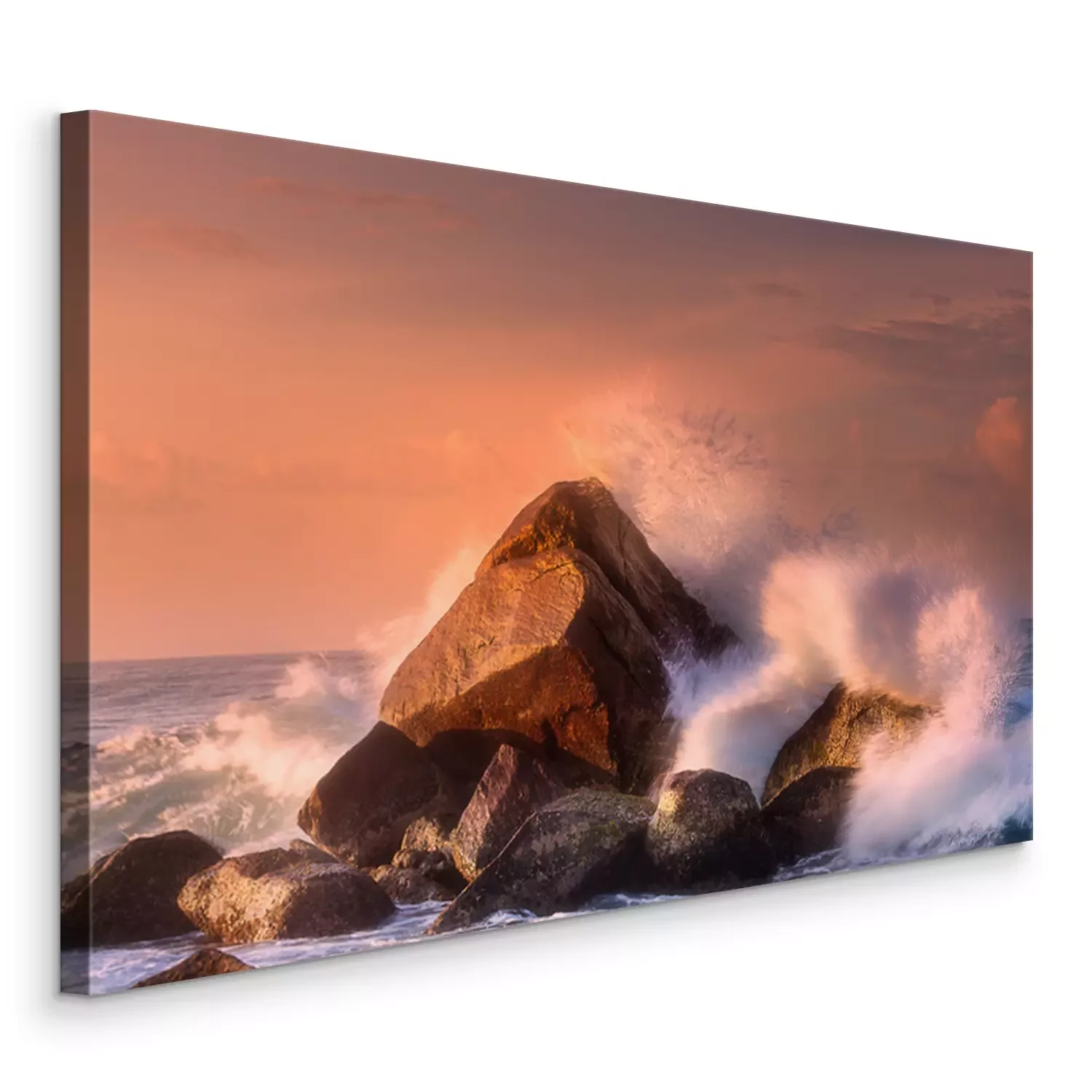 Canvas: Tropisch strand met rotsen en grote beukende golven