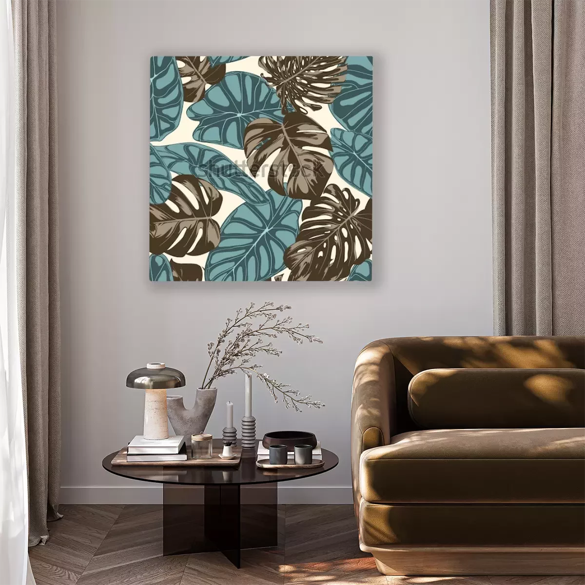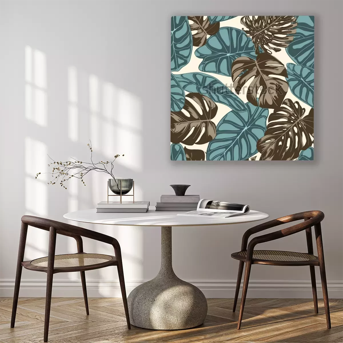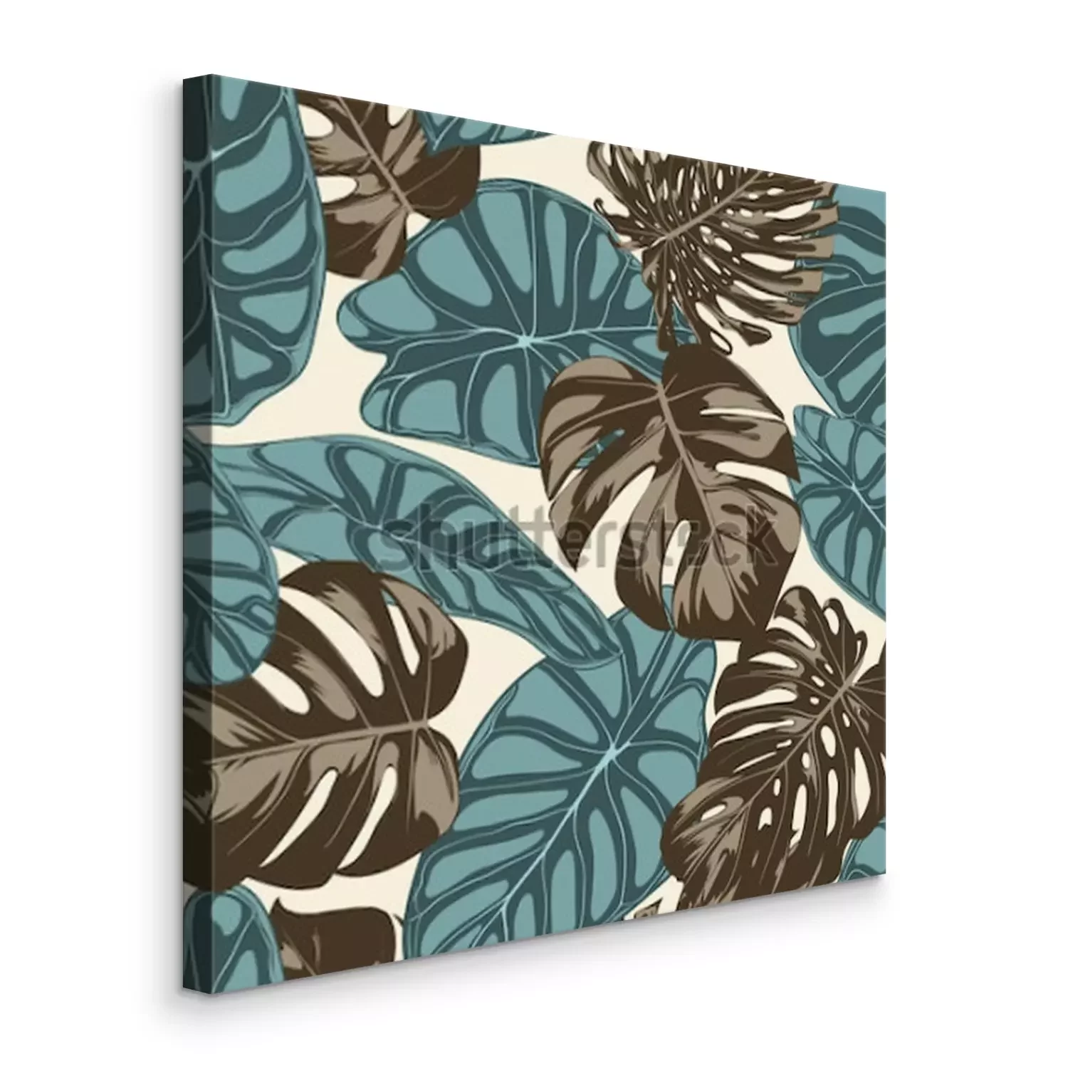Canvas: Tropische Bladeren. Naadloos patroon met hand getrokken bladeren van Monstera en Alocasia. Exotische Rapport voor textiel, stof. Vector naadloze achtergrond met tropische planten. Jungle gebladerte. A
