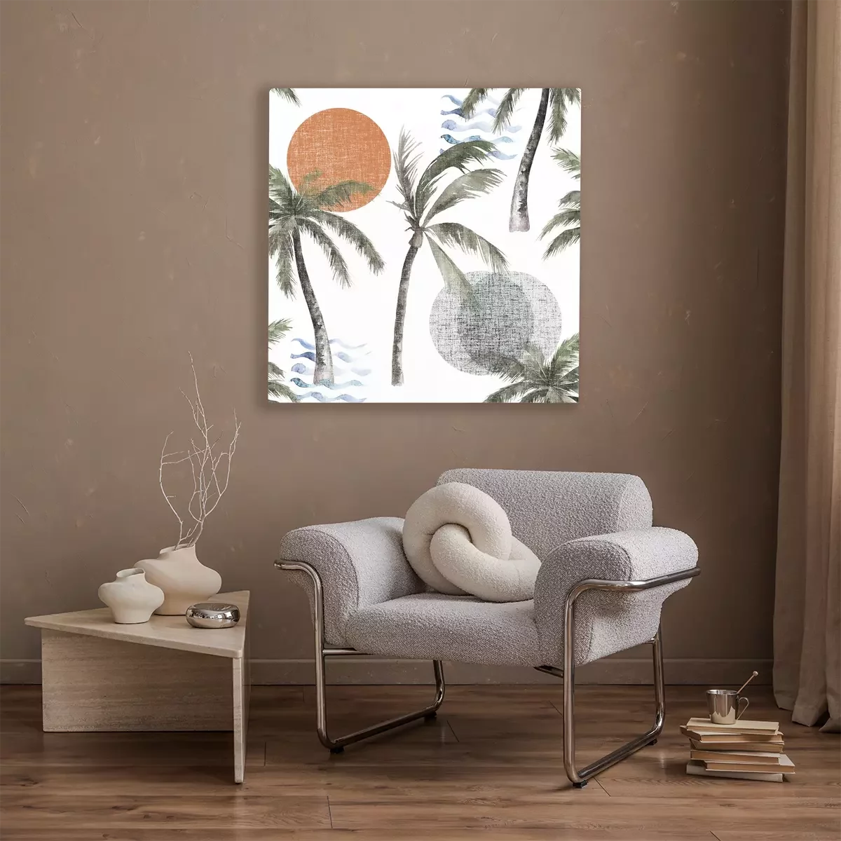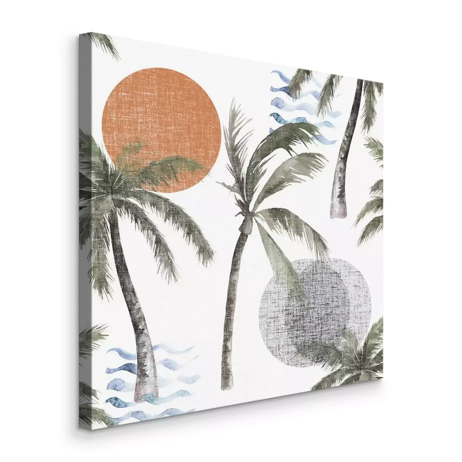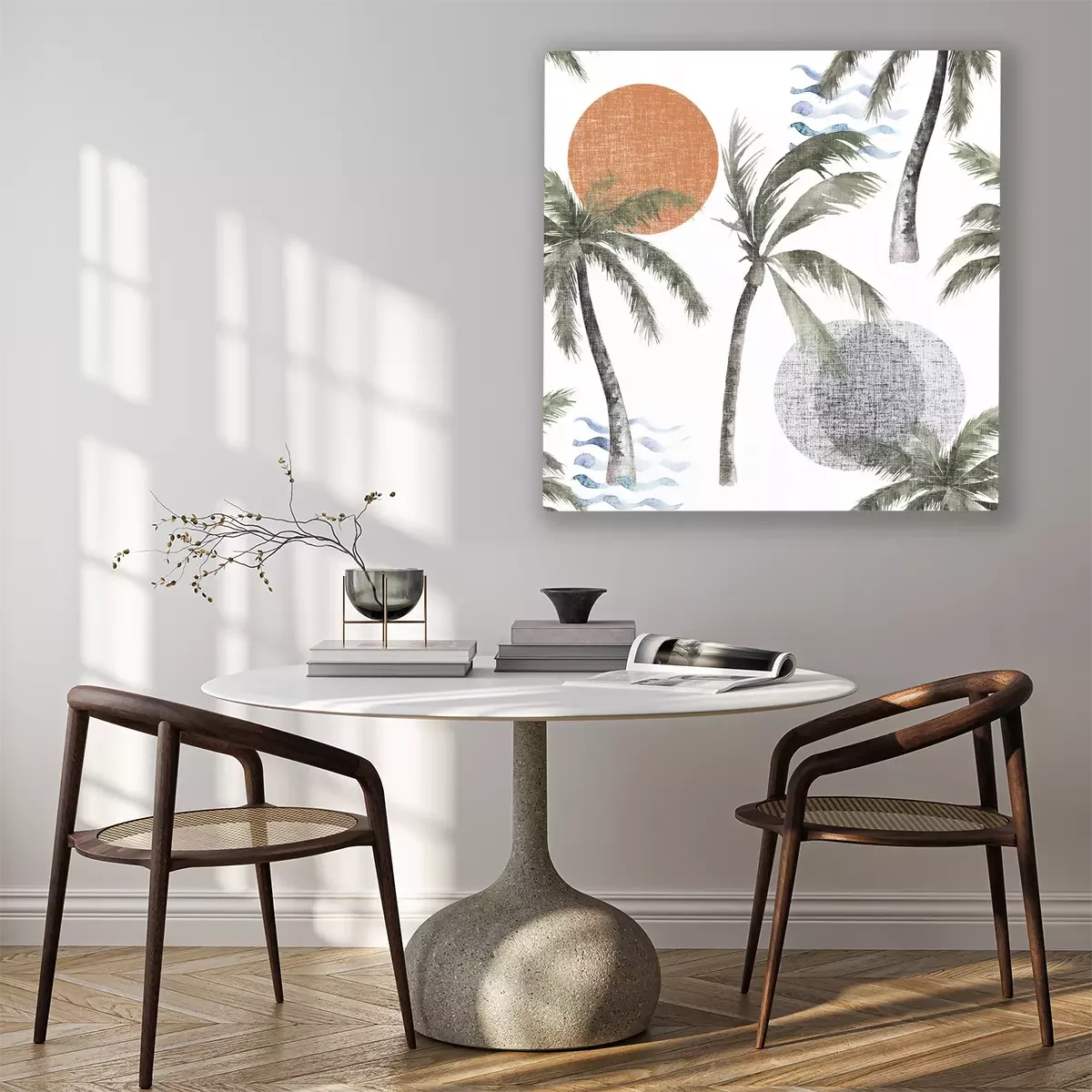 Canvas: Tropische palmbomen en zon geschilderd in aquarel