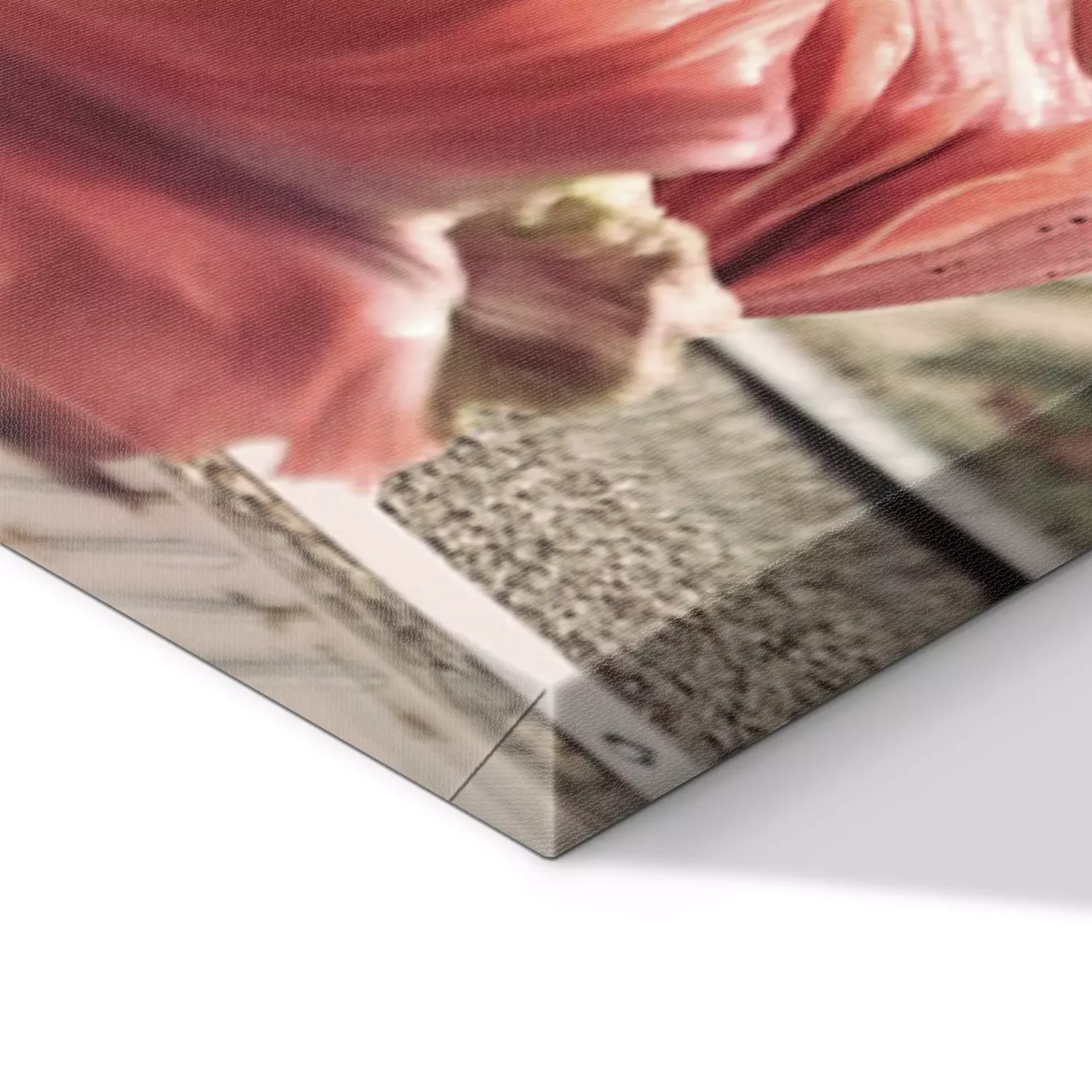 De print wordt aangebracht op hoogwaardig canvas dat op een schildersweefgetouw (spieraam) wordt gespannen. Omdat de print de zijranden bedekt, hoeft het ontwerp niet met een extra kader te worden omlijst. Wij raden ook composities aan die uit meerdere foto's bestaan en zo een coherente compositie vormen.