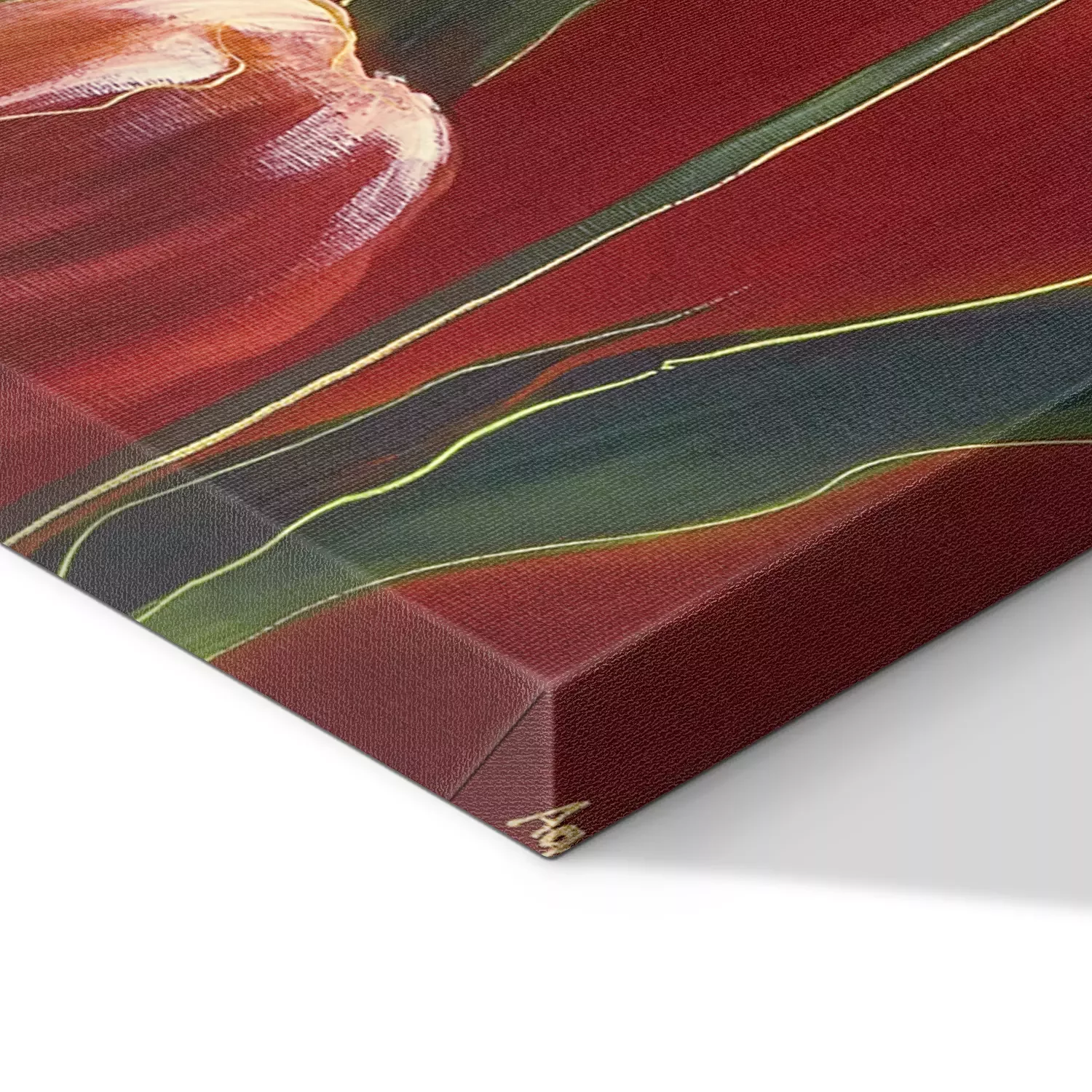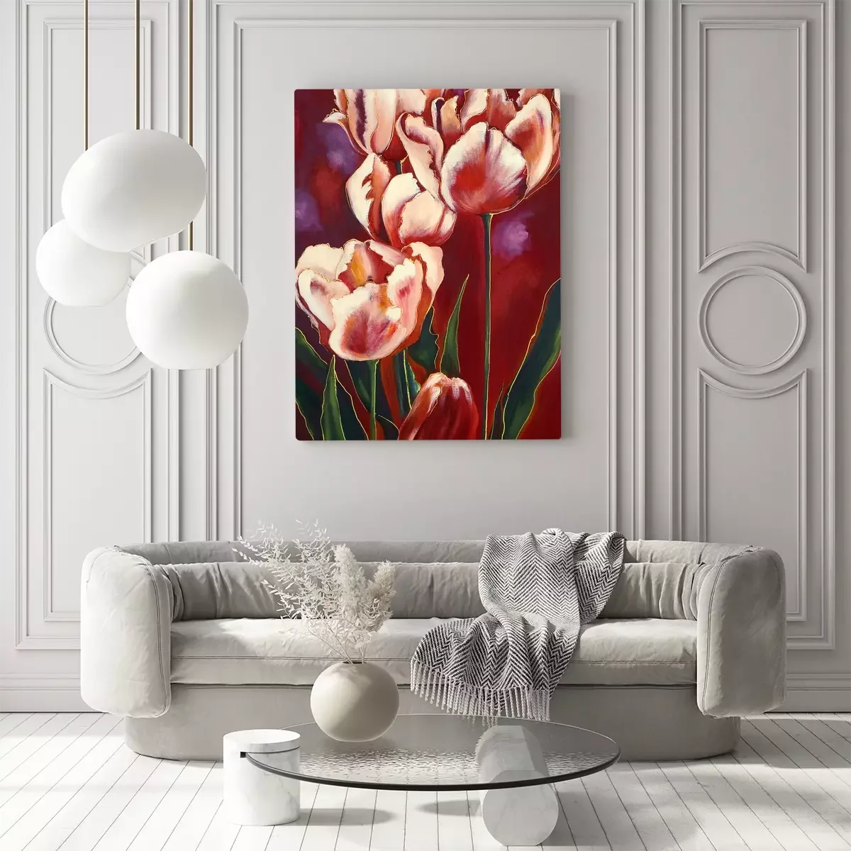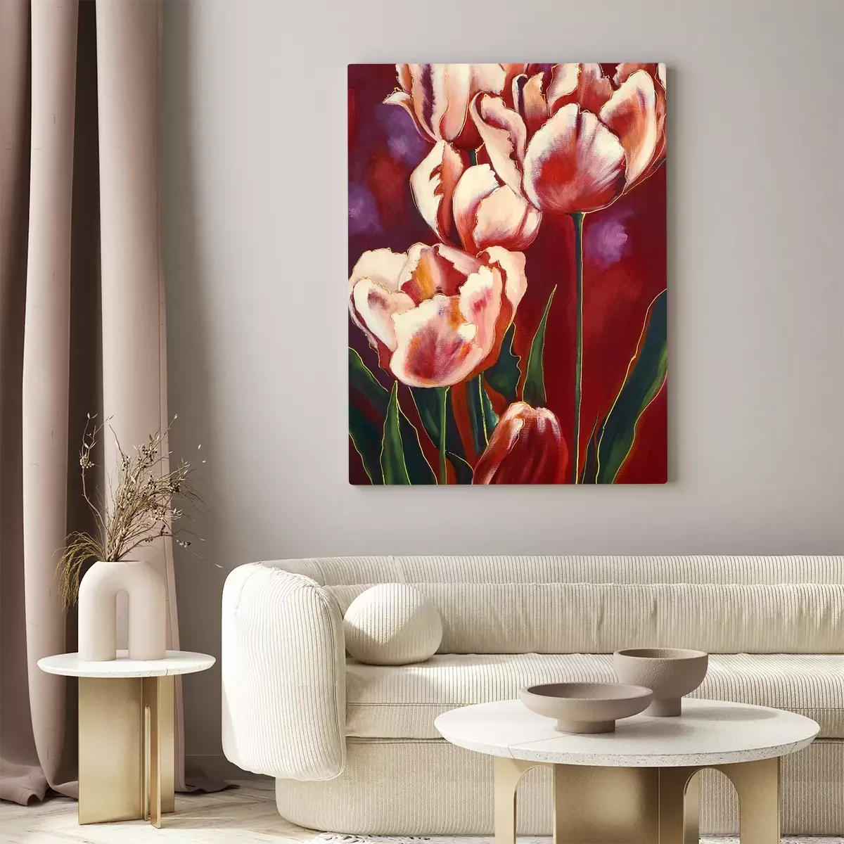 Tulpen op een bordeauxrode achtergrond in een artistieke stijl