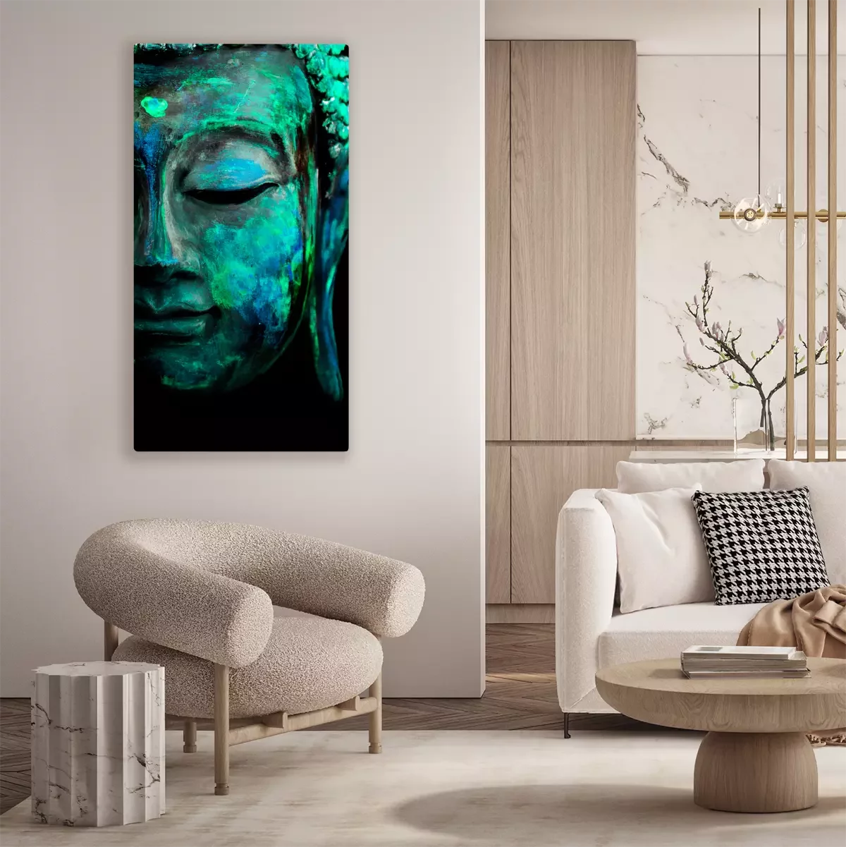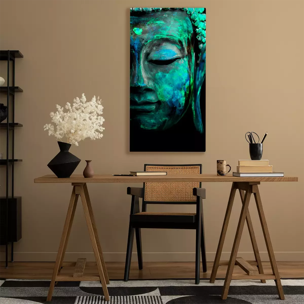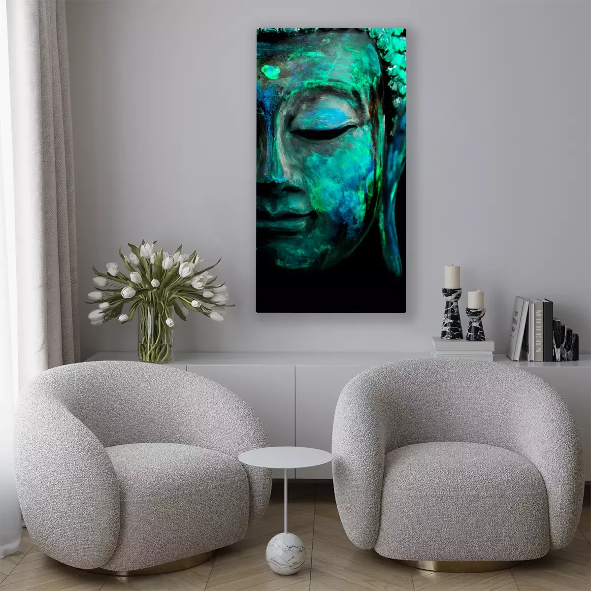 Turquoiseblauw halfprofiel van boeddha op een zwarte achtergrond
