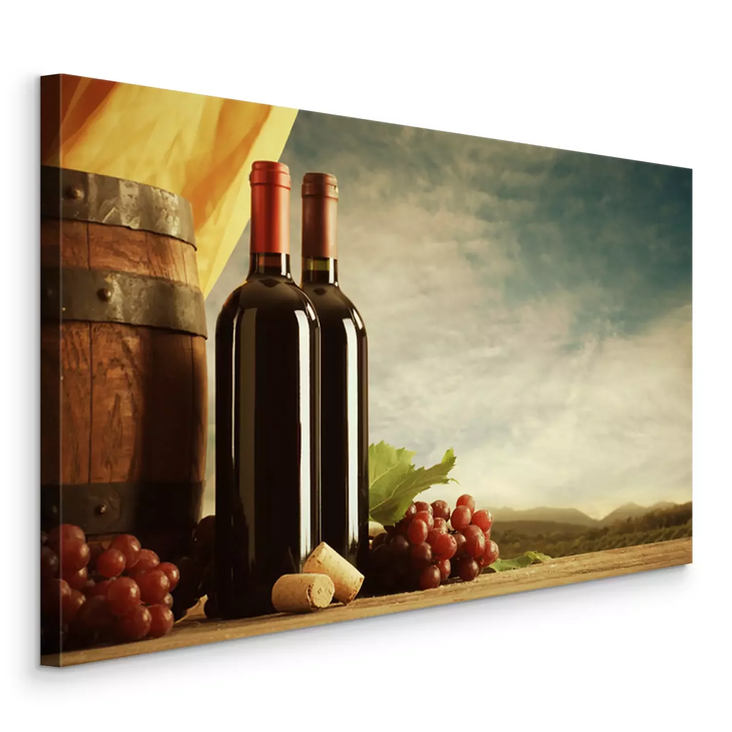 Canvas Twee flessen en een vat wijn