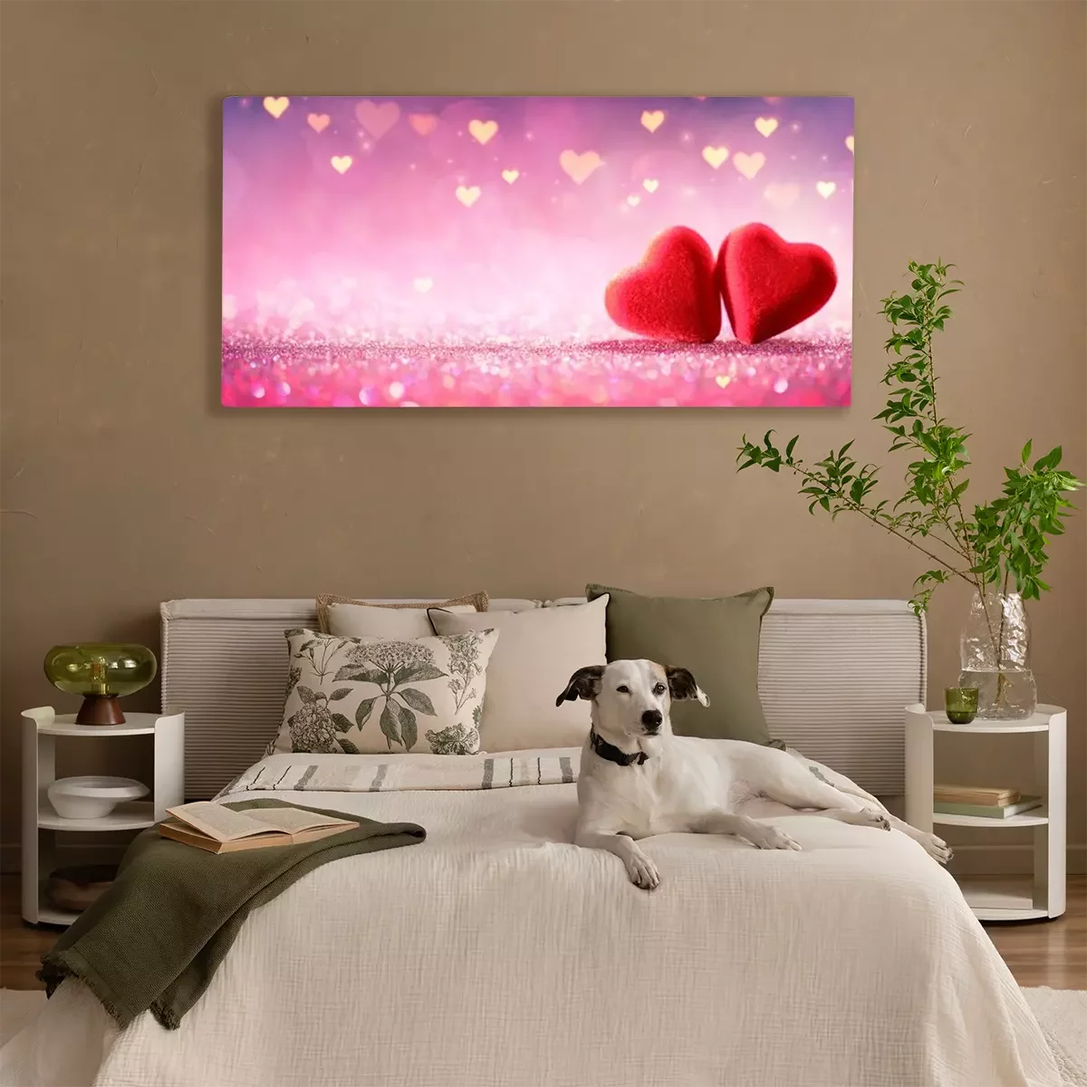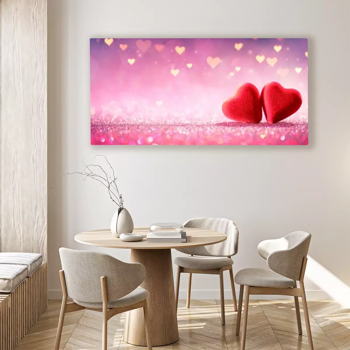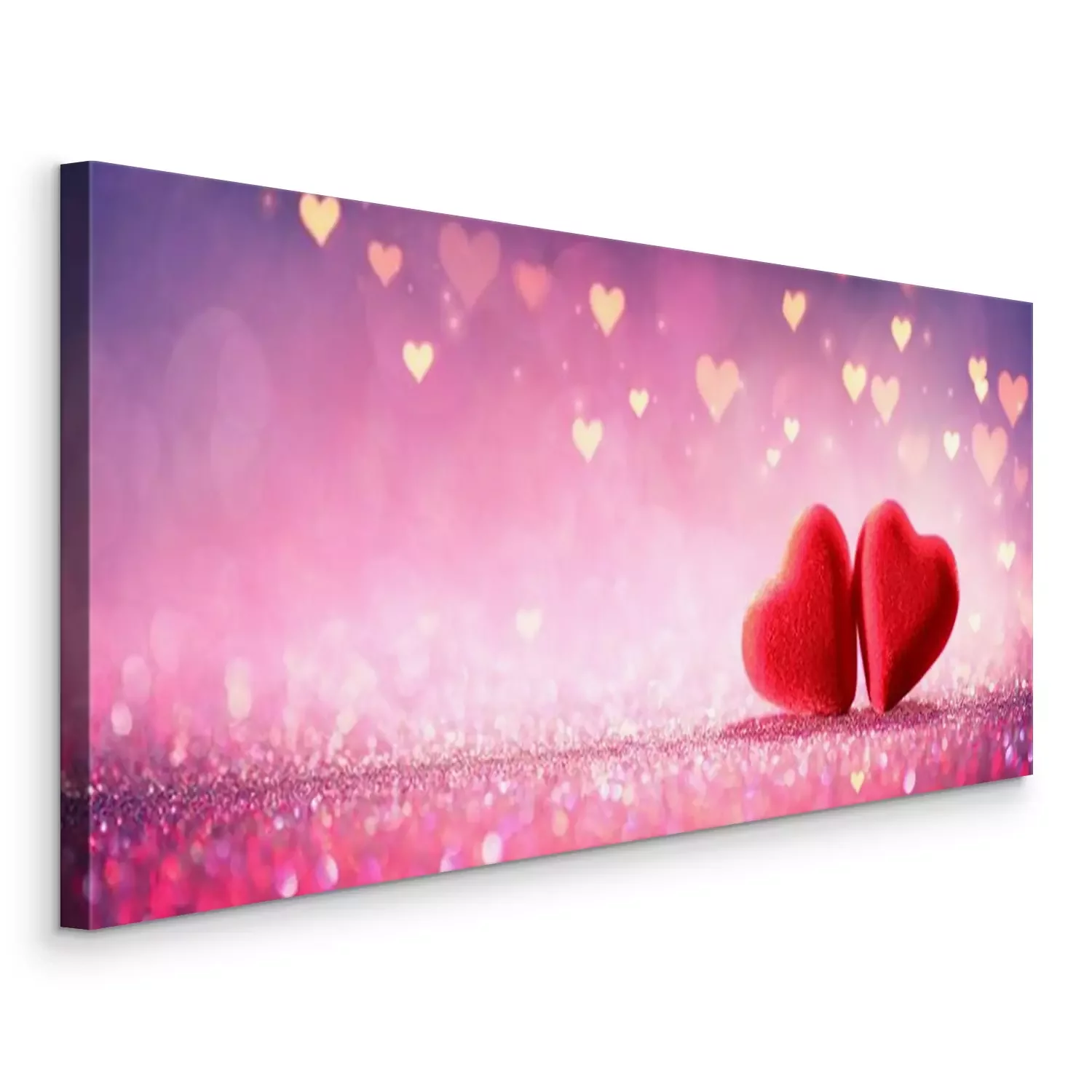 Canvas: Twee Harten op Roze schitteren op Glanzende Achtergrond - de Dagconcept van Valentine