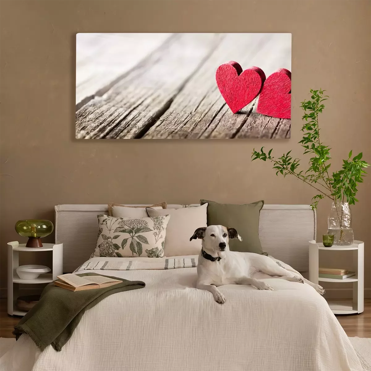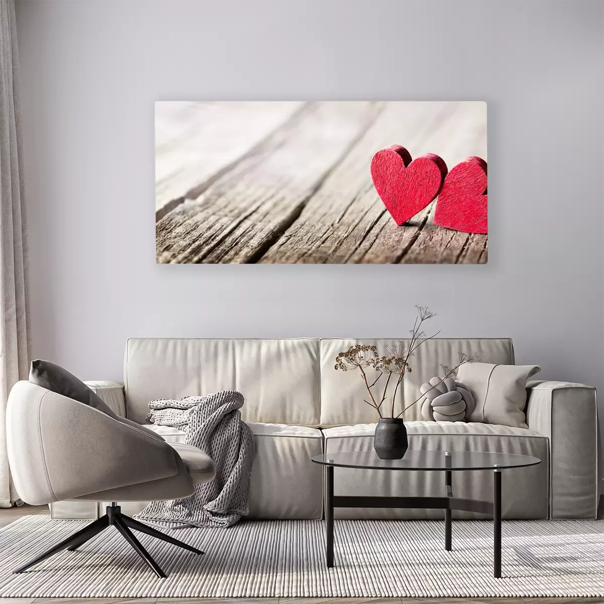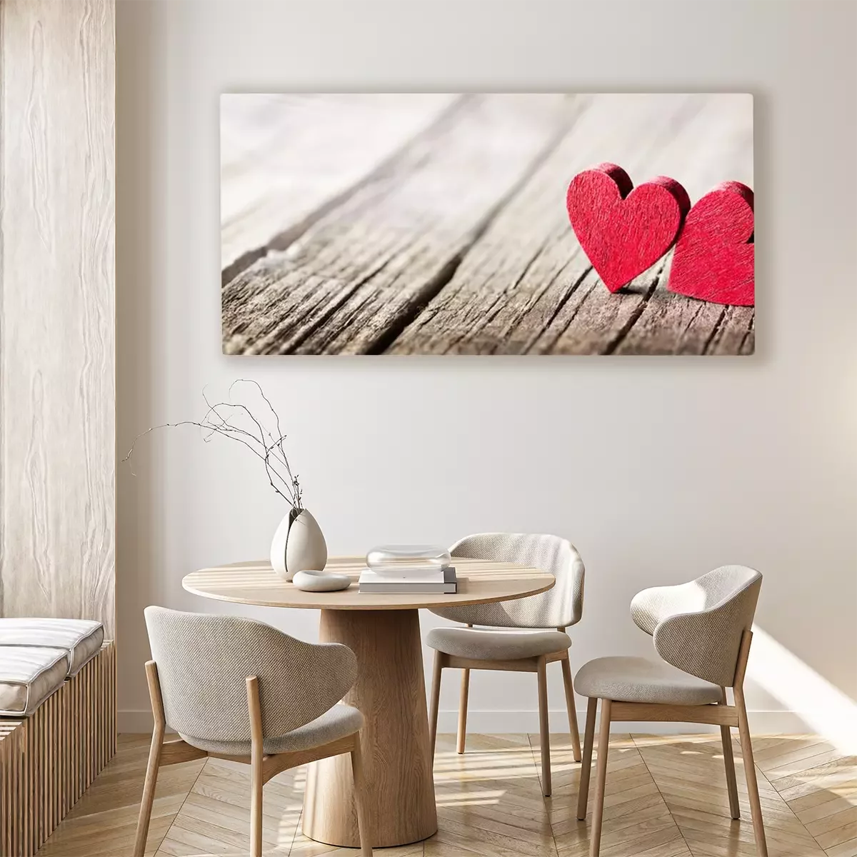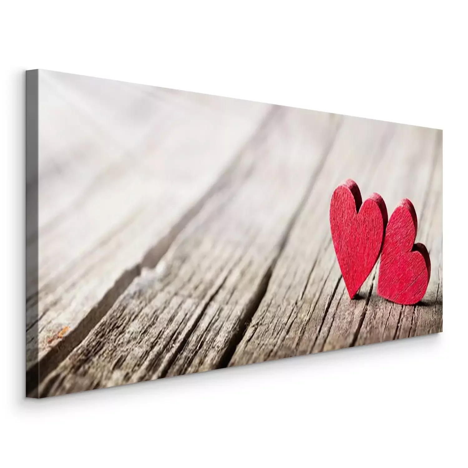 Canvas: Twee Houten Harten Op Rustieke Tafel Met Zonlicht