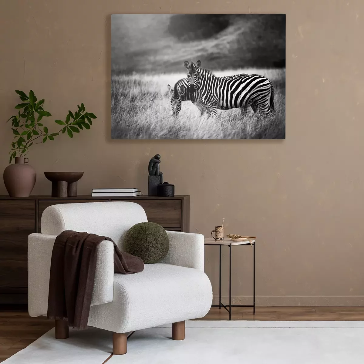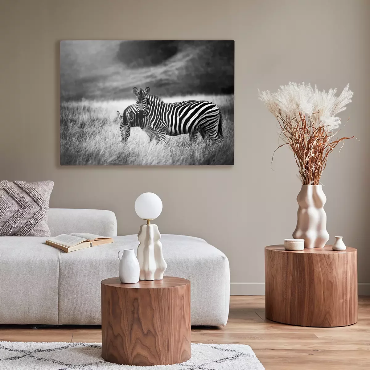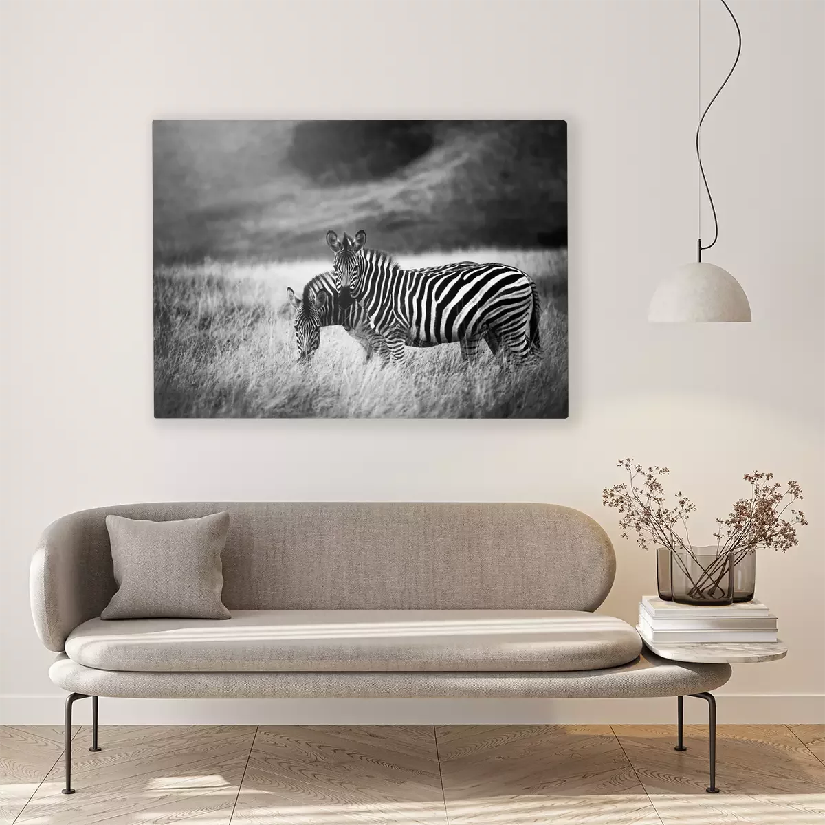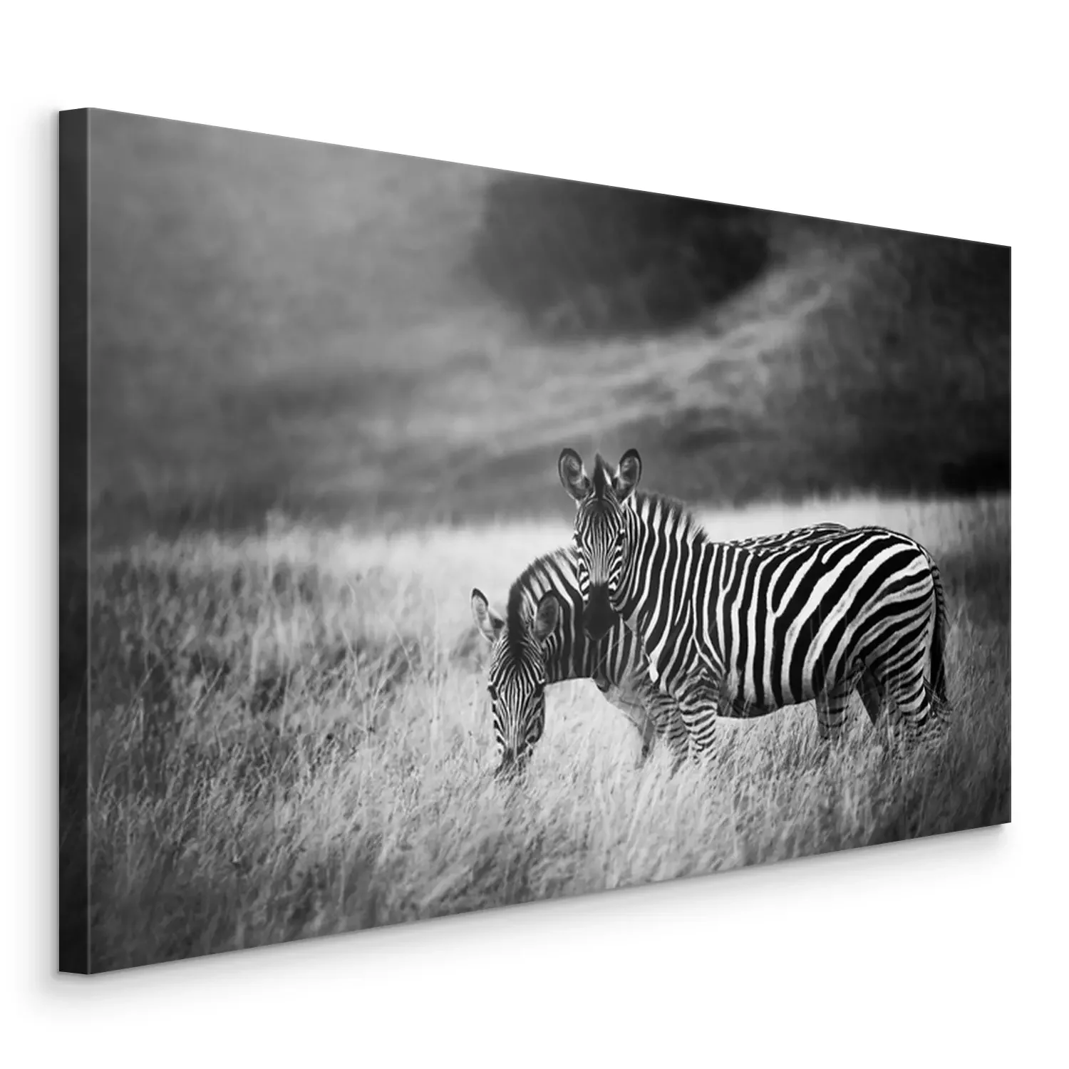 Canvas: Twee zebra's op een zwart-witte achtergrond