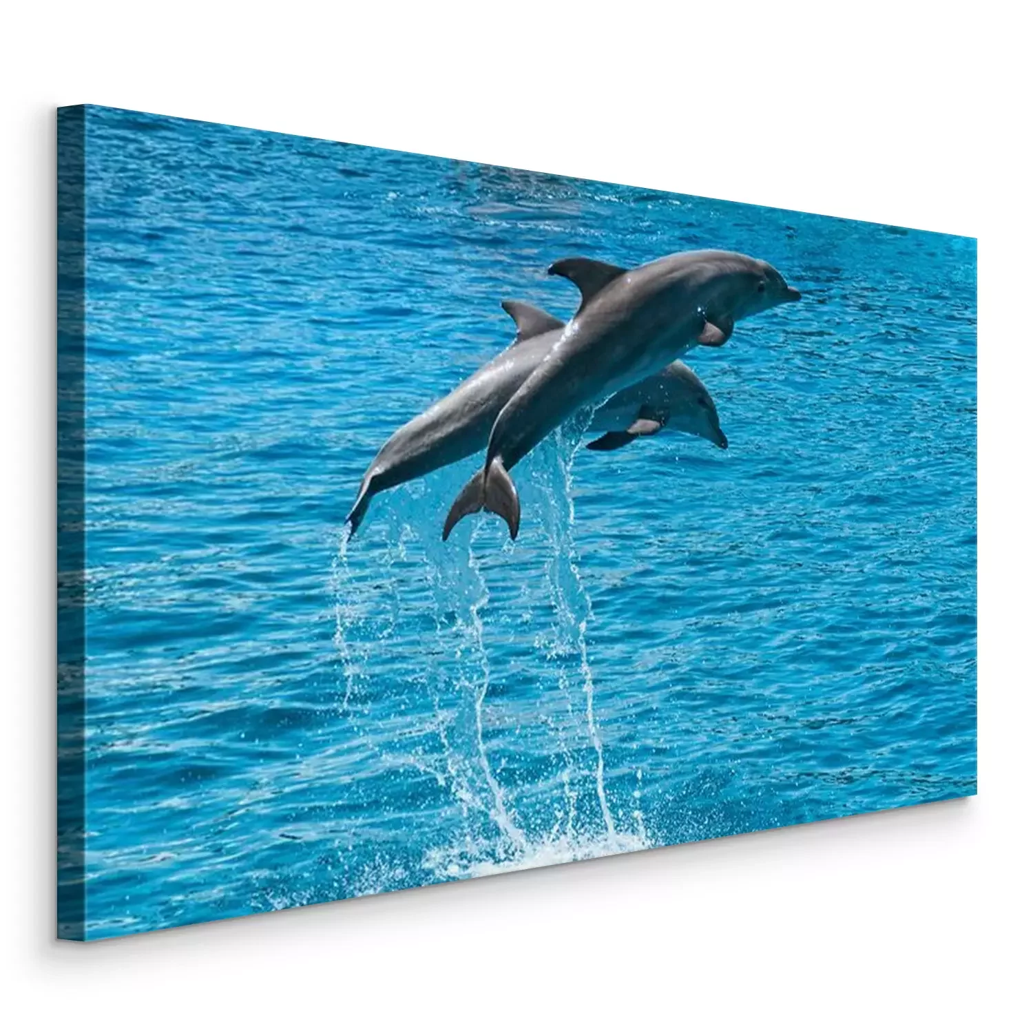 Canvas: Two dolphins jump above blue water