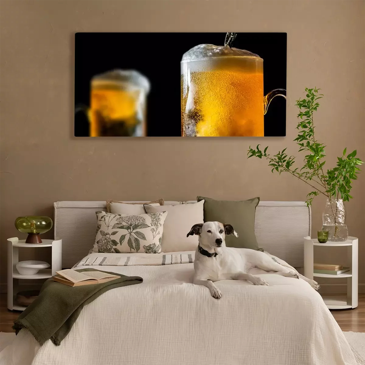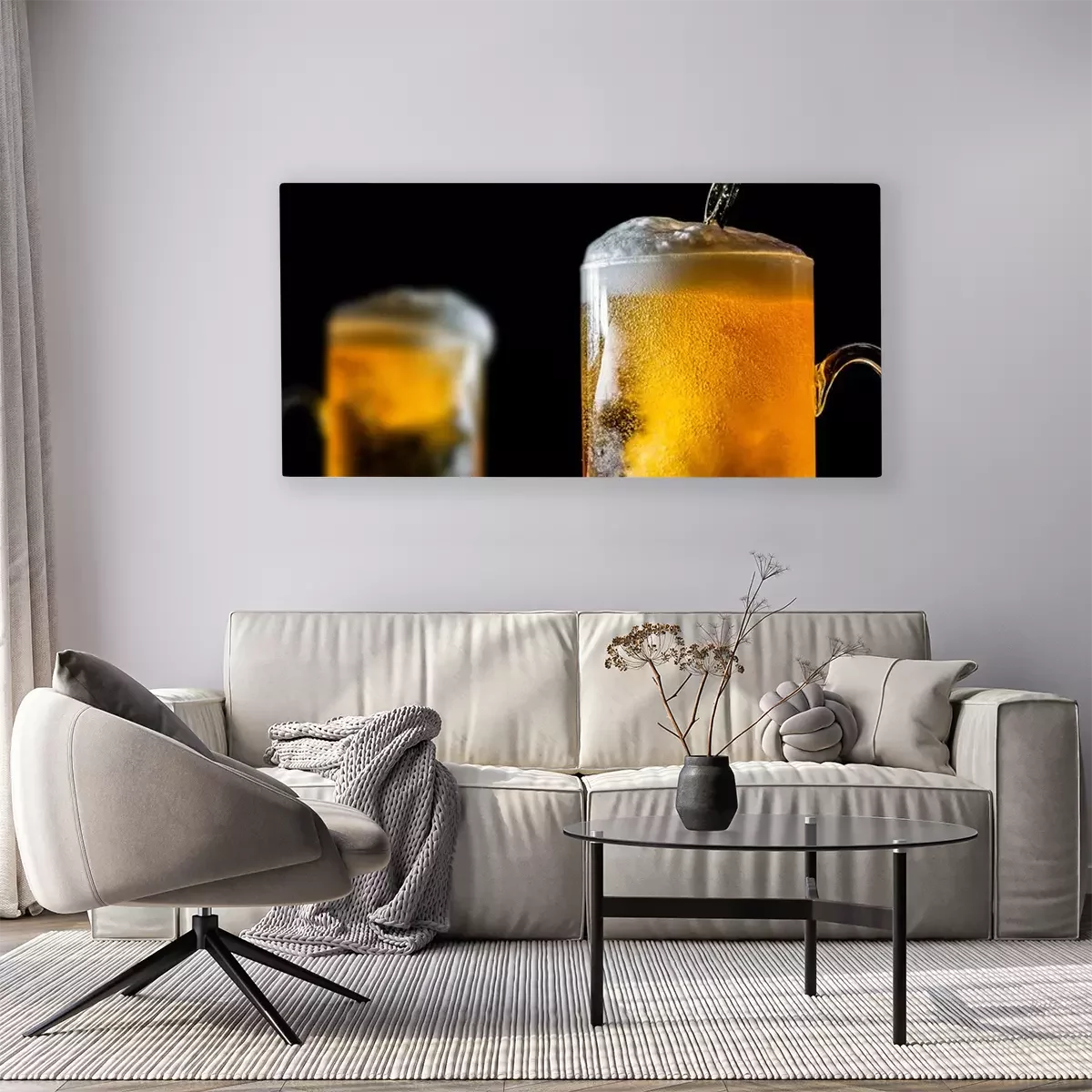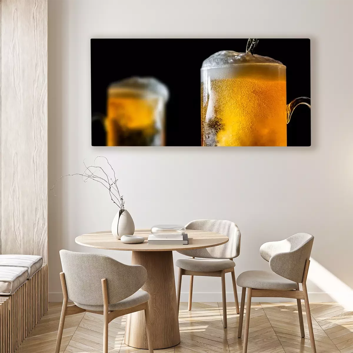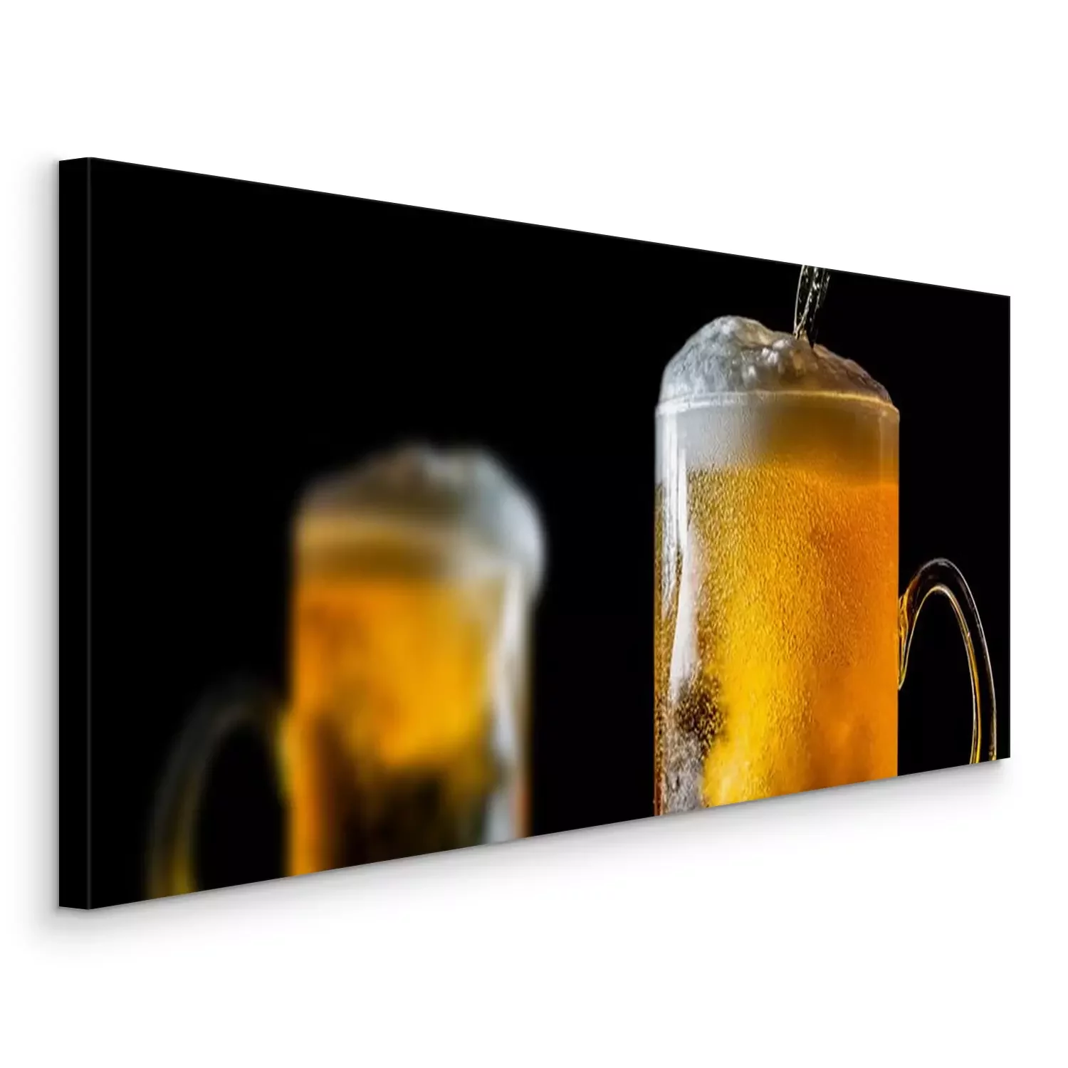 Canvas Two large glasses of beer with foam close-up, facing each other, isolated against a black background. Two overflowing glasses of beer with flowing foam.