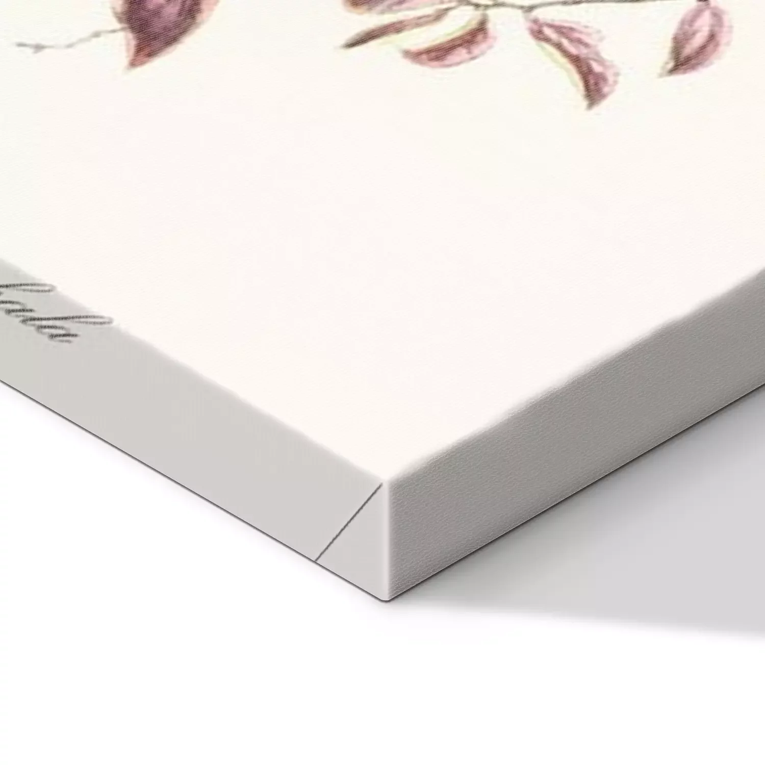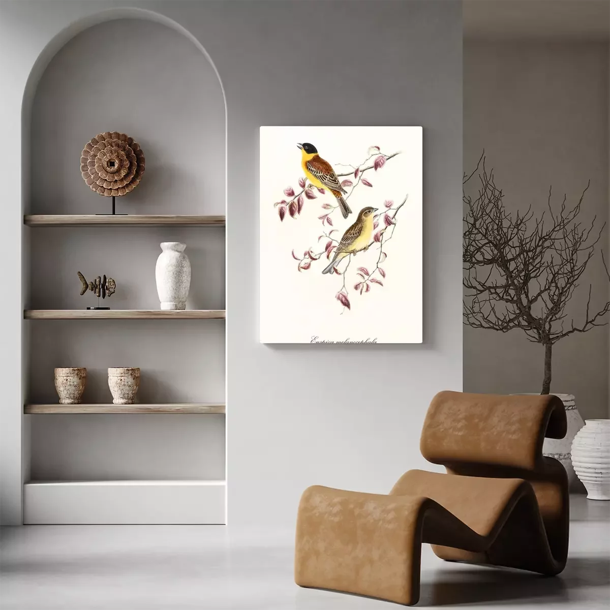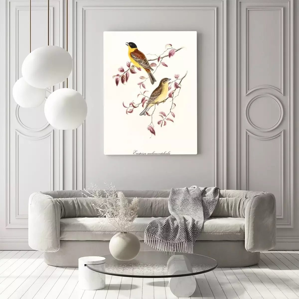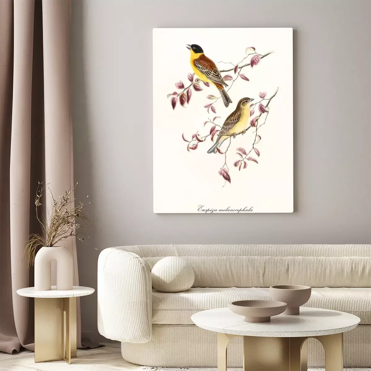 Canvas Two yellow tones birds on two isolated pinkyish leafed branches. Detailed hand colored old illustration of Black-Headed Bunting (Emberiza melanocephala). By John Gould publ. In London 1862 - 1873