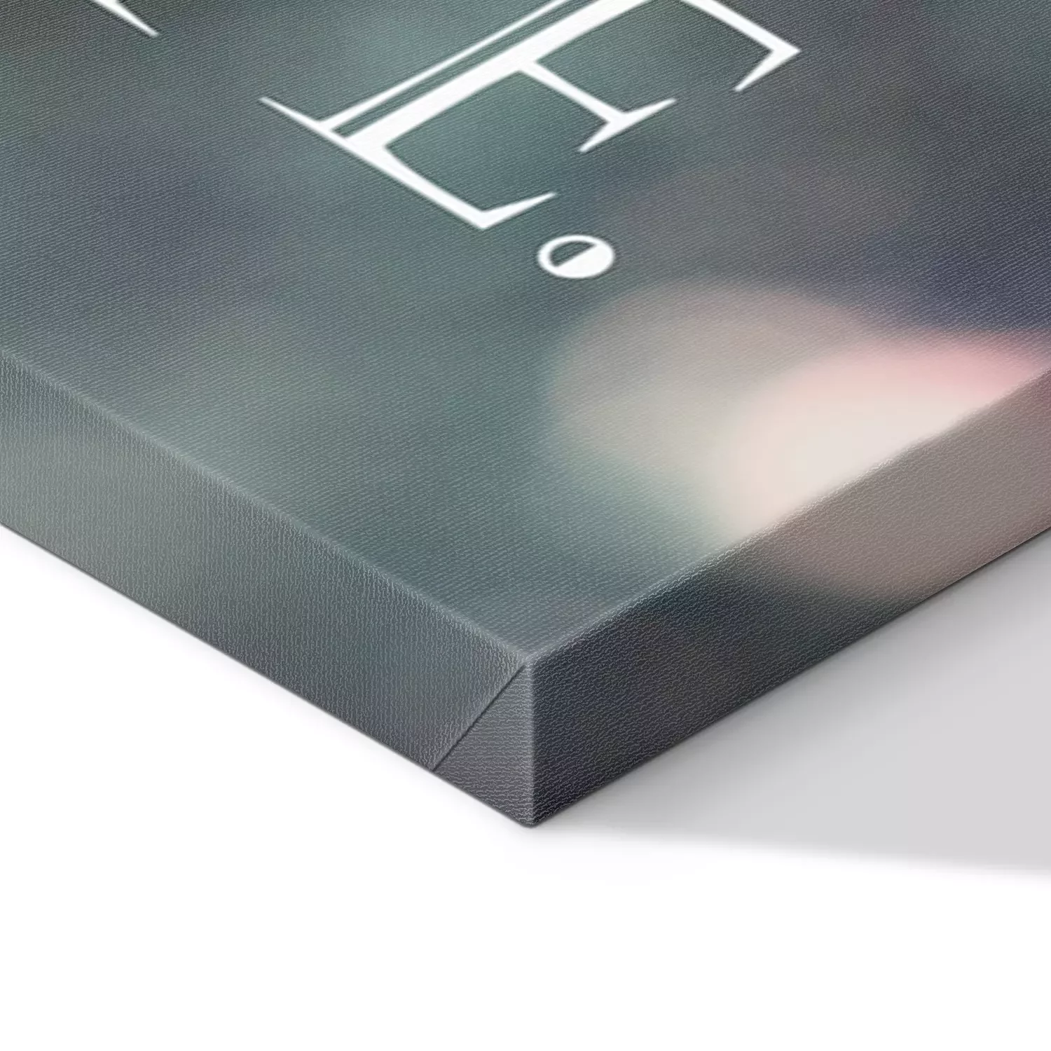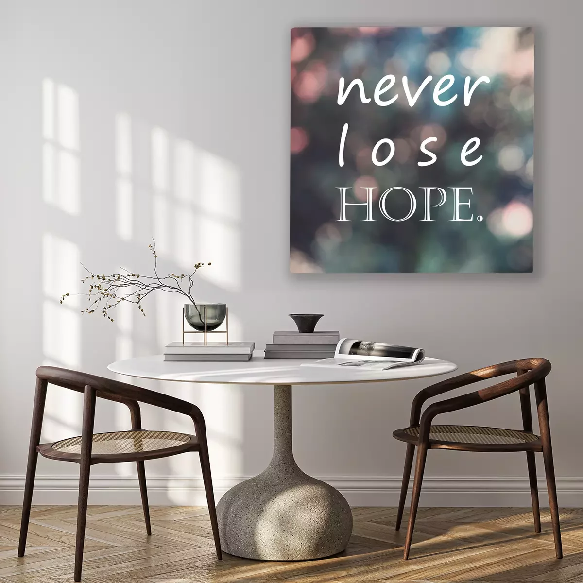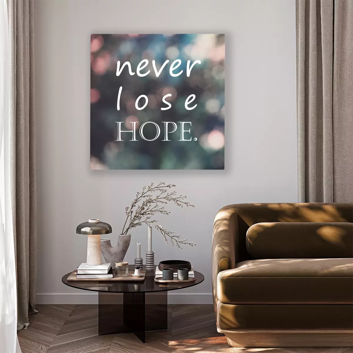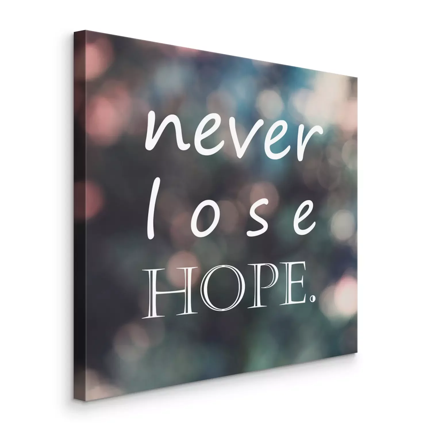 Canvas: typografie motieven leven citaat, "nooit de hoop verliezen" op blur achtergrond, kleur filter