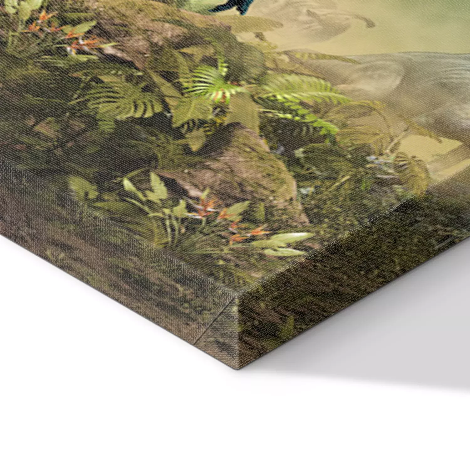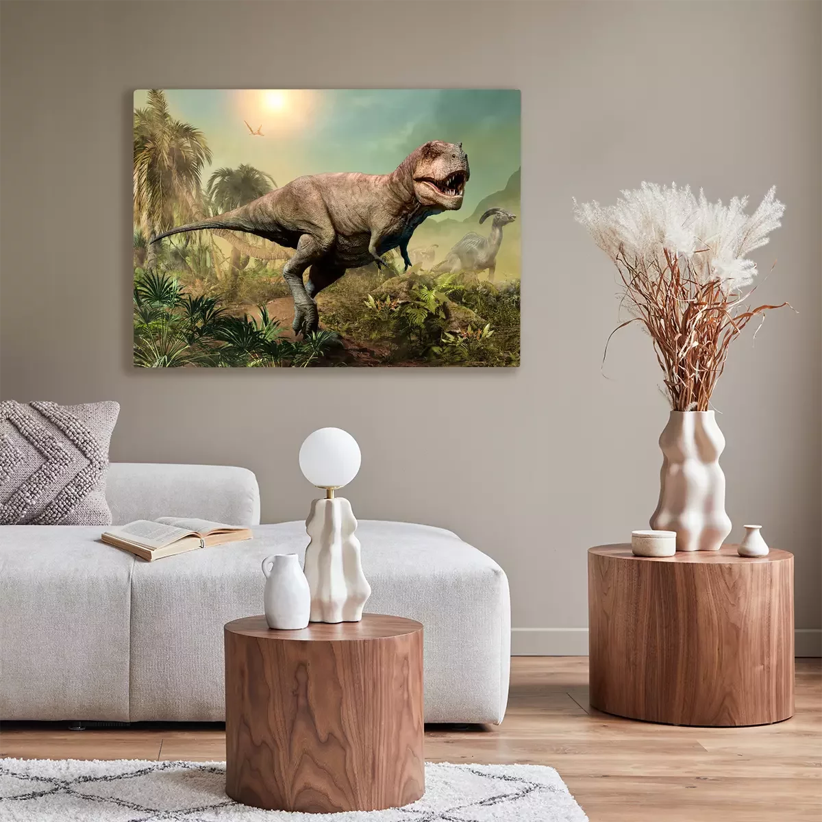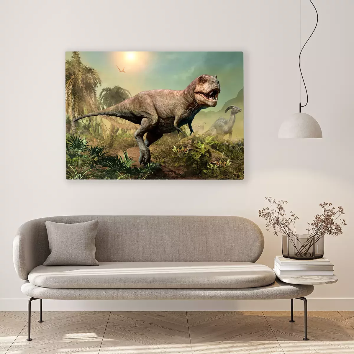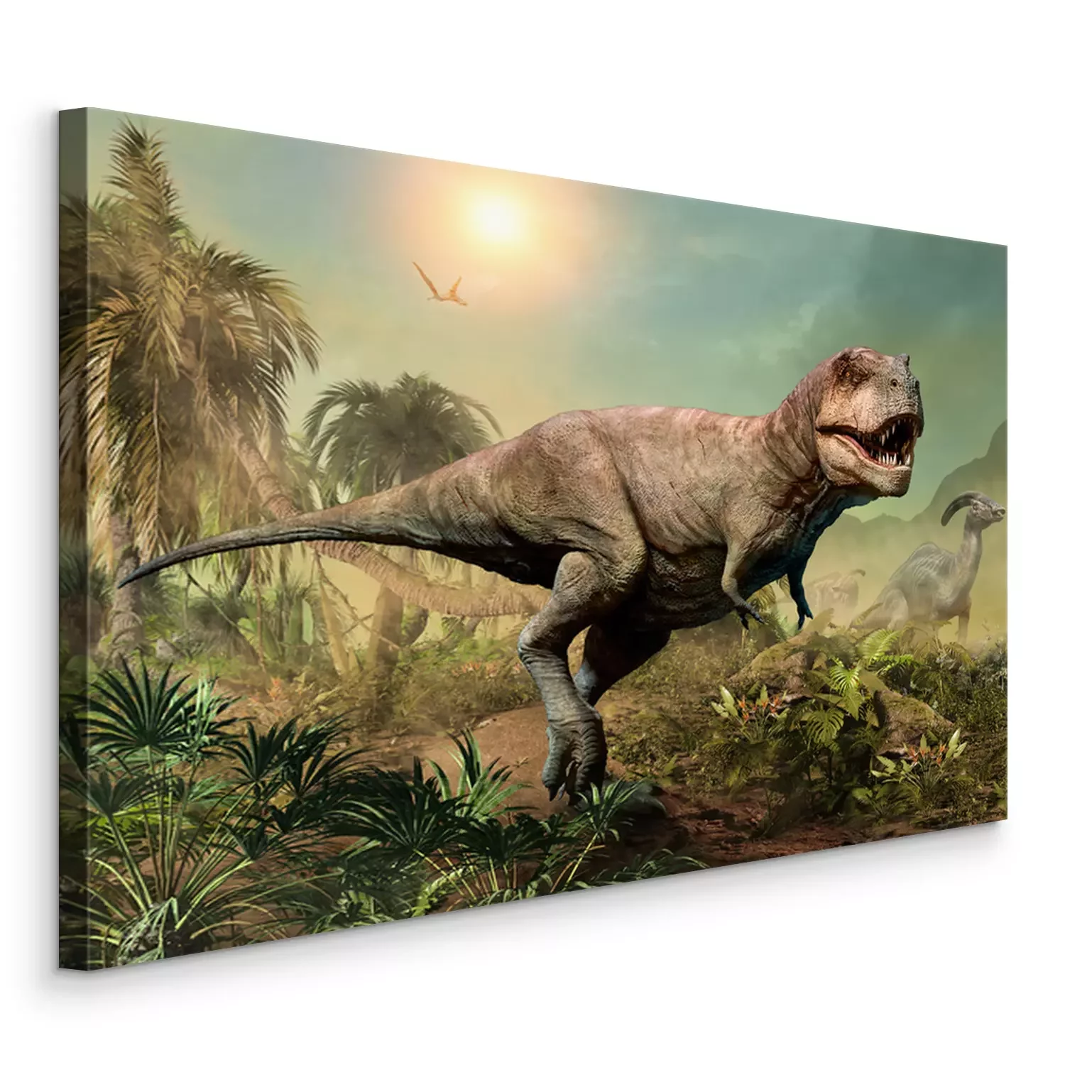Canvas: Tyrannosaurus Rex op een achtergrond met tropische vegetatie