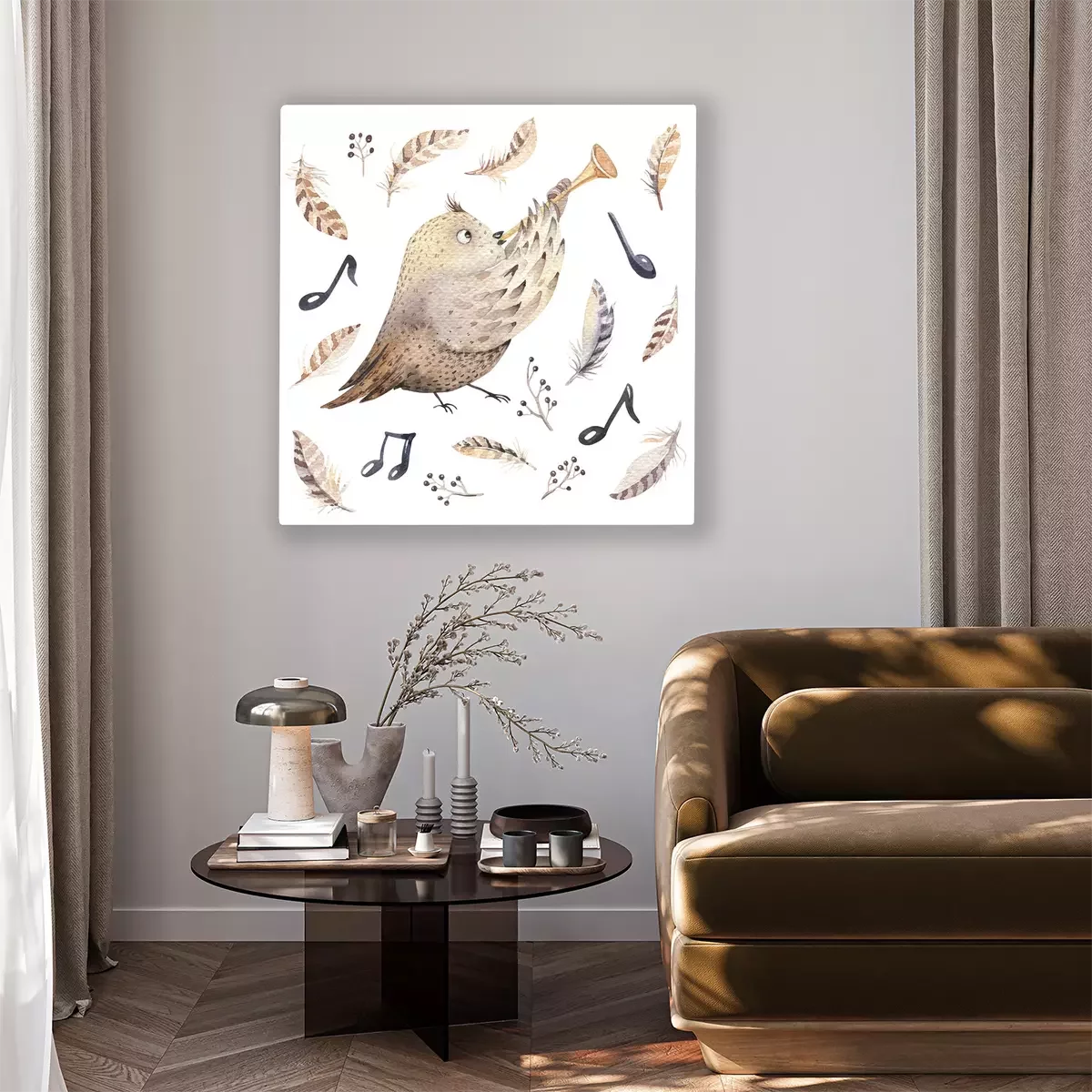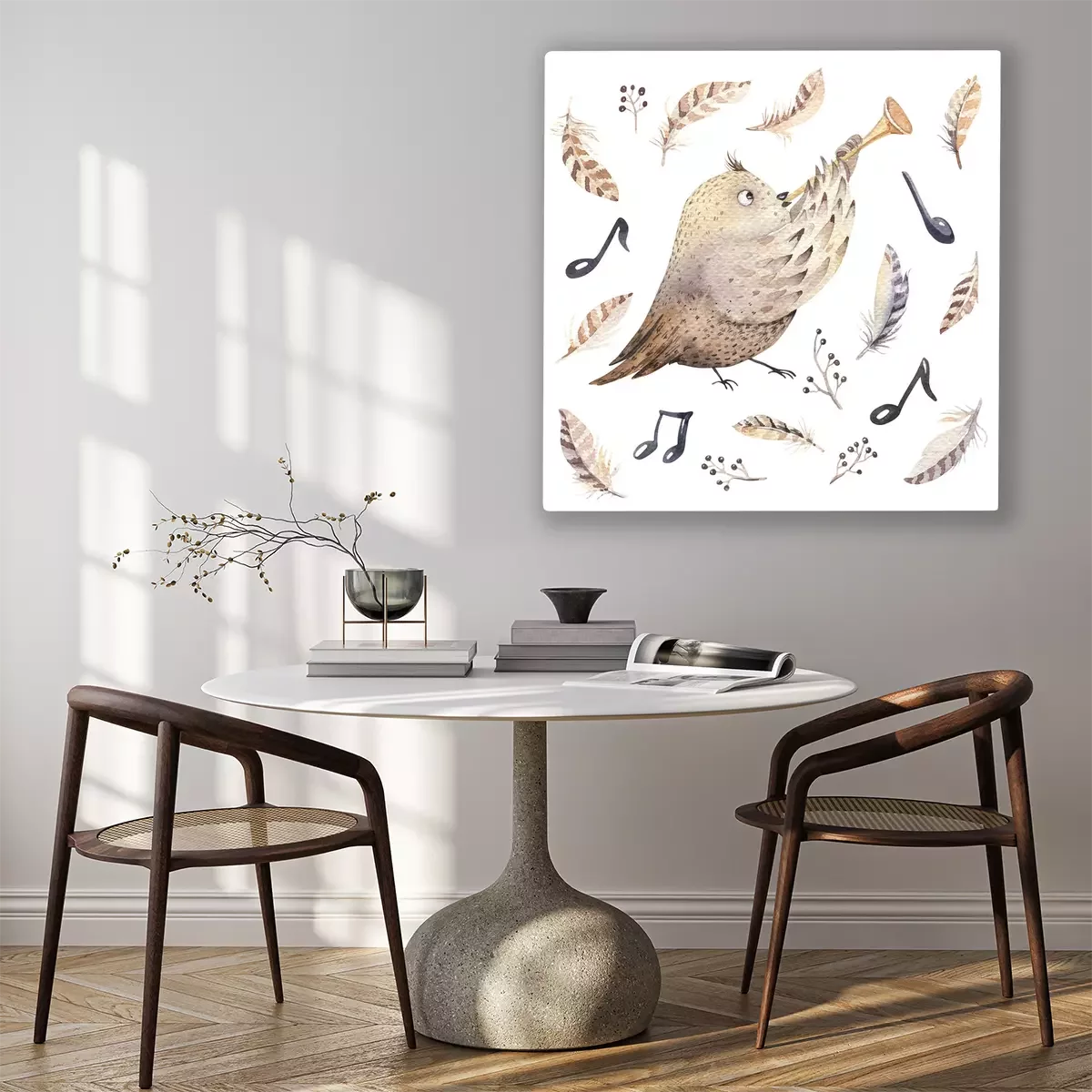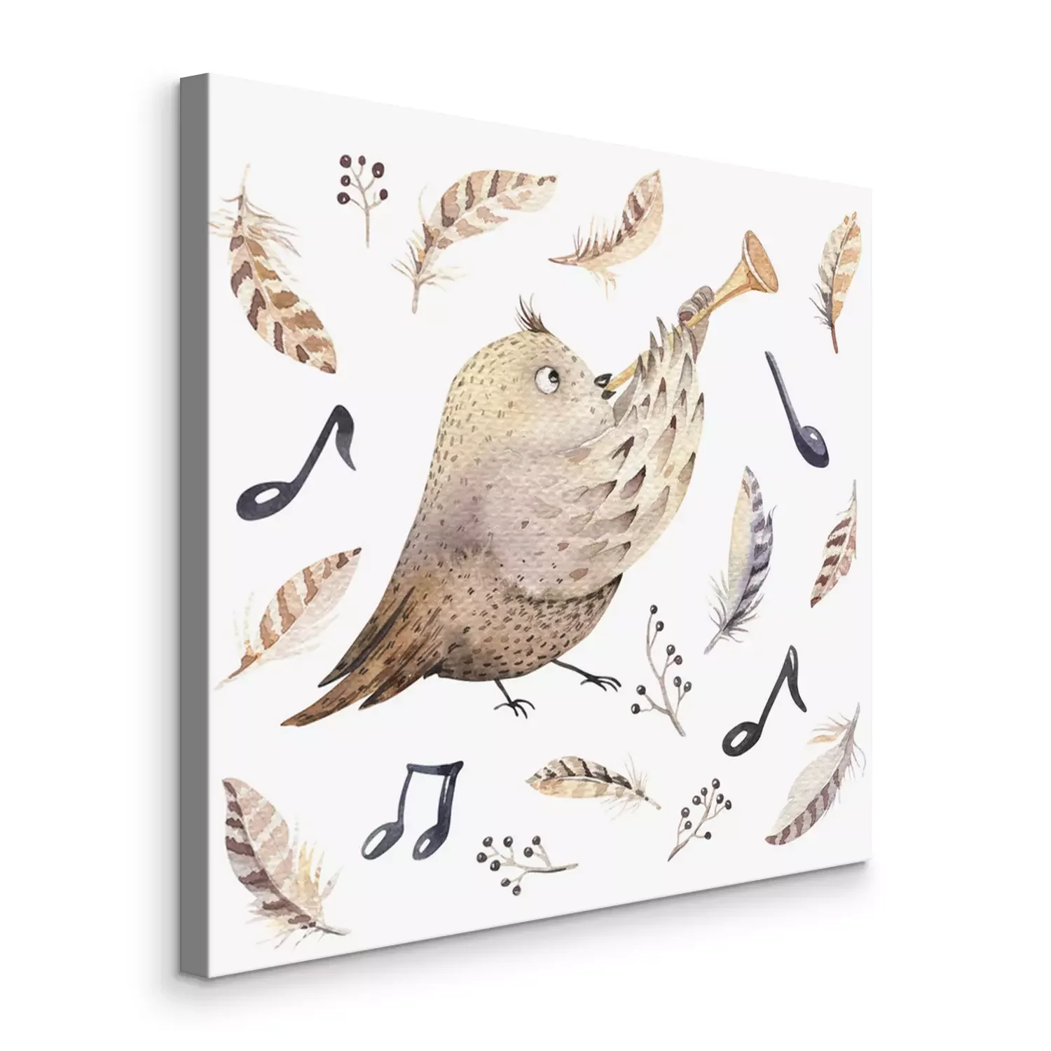 Een geweldig idee voor de inrichting van een kinderkamer zijn decoratieve elementen die aansluiten bij de passies van het kleintje. Op deze manier creëer je een inrichting die niet alleen perfect past bij het kind, maar ook zijn interesses weerspiegelt. Een uitstekend voorbeeld hiervan is een muzikaal canvas dat ideaal is voor kinderen die van zingen houden of een instrument bespelen. Zo'n sprookjesachtige illustratie zal het kind aanmoedigen en motiveren om zijn vaardigheden te oefenen. Wat het door ons gekozen canvas voor kinderen onderscheidt, is de uitzonderlijke esthetiek. De illustratie lijkt op een aquarelschilderij, waardoor het ontwerp een delicate en artistieke uitstraling heeft. Een belangrijk aspect is ook dat het een universeel canvas is. Uil die trompet speelt, omringd door veertjes en muzieknoten die in de lucht zweven, past zowel in de kamer van een jongen als van een meisje. Het is een decoratief motief dat niet alleen kinderen zal aanspreken die van muziek houden, maar ook degenen die van dieren houden. Het door ons gekozen canvas voor kinderen past perfect in de Scandinavische en ecologische stijlen, waarbij decoratieve accenten met bosdierenmotieven goed passen. Zo'n inrichting is gebaseerd op zachte kleuren en natuurlijke materialen, wat helpt om de ruimte niet te overweldigen voor het kind. Het is aan te raden om niet slechts één canvas in de kamer op te hangen. Uil zal prachtig staan in het gezelschap van andere bosdieren zoals vossen, beren, eekhoorns of hertjes. Door de kamer met zulke accenten te decoreren, creëer je niet alleen een gezellige inrichting, maar breng je ook een stukje natuur in de kinderkamer. Accenten uit de natuur zijn een bewezen idee voor het decoreren van een interieur, dus het is de moeite waard om een dergelijk canvas te overwegen. Uil samen met andere bosbewoners zal geweldig staan als er in de kamer ook een tipi-tent staat om in te spelen, waarin het kind kan doen alsof het in het bos onder de blote hemel kampeert!