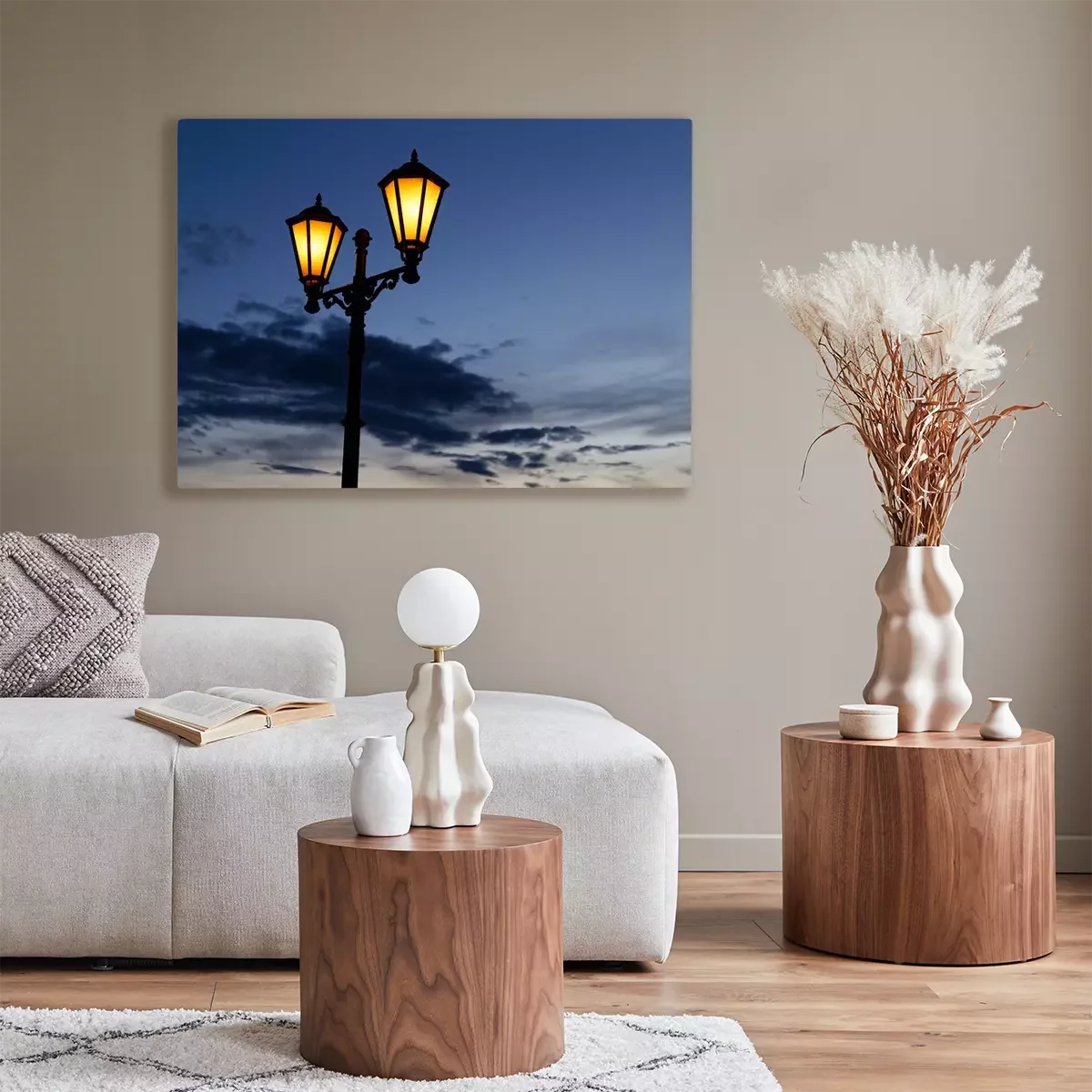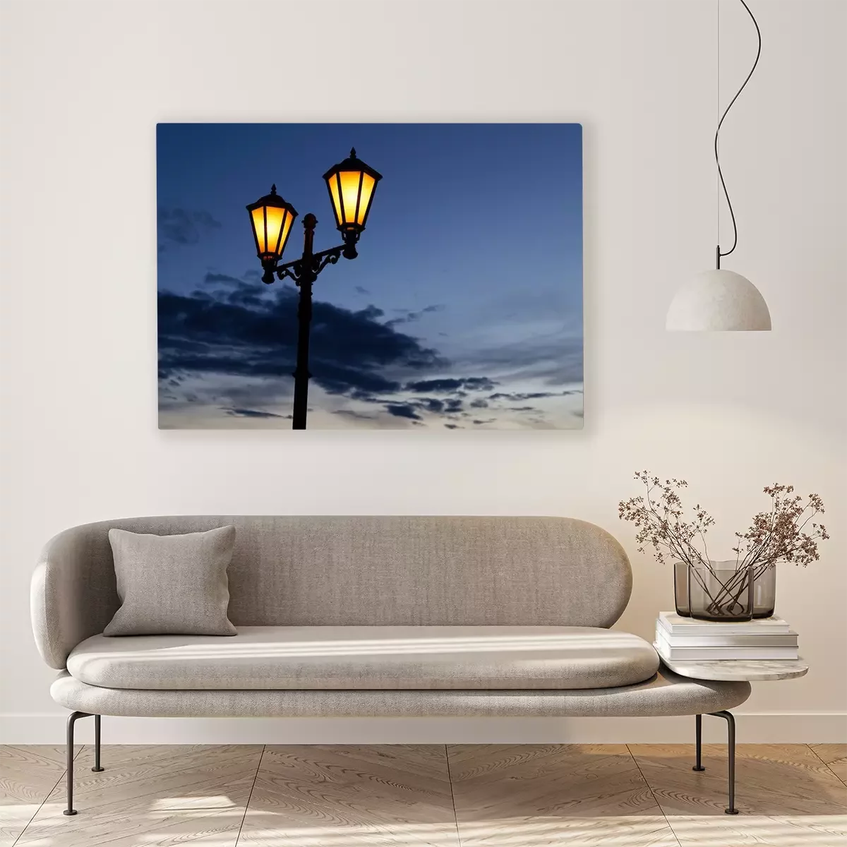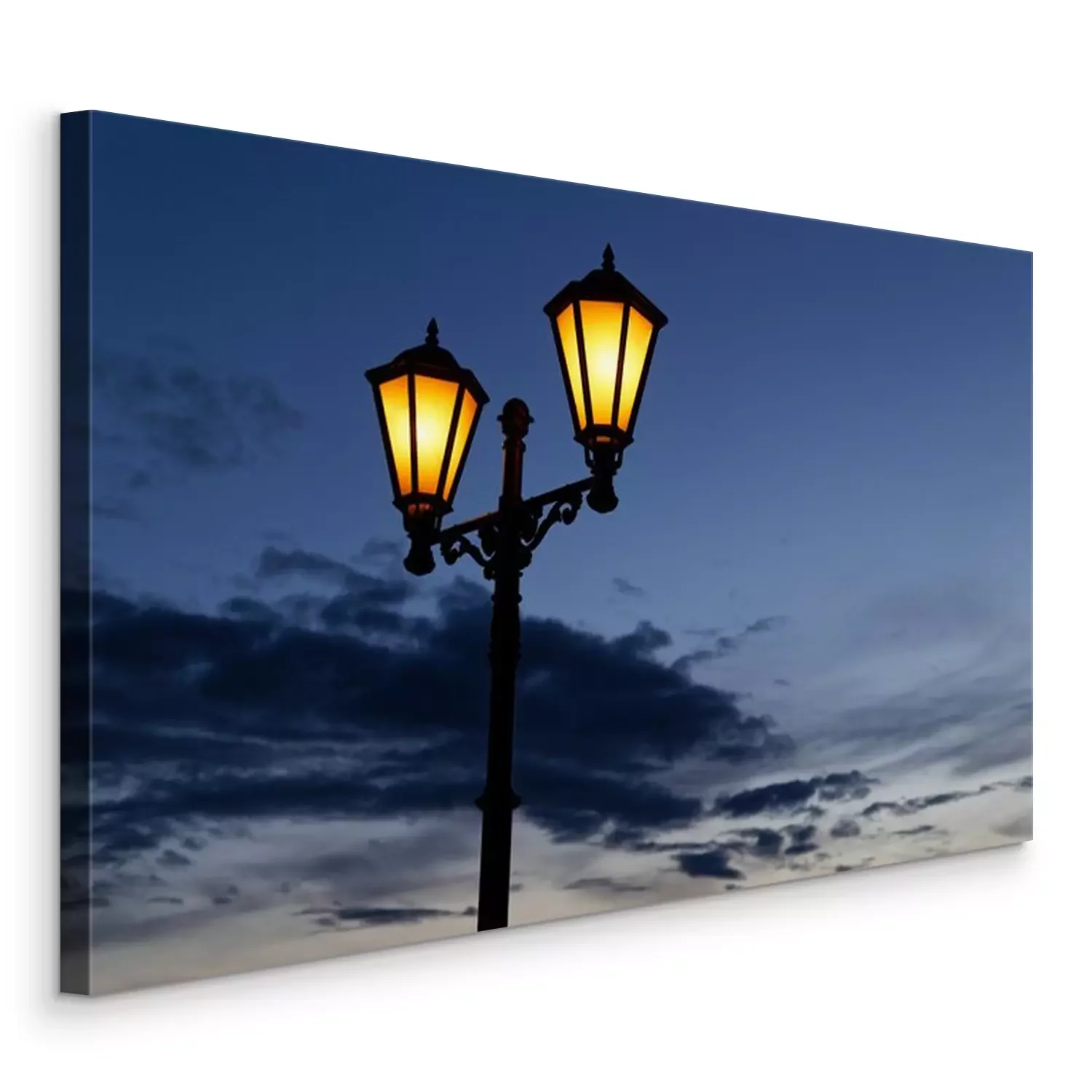 Canvas Uitstekende straatlantaarn met warme gele lichte en donkerblauwe nacht bewolkte hemel op achtergrond