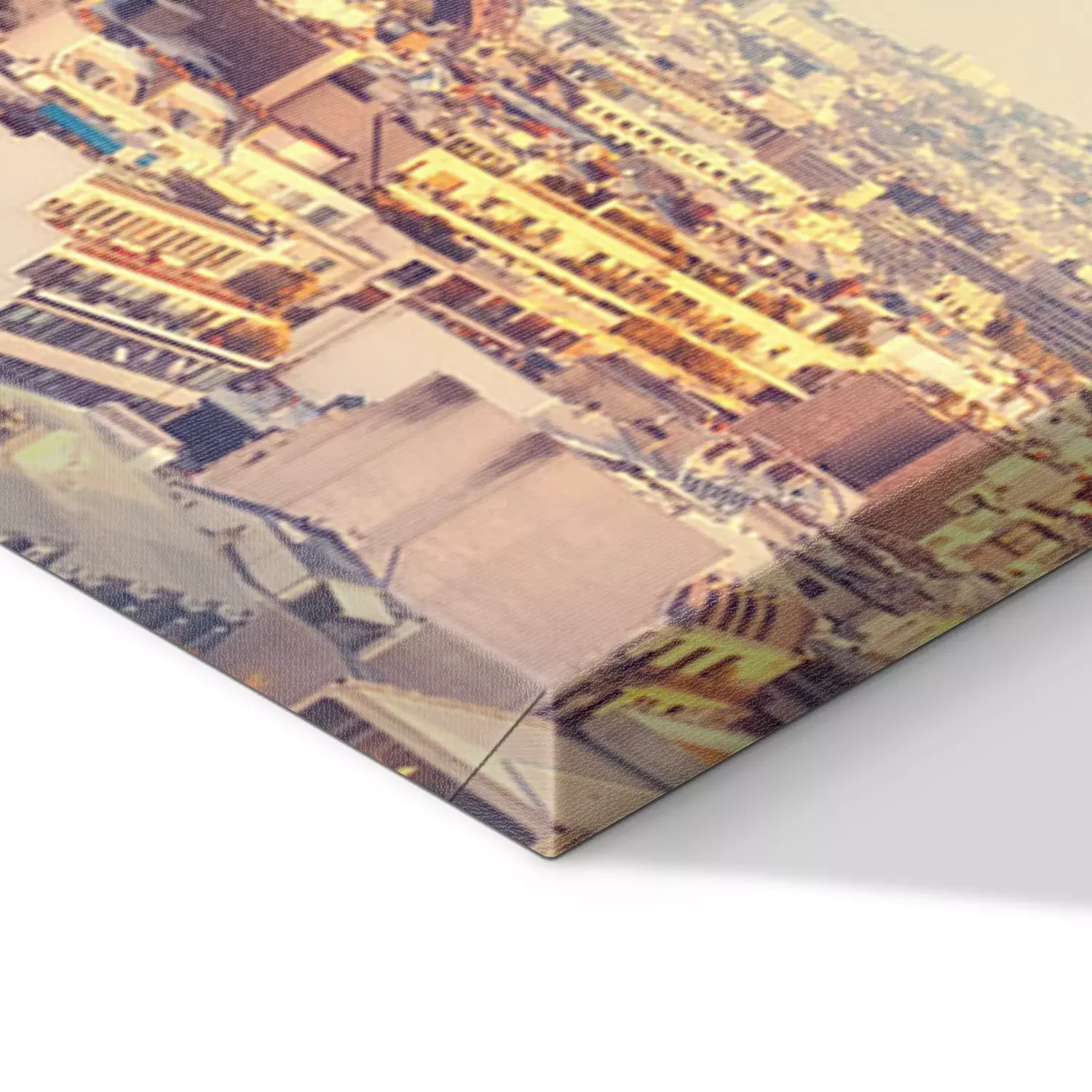 De print wordt aangebracht op hoogwaardig canvas dat op een schildersweefgetouw (spieraam) wordt gespannen. Omdat de print de zijranden bedekt, hoeft het ontwerp niet met een extra kader te worden omlijst. Wij raden ook composities aan die uit meerdere foto's bestaan en zo een coherente compositie vormen.