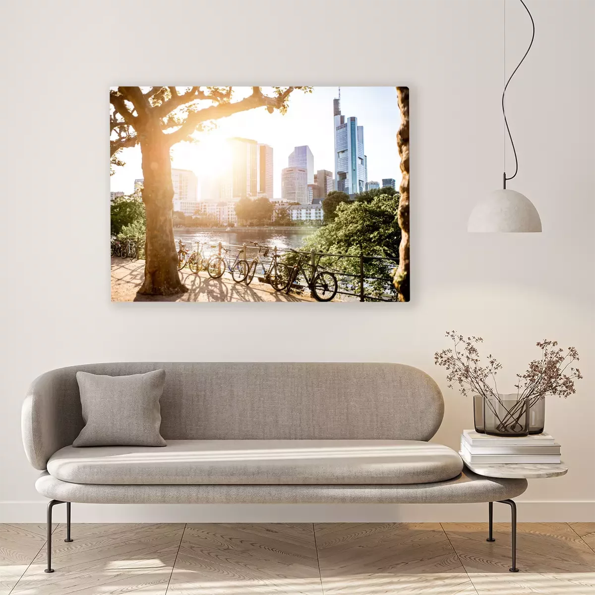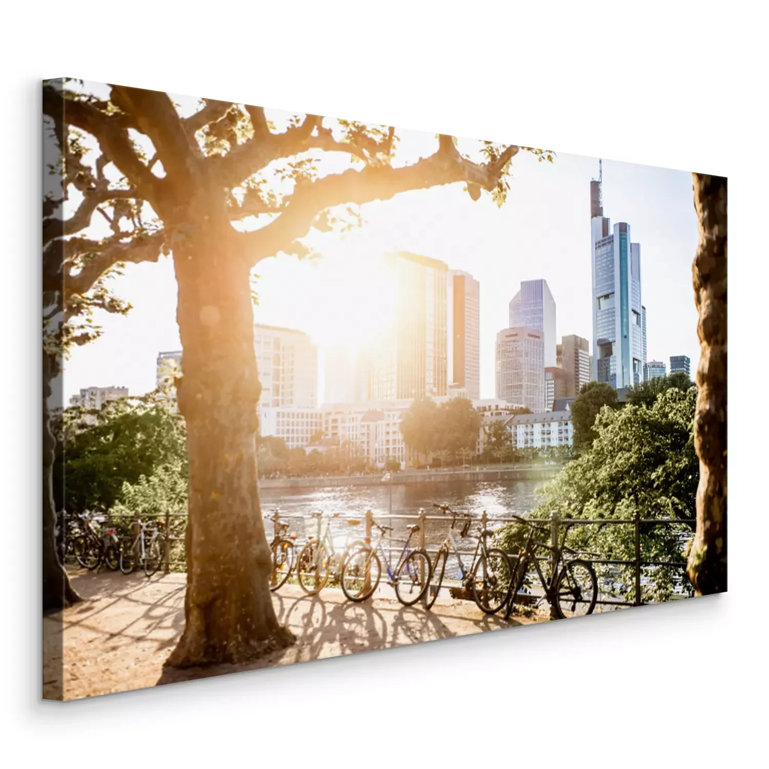 Canvas: Uitzicht op de financiële wijk met de belangrijkste rivier en park tijdens de zonsondergang in Frankfurt, Duitsland