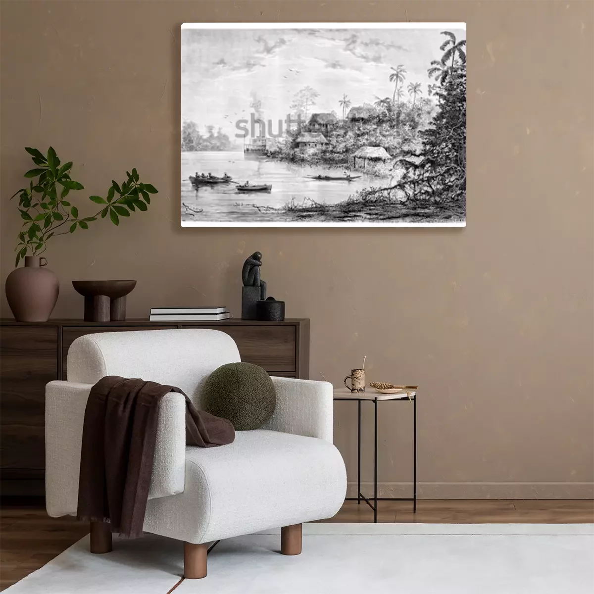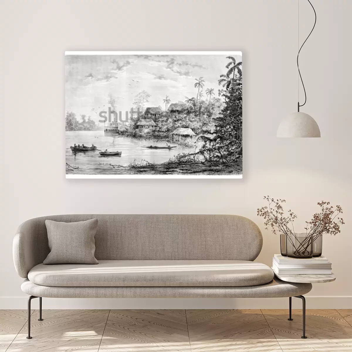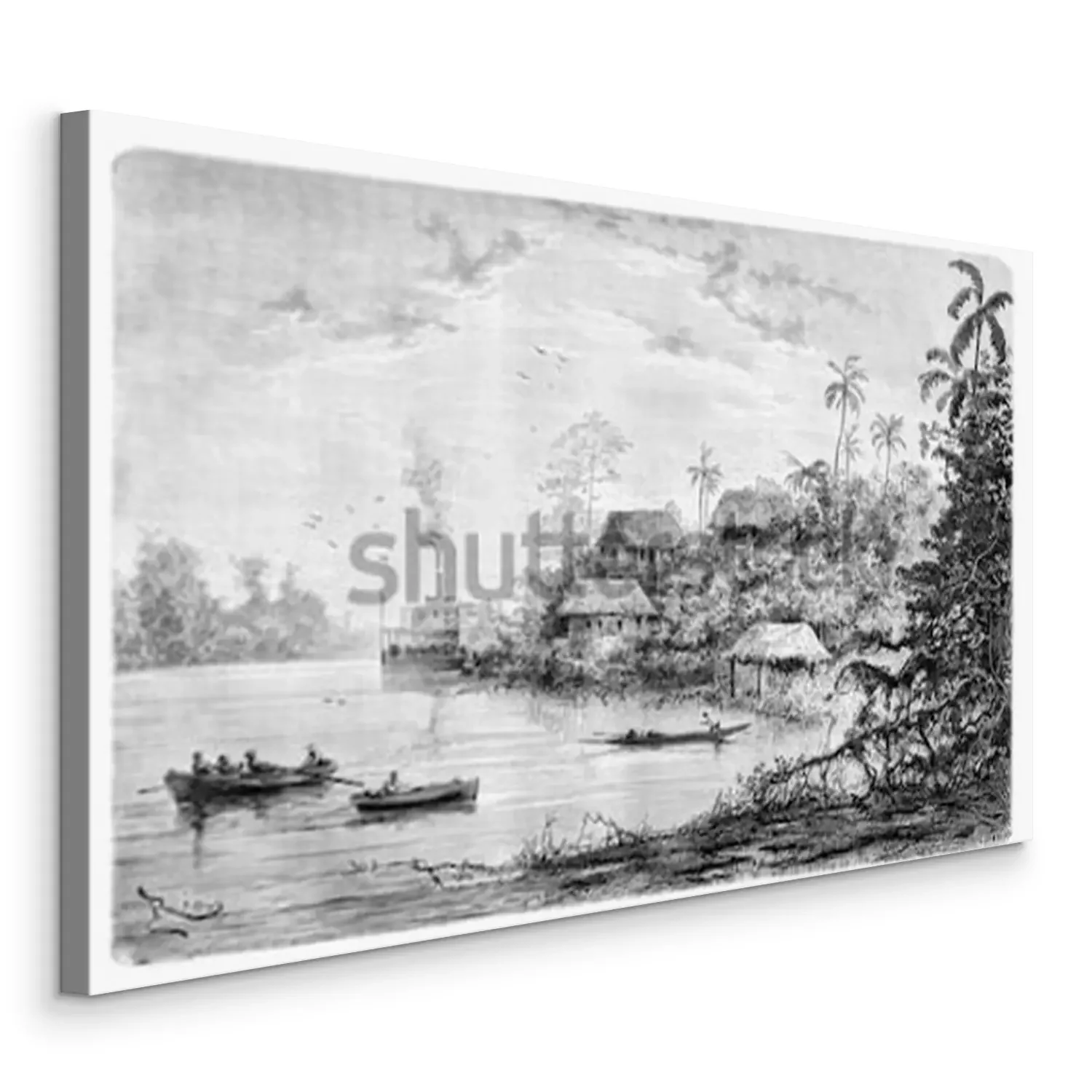 Canvas Uitzicht op de stad van Cuembi slow de Ica-rivier in Amazonas, Brazilië, tekening door Riou van een foto, vintage gegraveerde aarde illustratie. Le Tour du Monde, reisverlag, 1881