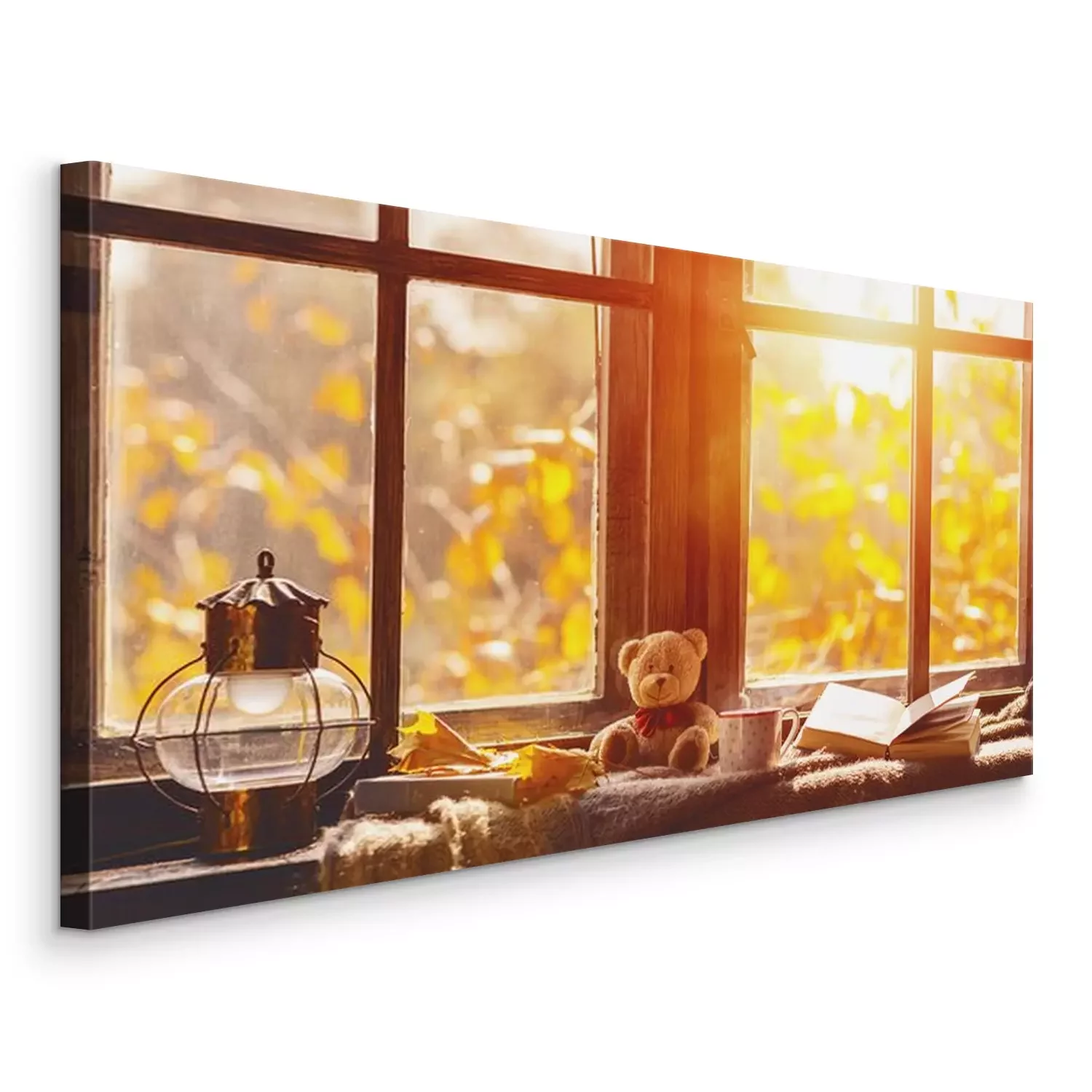 Canvas: vallen. gezellige venster met de herfstbladeren, boek, mok thee