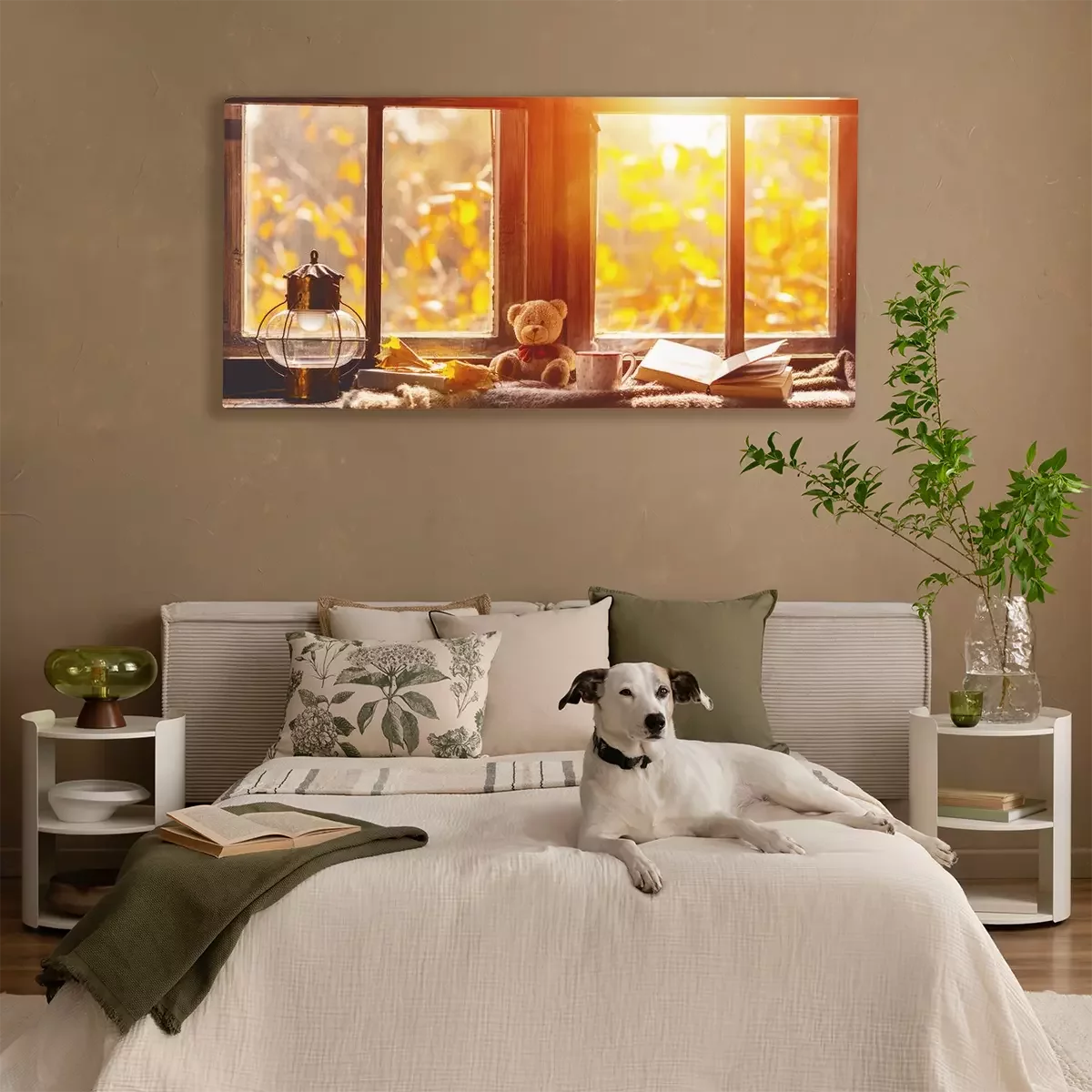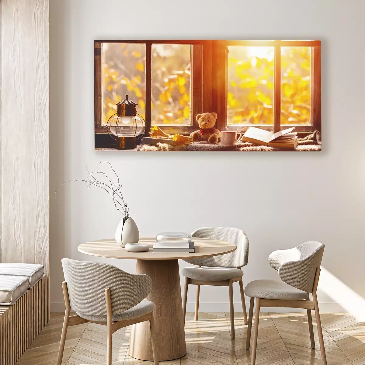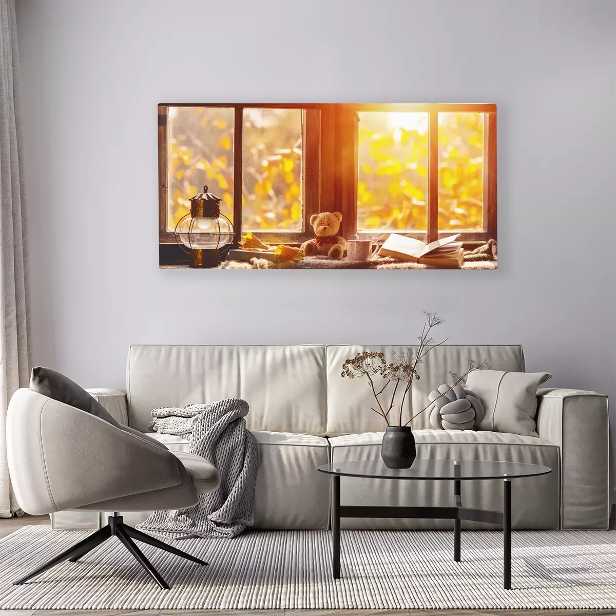 Canvas vallen. gezellige venster met de herfstbladeren, boek, mok thee