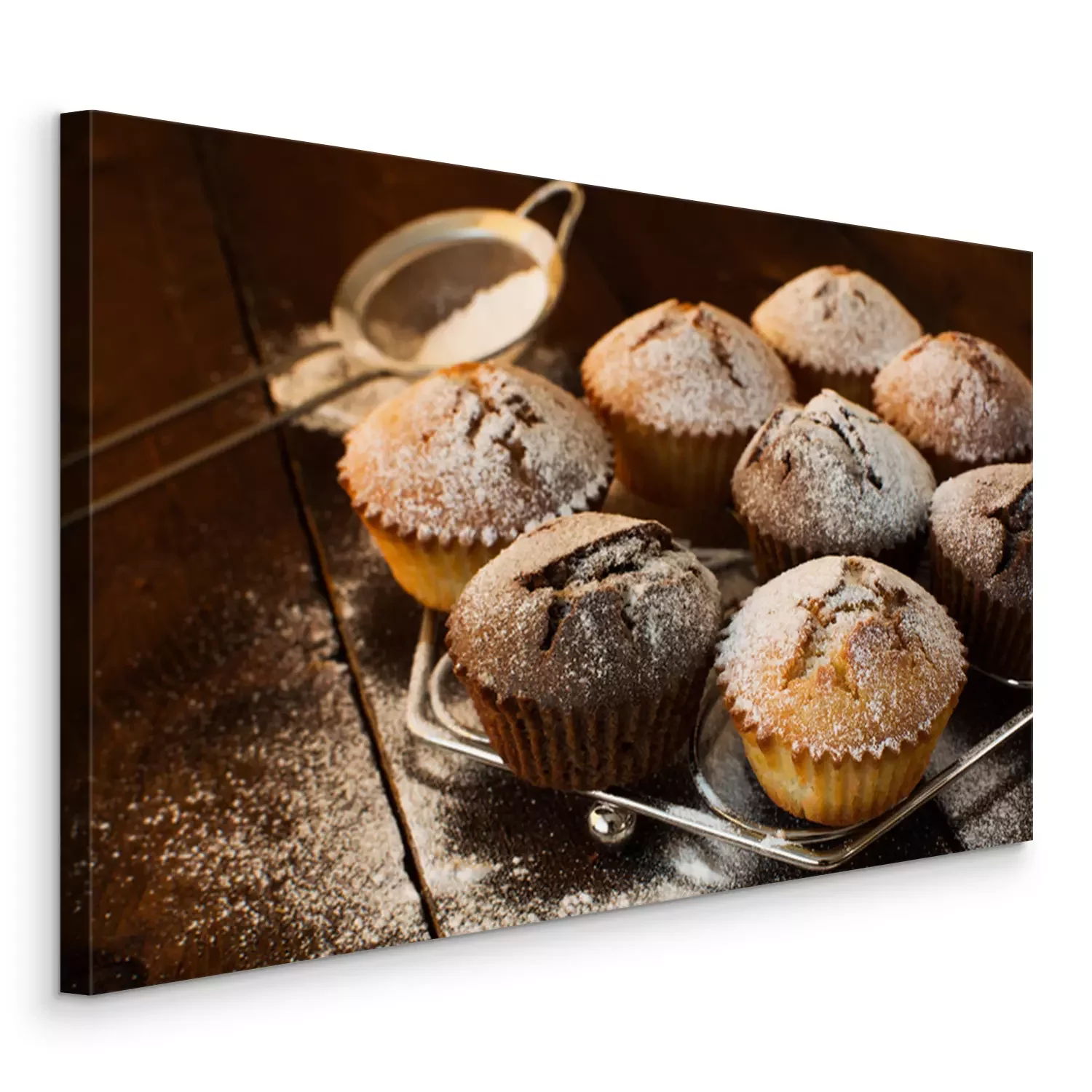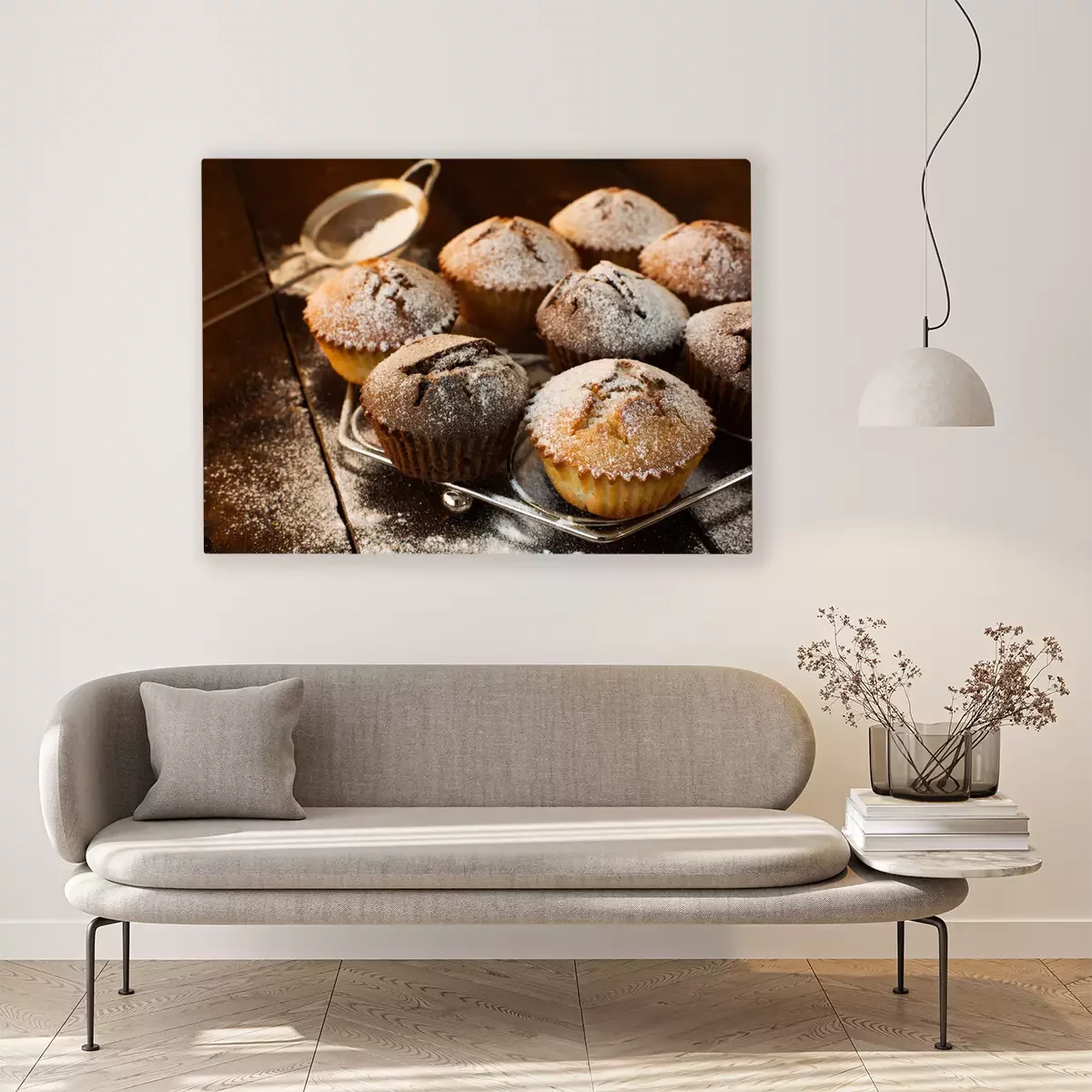 Canvas Vanille en chocolade muffins, basterdsuiker, zeef voor het bakken op een donkere houten achtergrond, selectieve aandacht