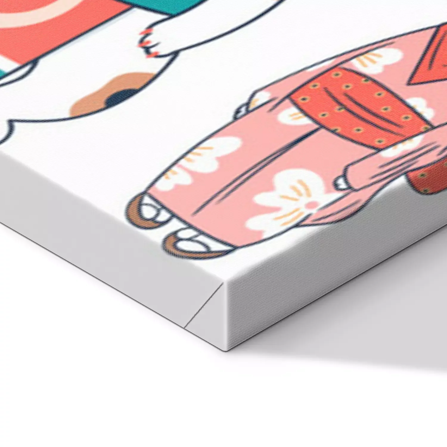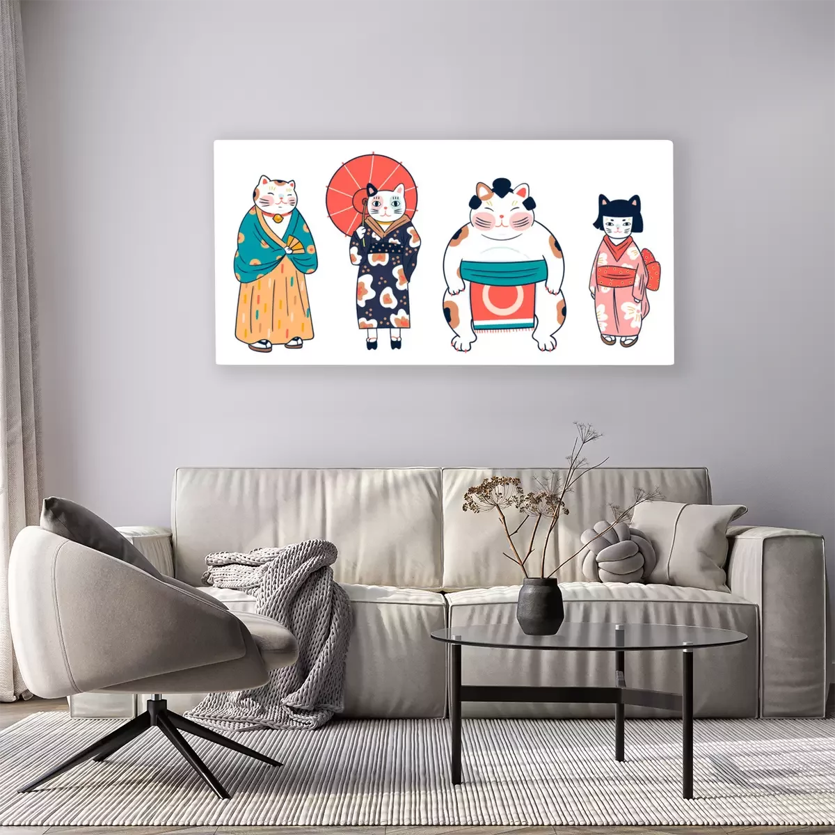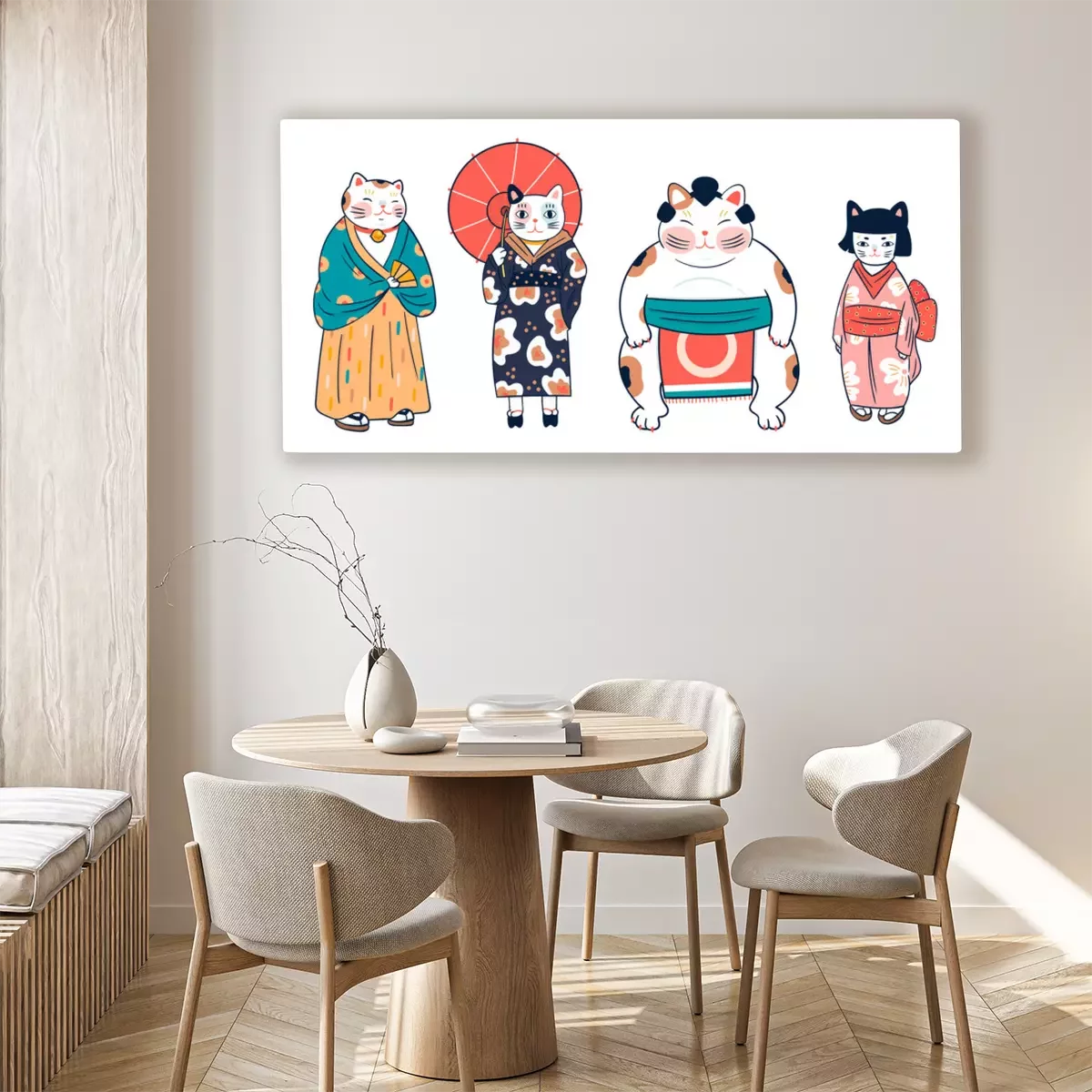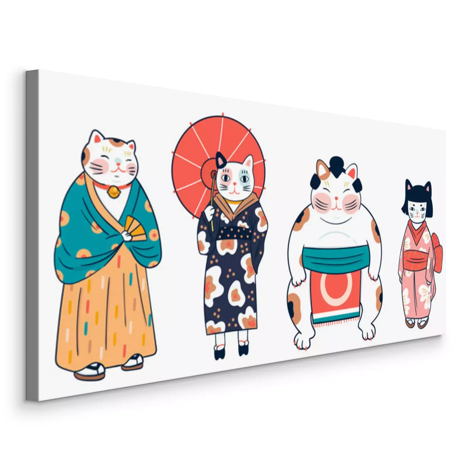Canvas: Various cats dressed in traditional japanese clothes. Anthropomorphic animals. Kawaii illustration. Hand drawn colored vector set. All elements are isolated